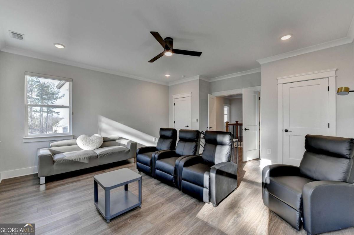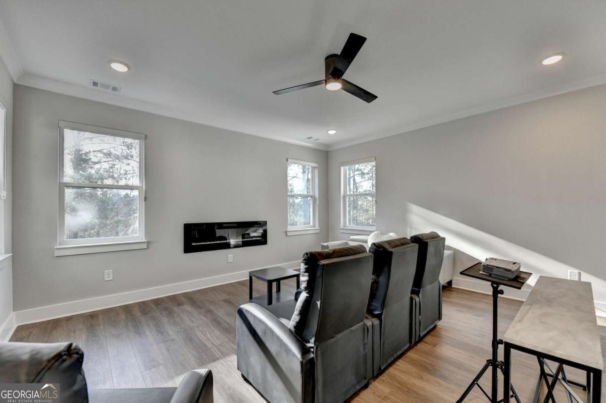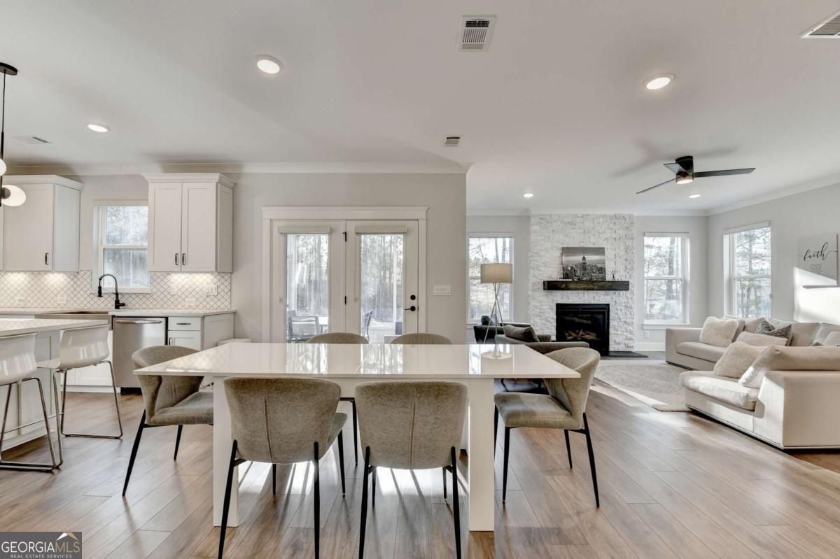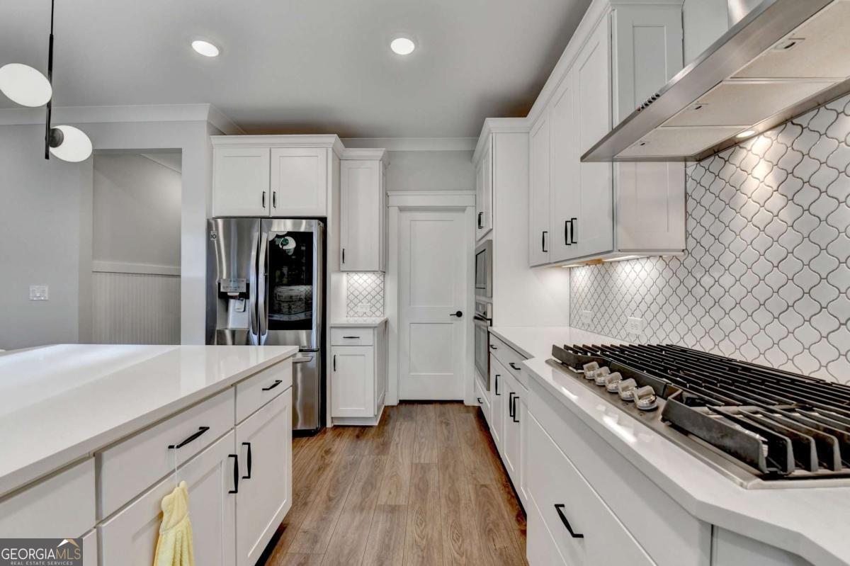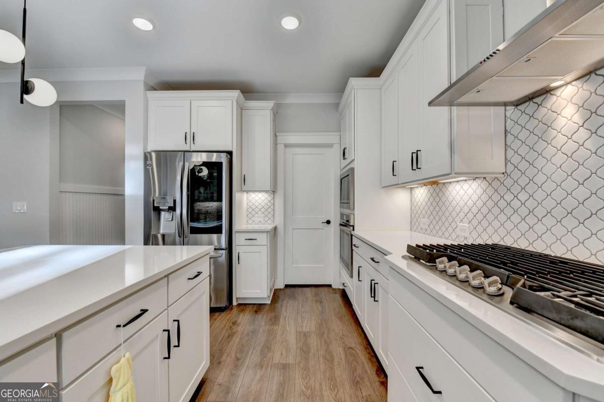 Located in the desirable Buford High School District, this stunning Eastwood Homes "Charleston" floor plan sits at the back of a quiet cul-de-sac and features elegant four-sided white painted brick. The three-car garage includes an upgraded epoxy floor and provides abundant storage and additional parking. A beautiful open foyer welcomes you with craftsman trim, cove crown molding throughout, and a tray ceiling. To the right, French doors lead to a spacious, light? filled office with four windows-perfect for working from home. The formal dining room easily accommodates a large table, making entertaining effortless. The expansive butler's pantry is a true showpiece with sparkling white quartz countertops, upgraded level?5 cabinetry, and now custom closet systems, offering the perfect bar, buffet, or display space. The open concept layout flows seamlessly from the gourmet kitchen to the breakfast area and family room, now enhanced with a beautiful stone fireplace, updated light fixtures, accent walls, and custom details throughout. The kitchen has the high-end finishes of the butler's pantry and includes a large walk-in pantry-also upgraded with a custom closet system throughout. A guest bedroom with a full bath is conveniently located on the main level. The screened in porch with tile flooring overlooks the trees and leads to a newly landscaped firepit area surrounded by decorative gravel-perfect for evenings of s'mores, barbecues, and year after year vegetable gardening. The private, wooded backyard spans both the back and side of the home, making this one of the best cul-de-sacs lots in the community. Upstairs, Total four bedrooms and two spacious bedrooms share a Jack and Jill bath, and the oversized bonus room has been transformed into a stylish media room featuring a modern linear fireplace. A private ensuite bedroom sits tucked away with its own full bath. The large laundry room includes cabinetry for added storage. The owner's suite, also positioned privately at the back of the home, features crown molding, a tray ceiling, two Walkin closets with custom systems, and a luxurious bath with separate vanities and an oversized Walkin tile shower. Smart Home features included. This home has been meticulously upgraded and offers exceptional indoor and outdoor living-truly so much more to offer.