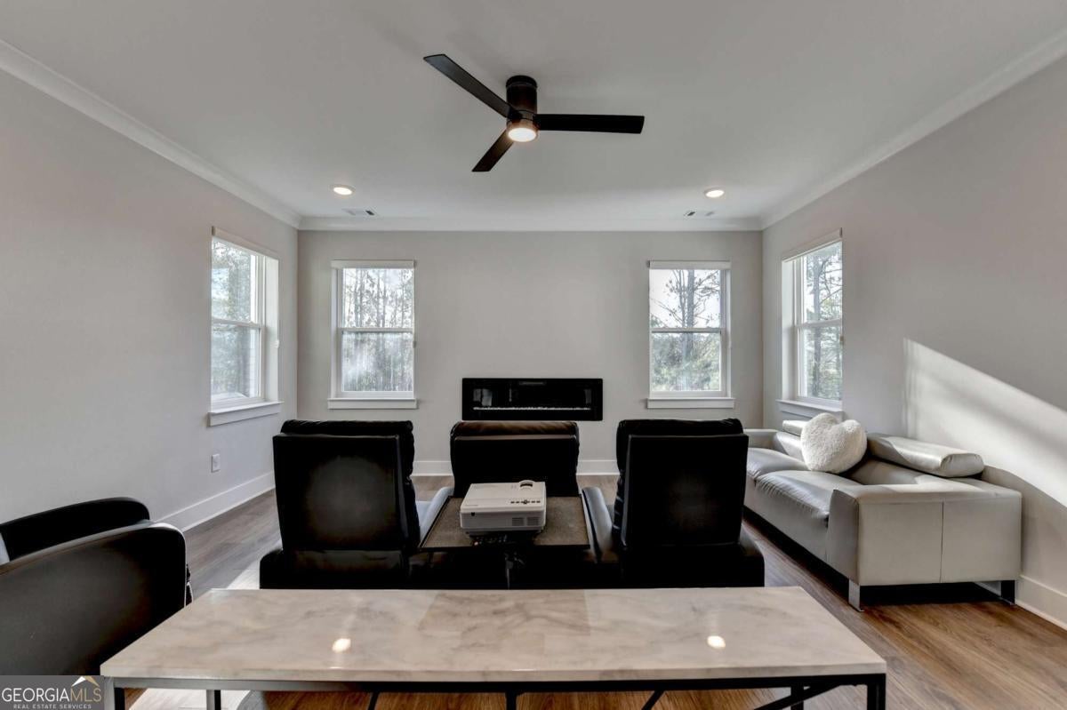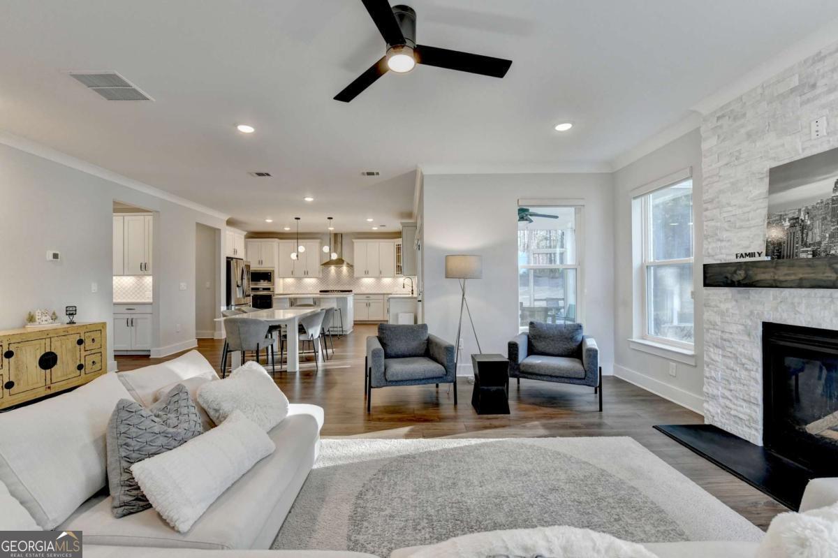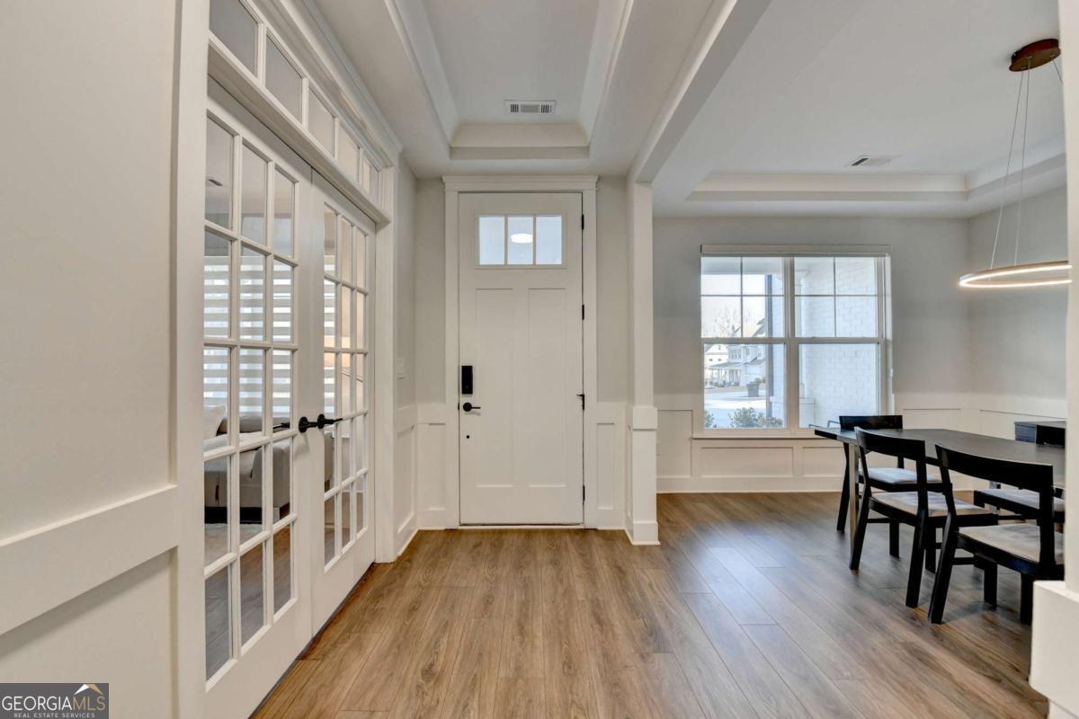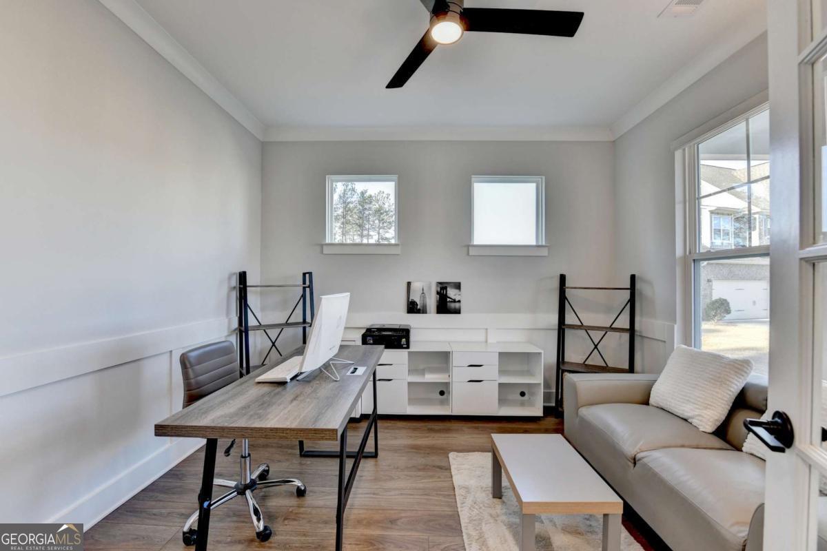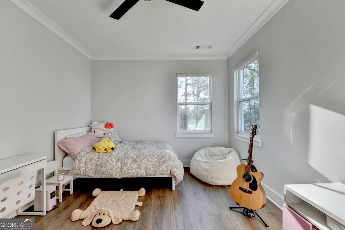 Located in the desirable Buford High School District, this stunning Eastwood Homes "Charleston" floor plan sits at the back of a quiet cul-de-sac and features elegant four-sided white painted brick. The three-car garage includes an upgraded epoxy floor and provides abundant storage and additional parking. A beautiful open foyer welcomes you with craftsman trim, cove crown molding throughout, and a tray ceiling. To the right, French doors lead to a spacious, light? filled office with four windows-perfect for working from home. The formal dining room easily accommodates a large table, making entertaining effortless. The expansive butler's pantry is a true showpiece with sparkling white quartz countertops, upgraded level?5 cabinetry, and now custom closet systems, offering the perfect bar, buffet, or display space. The open concept layout flows seamlessly from the gourmet kitchen to the breakfast area and family room, now enhanced with a beautiful stone fireplace, updated light fixtures, accent walls, and custom details throughout. The kitchen has the high-end finishes of the butler's pantry and includes a large walk-in pantry-also upgraded with a custom closet system throughout. A guest bedroom with a full bath is conveniently located on the main level. The screened in porch with tile flooring overlooks the trees and leads to a newly landscaped firepit area surrounded by decorative gravel-perfect for evenings of s'mores, barbecues, and year after year vegetable gardening. The private, wooded backyard spans both the back and side of the home, making this one of the best cul-de-sacs lots in the community. Upstairs, Total four bedrooms and two spacious bedrooms share a Jack and Jill bath, and the oversized bonus room has been transformed into a stylish media room featuring a modern linear fireplace. A private ensuite bedroom sits tucked away with its own full bath. The large laundry room includes cabinetry for added storage. The owner's suite, also positioned privately at the back of the home, features crown molding, a tray ceiling, two Walkin closets with custom systems, and a luxurious bath with separate vanities and an oversized Walkin tile shower. Smart Home features included. This home has been meticulously upgraded and offers exceptional indoor and outdoor living-truly so much more to offer.
