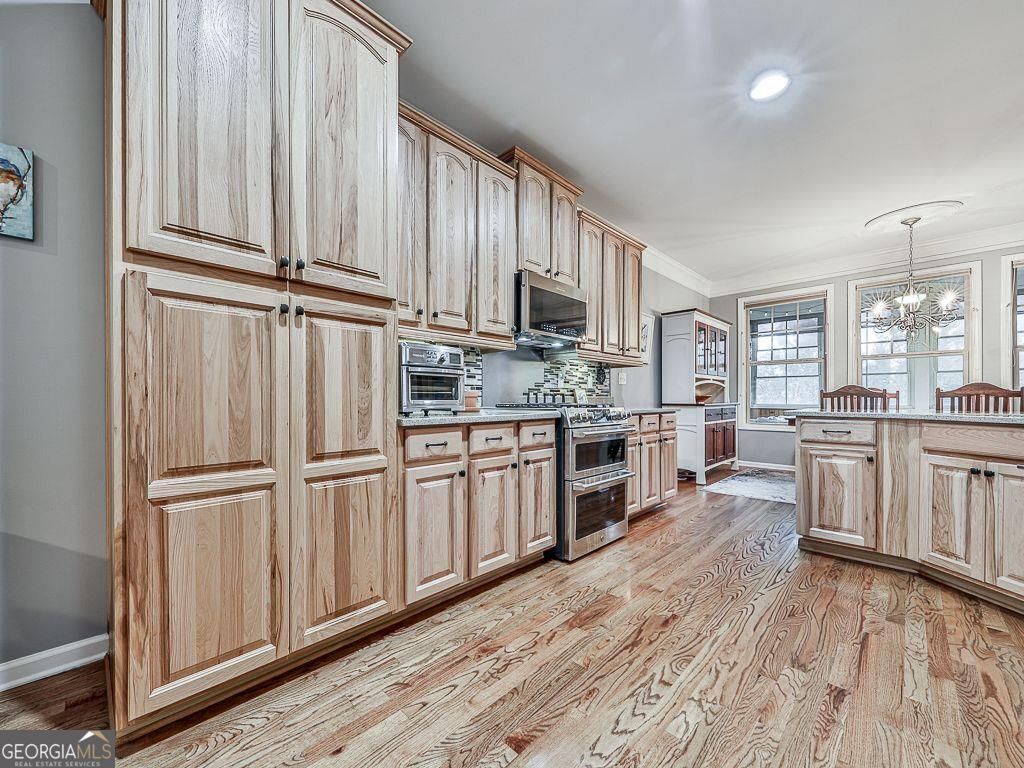 Wow! From the moment you pull up, you know it is going to be a good one!! With spring just around the corner, you will have a beautiful, blooming Japanese Maple gracing your front yard. A warm welcome awaits you on the front porch with stone pillars and extended entryway. A true three bedroom, three bath home with dedicated office is welcoming to the discerning buyer. Some features you may notice is the on site finished hardwoods, French doors, and extended crown molding. Cozy living room has a warm fireplace flanked by wood shelving for your many trinkets! Open concept dining allows for easy conversations in living room or kitchen. Speaking of kitchen, there is no lack of storage! Beautiful Hickory cabinets will house all of your cooking and baking needs. Kitchen features include Quartz countertops, black sink, and a handy six burner gas range with double oven. Off of kitchen is space for breakfast room, keeping room, or a great reading nook! Primary bedroom is oversized and includes tray ceiling and two separate closets with built-ins. Grand bathroom has two separate vanities, jetted tub, and separate shower with bench and cubby, and frameless glass. Before heading to finished basement, could not forget to mention the laundry/mud room with undermount lighting and sink with vanity! Giant finished basement can comfortably accommodate all your friends and family with durable luxury vinyl plank flooring. Large bedroom with walk in closet and full bathroom is just one of the many features in this space. Segmented rooms could easily house another living room, along with craft room, exercise room or game room. Don't worry, there is still ample areas for storage needs, including an area used as a workshop with darling wood barn door! I believe, the area that will be your favorite and most used, will be the all season heated and cooled back porch which overlooks deck with Trex flooring. Need more outdoor space? Just off the basement double doors, you will find a generous patio with dry decking to keep you shaded and dry from the elements. This area give you easy access to private, flat backyard. Soleil Laurel Canyon has so much to offer, including 24 hour manned gate, clubhouse with library, billiards, indoor-outdoor pools/sauna, garden plots and greenhouse, tennis and pickleball, copious amounts of clubs will always keep you social and engaged. Truly, a remarkable lifestyle close to shopping, restaurants, and state of the art medical facilities!