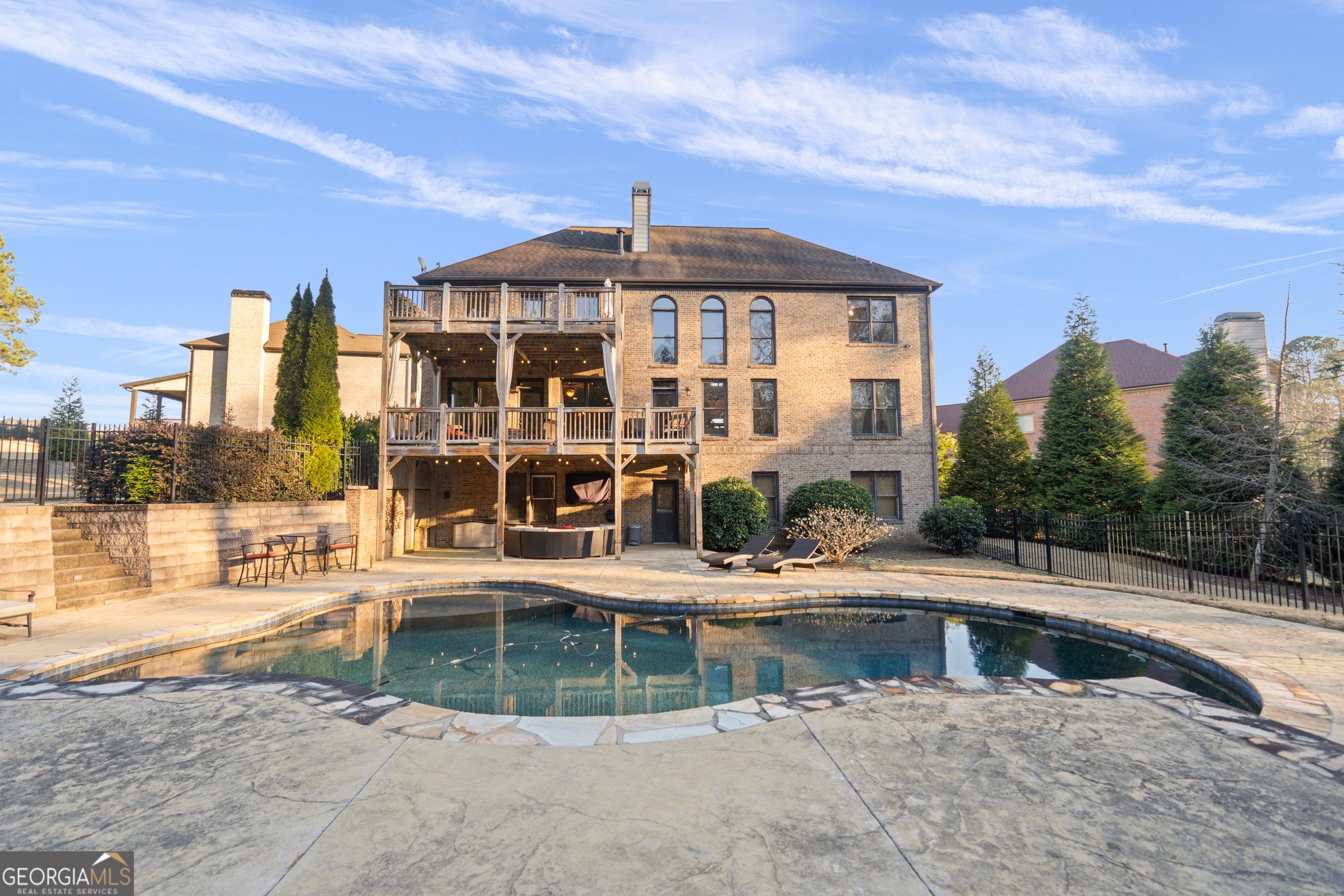 Set up your appointment now! Don't miss this extraordinary opportunity to own a home that defines elegance, comfort, and exclusivity. Nestled on a private, level lot, this residence offers the perfect blend of sophistication, comfort, and resort-style living. The striking curb appeal begins with an inviting covered front porch that leads into a grand two-story foyer, where rich hardwood floors, elegant moldings, and timeless architectural details set the tone. A private library/office and open formal dining room create the perfect balance for work and entertaining. The light-filled living room boasts a dramatic wall of windows and a double-sided fireplace, seamlessly flowing into the chef's kitchen. Designed for both style and function, the kitchen features a massive center island, stone counters, high-end appliances, a keeping room, and direct access to the deck-ideal for gatherings. A full guest suite completes the main level. Upstairs, the Owner's retreat is a true sanctuary, showcasing an oversized bedroom with sitting area, spa-inspired bath with dual vanities, tile shower, jetted tub, and an expansive walk-in closet. Secondary bedrooms impress with private bath access, soaring ceilings, and generous closet space. The unfinished full basement provides limitless potential for customization, while the three-car garage ensures ample space for vehicles and storage. Step outside to your private oasis: a gunite pool with a tranquil water feature sets the stage for elegant outdoor living and entertaining. Whether lounging poolside, dining al fresco, or hosting unforgettable gatherings, this backyard was designed for luxury living.Seller to give concessions for 1% rate buydown with preferred lender!
