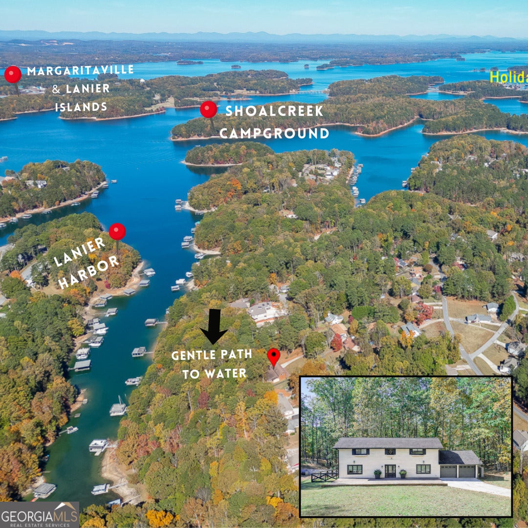 Discover this rare Lake Lanier gem offering a hard-to-find gentle walk to the water! Nestled in the desirable Valley Hi community, this beautifully maintained Craftsman-style home offers nearly 4,000 sq. ft. of elegant living space designed for comfort and entertaining. Inside, you'll find beamed and vaulted ceilings, hardwood and tile floors, and abundant natural light throughout. The chef's kitchen is a true showpiece - featuring stone countertops, a large island, breakfast bar, two sinks, and a built-in wine cooler, perfect for hosting and everyday living. Enjoy gatherings in the oversized formal dining room, or relax in the formal living room, great room, or sunroom/flex space, offering multiple areas for entertainment and leisure. The spacious primary suite includes a sitting area, his-and-hers closets, and a spa-inspired bath with double vanities, soaking tub, and separate shower. Step outside to enjoy the deck and front porch, and take an easy gentle walk to your private Lake Lanier frontage - a rare find! Located within top-rated Gwinnett County schools (White Oak Elementary, Lanier Middle, and Lanier High) and close to shopping, dining, and parks. Additional features include a two-car garage, extra storage, and a private, level lot perfect for outdoor enjoyment.
