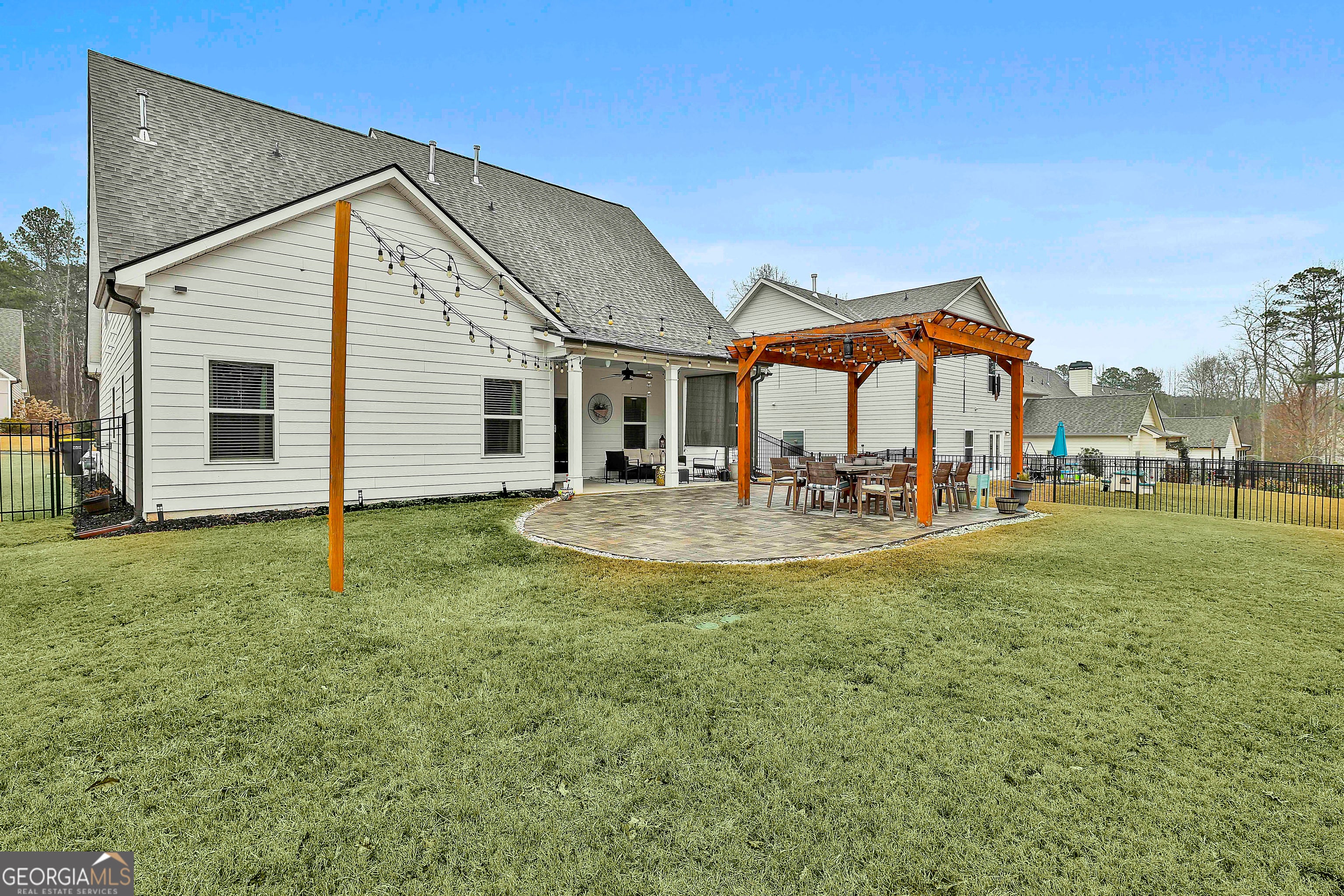 Welcome to this exceptional home in the heart of downtown Senoia, perfectly situated along the golf cart trail and just steps from charming shops and acclaimed local restaurants. This stunning residence offers five spacious bedrooms and 3.5 bathrooms, blending luxury, comfort. Recent upgrades include a new sprinkler system, new fencing, and upgraded appliances. Featuring beautiful upgrades throughout the home. A beautifully appointed kitchen featuring luxurious marble countertops and ample space for gathering. Hardwood floors extend throughout the main level, enhancing the warmth and elegance of the family room, dining area, and kitchen. The main-level owner's suite is a true retreat, complete with a custom-built walk-in closet. A flexible guest bedroom or home office is conveniently located near the foyer. Upstairs, you'll find three generously sized bedrooms, each offering its own walk-in closet. Outdoors, enjoy one of the largest backyards in the neighborhood, professionally landscaped and designed for entertaining. The backyard oasis features a stone-laid patio, custom cedar pergola, and custom lighting that sets the perfect mood day or night. This space ideal for relaxing or hosting unforgettable gatherings. This home offers a rare combination of luxury finishes, thoughtful upgrades, and an unbeatable downtown location, making it the ultimate Senoia retreat.