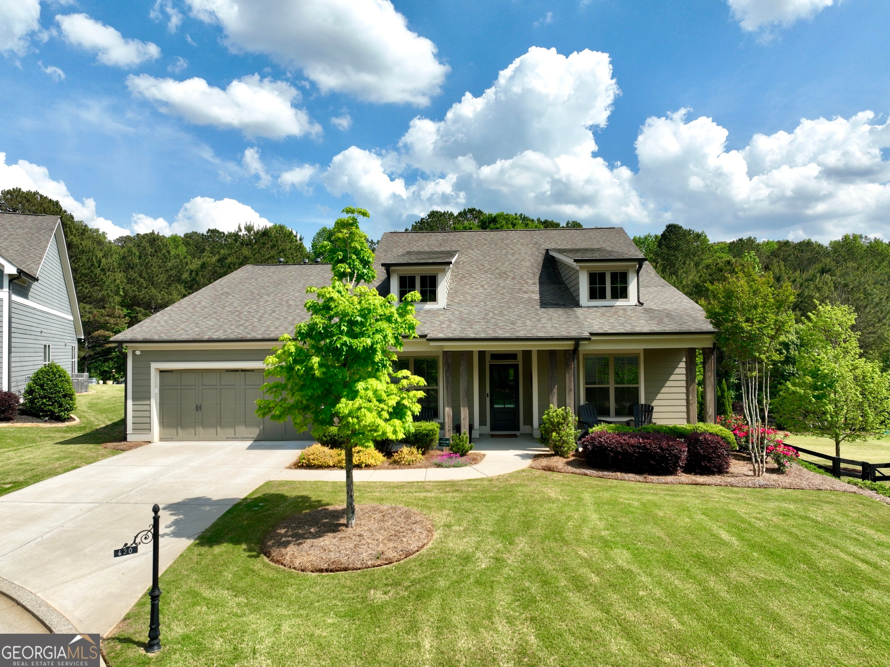 Welcome to maintenance-free living in the sought-after Larkspur Active Adult Community, a gated enclave designed for connection, convenience, and resort style enjoyment. This beautifully maintained Craftsman home, built by Edward Andrews Homes in 2017, features the desirable Ashland Phase II floor plan and is tucked away on a quiet cul-de-sac. Residents enjoy an exceptional array of amenities, including a resort-style swimming pool, pickleball and bocce ball courts, walking trails, a community garden, and the charming Ranch House clubhouse, home to social gatherings, concerts, wine clubs that foster a true sense of community. The HOA provides maintenance free living, covering lawn care, shrub trimming, seasonal fresh pine straw (spring and fall), and weed control, allowing you to enjoy your home without the upkeep. Ideally located near Vickery Village, Halcyon, Avalon, the Big Creek Greenway, and Echelon Golf Club, this home offers both tranquility and accessibility. Enjoy the benefit of Cherokee County taxes with an Alpharetta mailing address. This is an opportunity to embrace an active, social lifestyle in a beautifully cared for home within one of the area's most desirable active adult communities. Gate entrance is closed 24/7. Gate code will be provided at time of home tour.