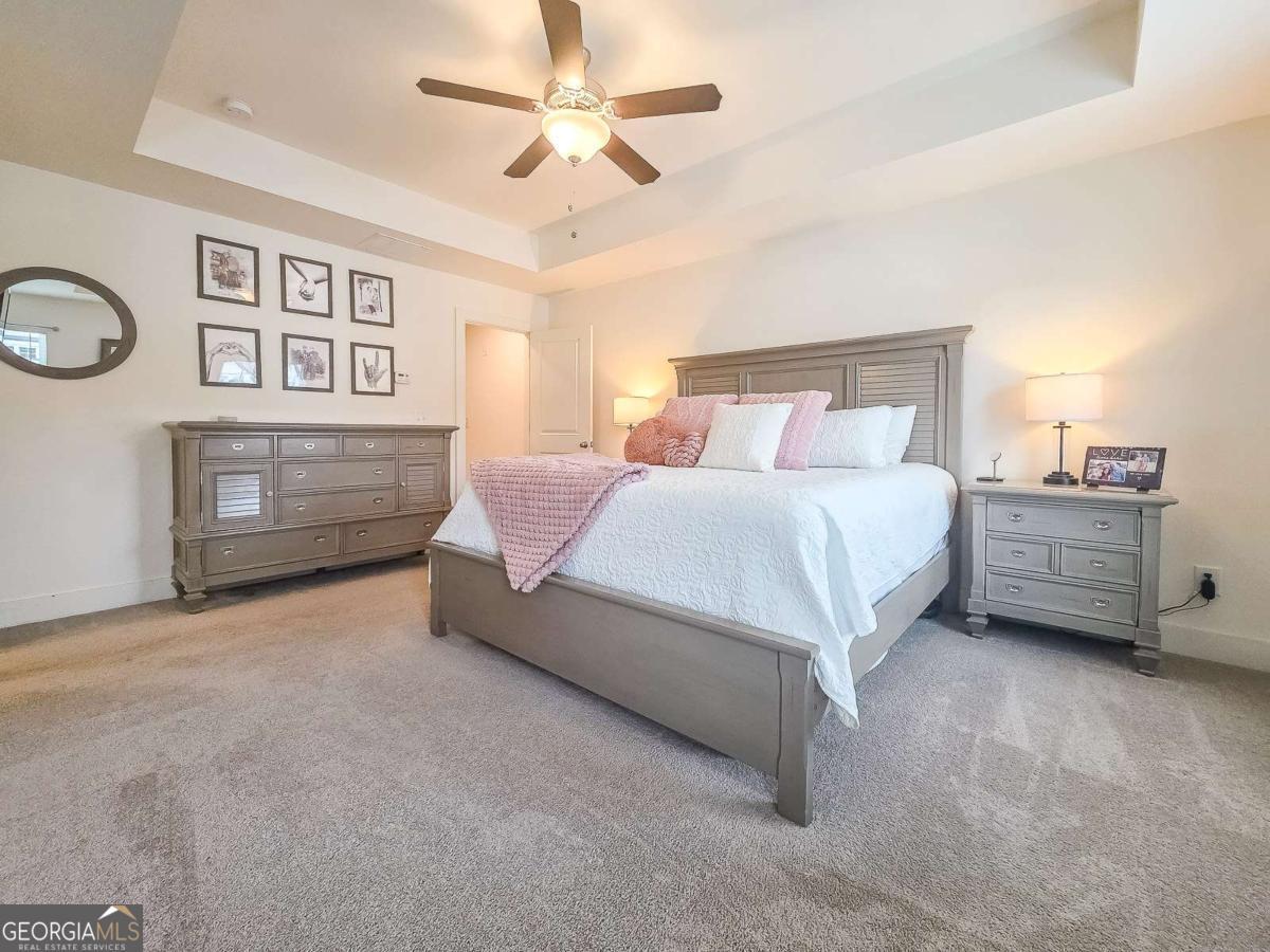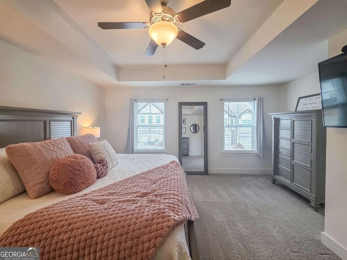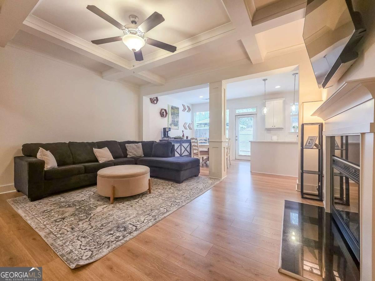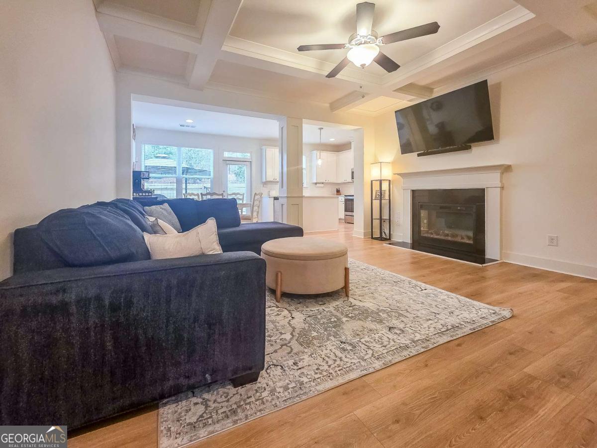 Welcome to this beautiful, like-new three-bedroom, two-and-one-half-bathroom townhome in the gated Townes of Auburn community! This bright and open floor plan matches functionality with cozy living! The main level features a kitchen and living area, a powder bathroom, two spacious closets, and access to the two-car garage and the fenced-in backyard. This is the ideal backyard to sit out and relax with privacy maximized by trees and natural landscaping outside of the fenced area. The kitchen features white cabinetry with ample storage space, a center island, quartz countertops, and stainless steel appliances. The adjacent family room is open to the kitchen and is centered around a gas fireplace and has a coffered ceiling. Upstairs, you'll find a wonderful loft space with LVP flooring, which makes for a great workspace, recreation area, or second den. Additionally, there are two generously sized secondary bedrooms that share a full bathroom, and a wonderfully spacious primary suite with a sitting area and a walk-in closet. The primary bathroom has an oversized shower, a soaking tub, and a double vanity with quartz countertops. The laundry room is also located upstairs and offers storage space as well. When it is time to relax and enjoy the outdoors, the community amenities have something for everyone, including a wonderful playground area, pool, pickleball and tennis courts, and a wonderful trail. With easy access to I-85, Highway 316, shopping, dining, and excellent schools, this home offers convenience, comfort, and low-maintenance living!