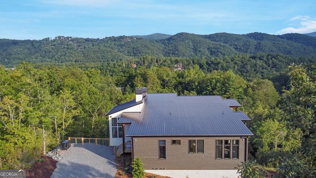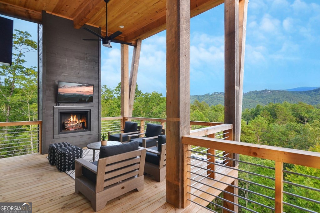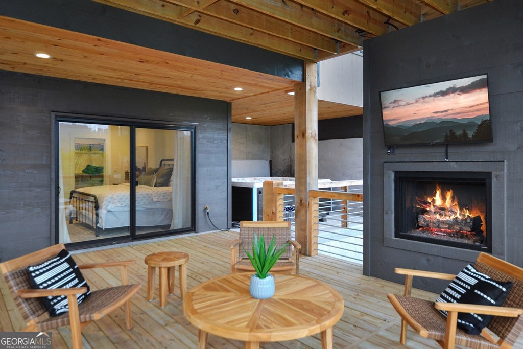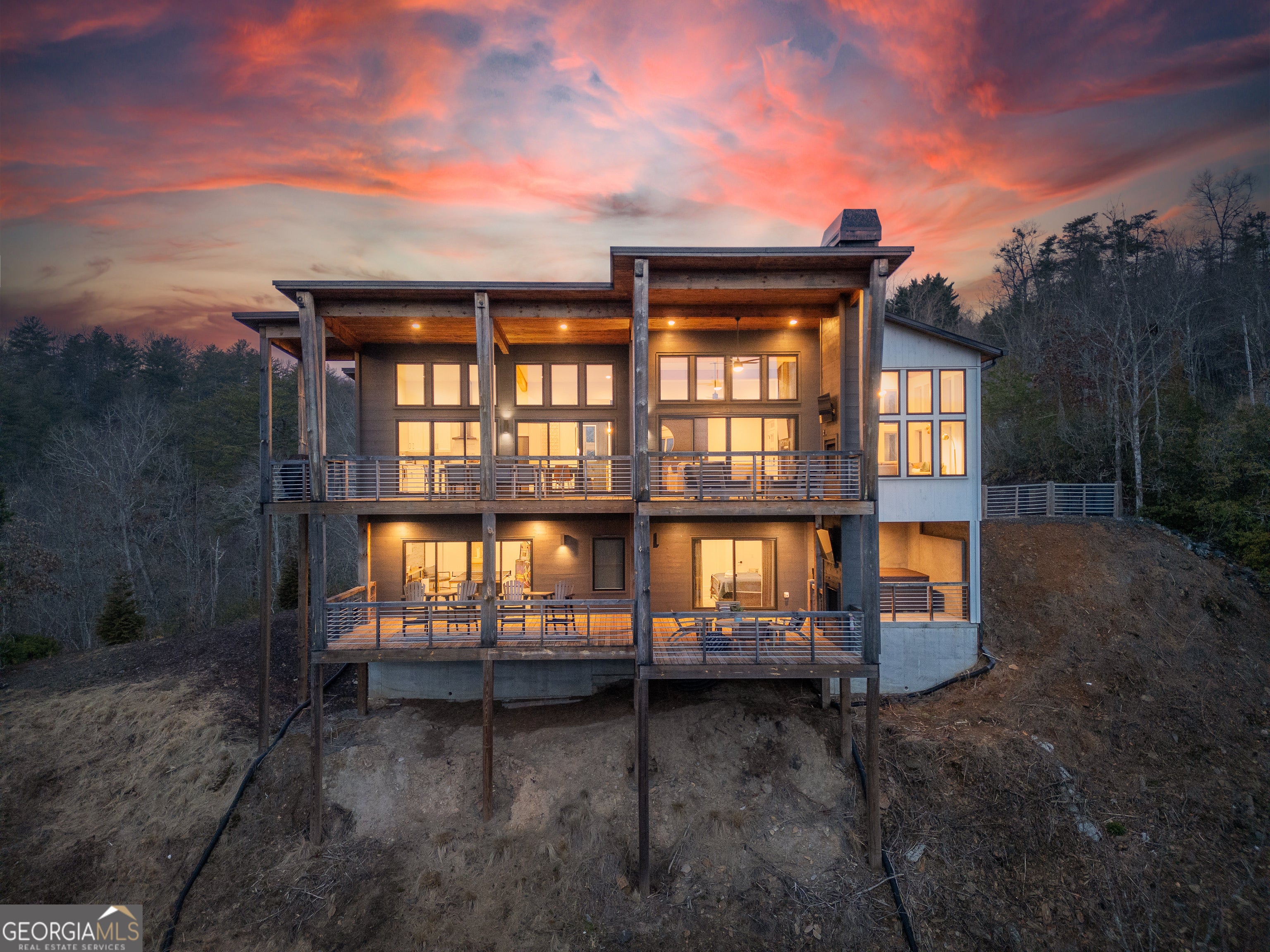 Mountain modern luxury with breathtaking year-round panoramic Blue Ridge Mountain views! Located in the highly sought-after Mountain Tops community, just minutes from historic Downtown Blue Ridge, this custom-designed home offers paved road access, stunning design, and an elevated indoor-outdoor lifestyle. Walls of glass flood the interior with natural light and frame the expansive views, while the open-concept great room is anchored by a dramatic double-sided electric fireplace. The sleek modern kitchen features custom cabinetry, floating shelves, and designer finishes, complemented by custom tile work throughout. The main-level primary suite provides comfort and convenience, while the thoughtfully designed layout allows for flexible living and entertaining. The fully finished terrace level expands the home with a game and entertainment area, bar space, and additional sleeping flexibility. While offering three full bedrooms and three full baths, two additional flex rooms are currently configured to create five functional sleeping areas. Outdoor living is a true highlight, featuring two levels of covered decks, each with its own outdoor fireplace, stunning exterior angled wood beam supports, and a perfectly positioned hot tub overlooking the mountains. With multiple gathering spaces, extensive covered deck areas, and a seamless connection to the views, this home is ideal as a refined full-time residence, luxury second home, or investment property. Offered fully furnished, turn key.