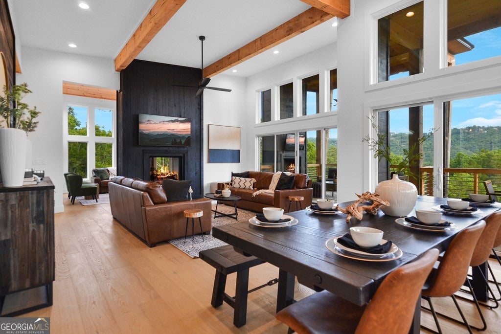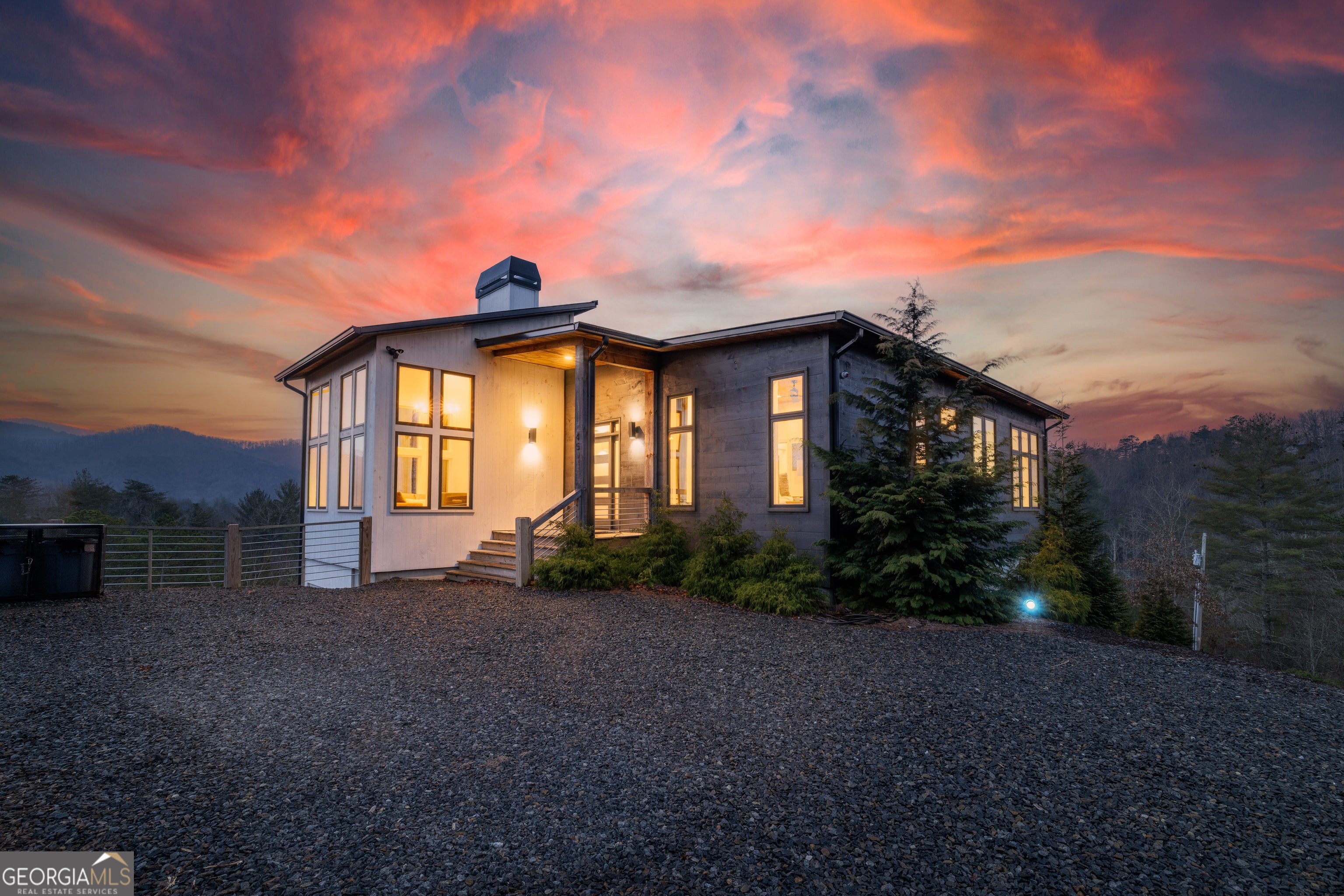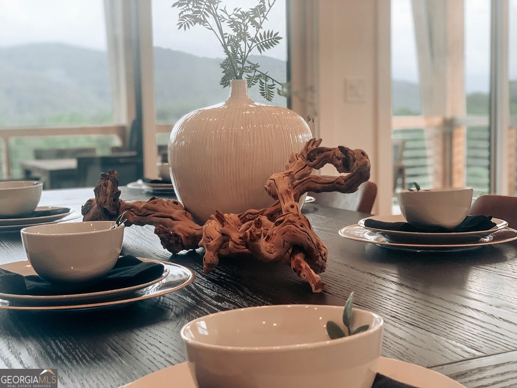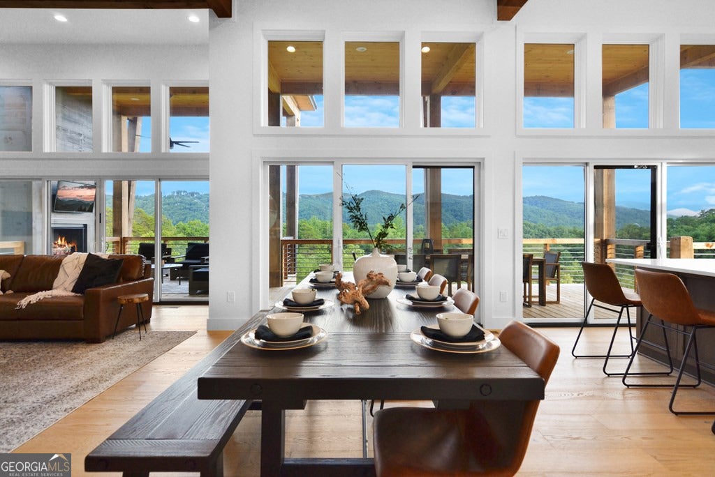 Mountain modern luxury with breathtaking year-round panoramic Blue Ridge Mountain views! Located in the highly sought-after Mountain Tops community, just minutes from historic Downtown Blue Ridge, this custom-designed home offers paved road access, stunning design, and an elevated indoor-outdoor lifestyle. Walls of glass flood the interior with natural light and frame the expansive views, while the open-concept great room is anchored by a dramatic double-sided electric fireplace. The sleek modern kitchen features custom cabinetry, floating shelves, and designer finishes, complemented by custom tile work throughout. The main-level primary suite provides comfort and convenience, while the thoughtfully designed layout allows for flexible living and entertaining. The fully finished terrace level expands the home with a game and entertainment area, bar space, and additional sleeping flexibility. While offering three full bedrooms and three full baths, two additional flex rooms are currently configured to create five functional sleeping areas. Outdoor living is a true highlight, featuring two levels of covered decks, each with its own outdoor fireplace, stunning exterior angled wood beam supports, and a perfectly positioned hot tub overlooking the mountains. With multiple gathering spaces, extensive covered deck areas, and a seamless connection to the views, this home is ideal as a refined full-time residence, luxury second home, or investment property. Offered fully furnished, turn key.