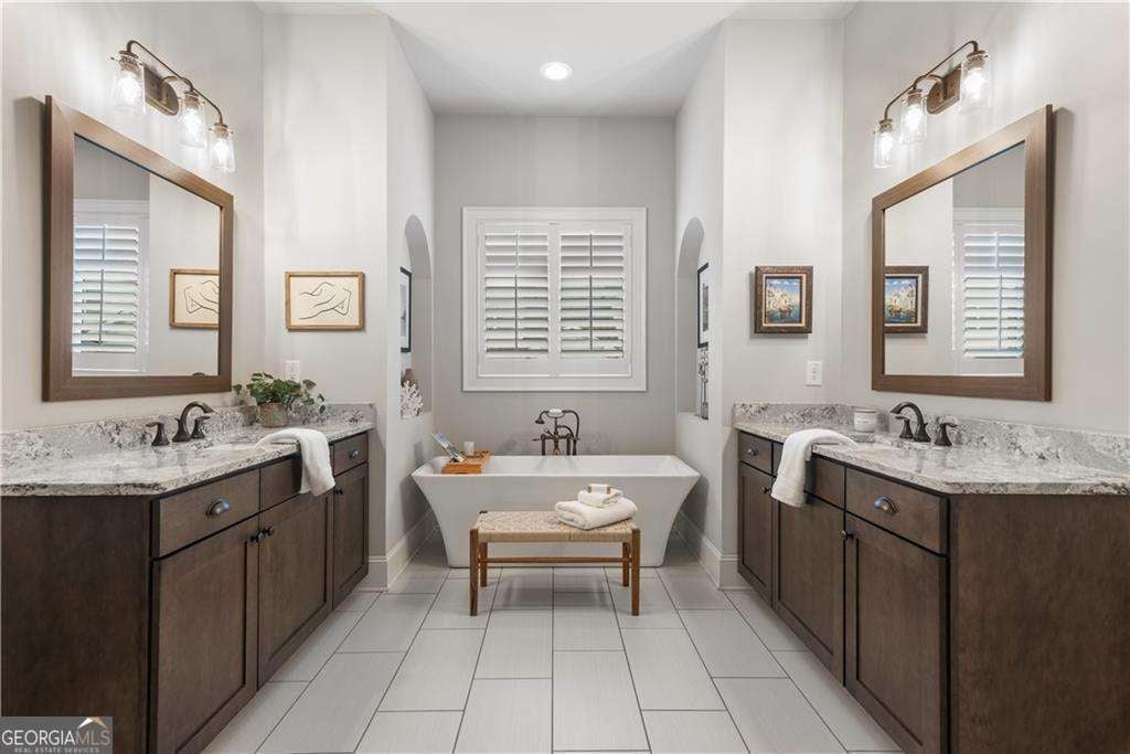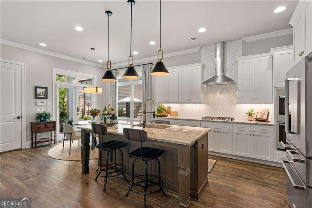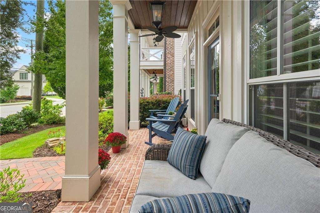 Here's the ultimate downtown Alpharetta living opportunity you've been waiting for! You'll fall in love with this exquisite and spacious home loaded with over $100K of special features and upgrades, all designed to enhance your everyday life. The most charming double porches welcome you. Upon entering this stunning home, you'll appreciate the upgraded rich wide-planked LVP flooring and the soaring 10 foot ceilings throughout the main floor. The two spaces located at the front of the home are perfect for elegant dinners and cozy fireside evenings. The study also does double duty with its specially designed built-in cabinet that serves as a tucked away desk/office. Also, the gracious dining room seats at least eight guests with easy access to a built-in butler's pantry/bar that's ready for service. The back half of the main floor offers a casual, open space for relaxed living and entertaining. Enjoy a beautiful, well-equipped kitchen with KitchenAid and GE Profile appliances including a double oven. There's a perfect sunny breakfast area, just the place for enjoying morning coffee - all open to a very spacious and stylish great room, boasting a modern stone fireplace, flanked by stained floating shelving. This main floor is conveniently located steps from the 2-car garage, making unloading groceries a breeze. Complimenting this amazing space you'll note other custom upgrades like a designer ceiling fan, island pendants, gold-tones hardware, upgraded sink faucet and other lovely light fixtures. And, don't miss the smartly designed custom pantry and closet. The second floor does not disappoint with four spacious bedrooms, including a sumptuous primary suite complete with a fabulous sitting area and private screened porch. The primary suite features a stunning spa-like bath with simply the best amenities: oversized walk-in shower, dual granite topped vanities, free-standing slipper tub ready to spoil you, and two enormous fully custom designed closets that will simply wow you. There's no home in this price point that offers a primary suite like this! The lovely secondary bedrooms have access to well-appointed baths, more custom closets and the second story porch with a view of downtown Alpharetta. One more (a third) floor awaits currently used as an inviting den with a full bath that is perfect for movie nights or game day. Another unique feature of this home is the two walk-in storage spaces located on the third level...there's definitely no lack of storage here! The garage provides even more storage with its motorized lifts plus there's a epoxy finished floor and wiring for an EV charger. The cu degras is the most enchanting porch and side patio with its lush professional landscaping, fun party lights strung all around, stepping stones and planters brimming with greenery. It's one heavenly escape from the everyday hustle and bustle. This home offers the ultimate location, just a few minutes' walk to all of the fun, action and excitement of downtown Alpharetta's shopping, dining, and popular events like the Brew Moon Festival, Taste of Alpharetta and the Songwriter's Festival...and so much more! And, the amazing Avalon is within walking distance too. If you're looking for a home that is located in the middle of it all without compromising comfort and space, you've found your new home!