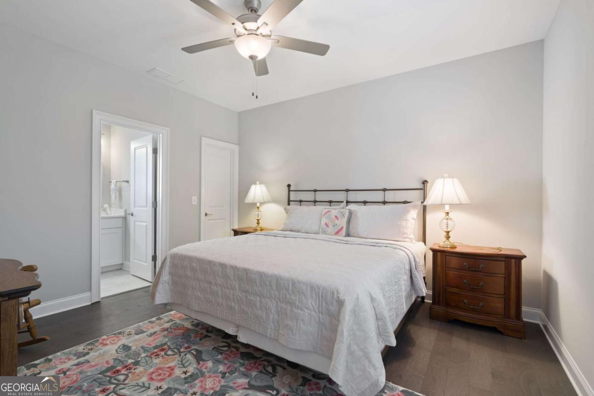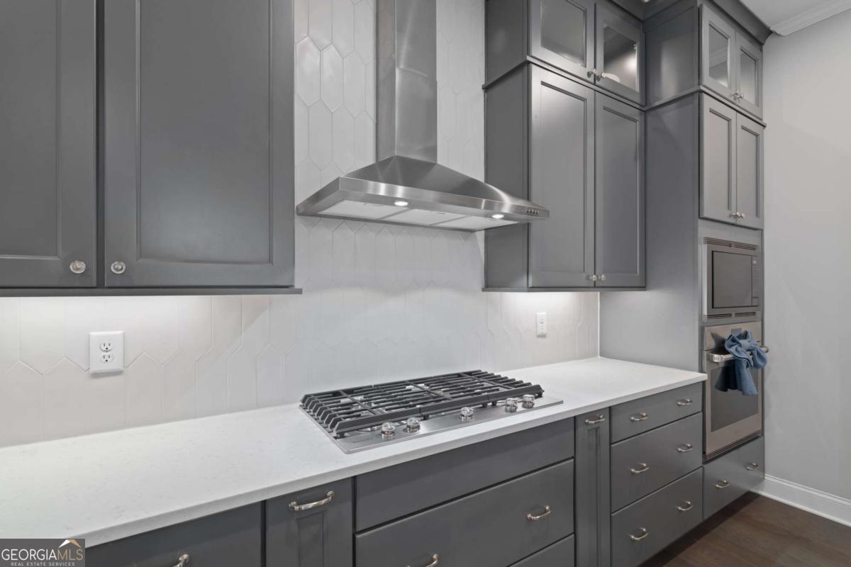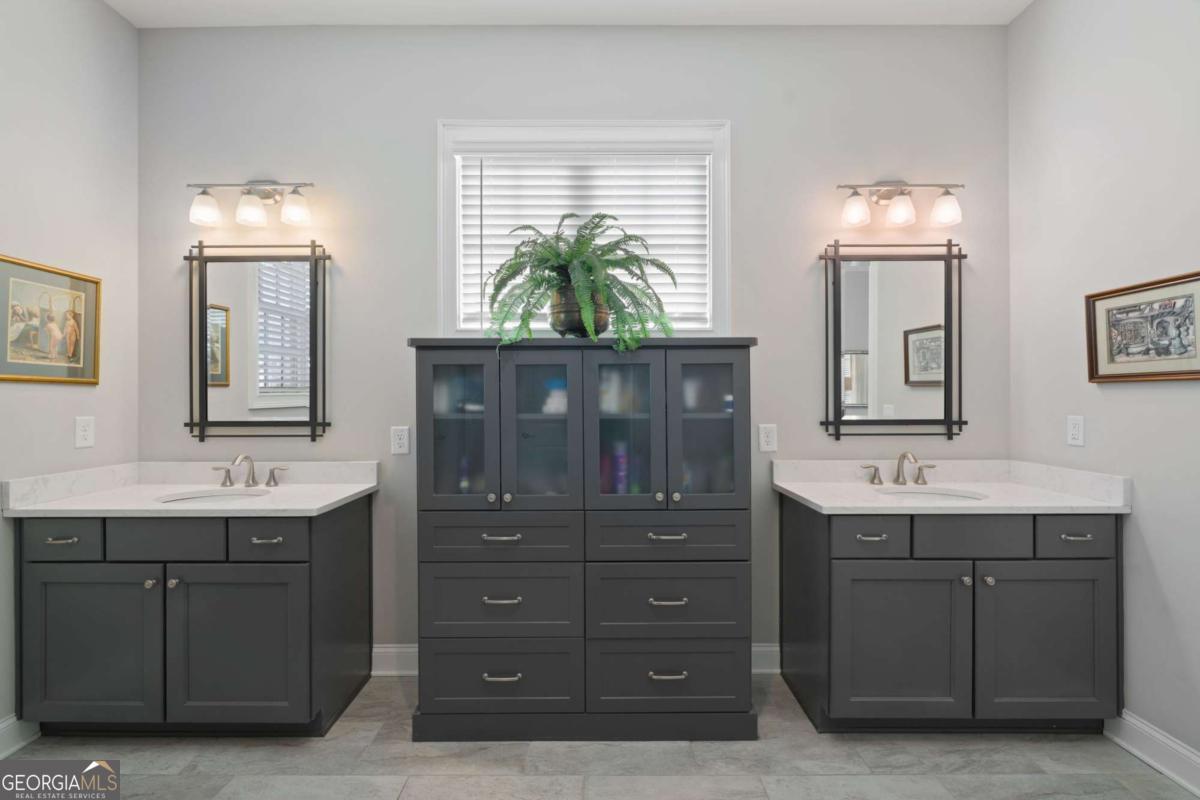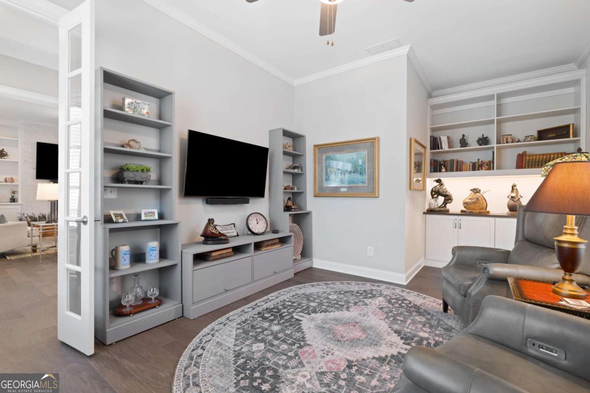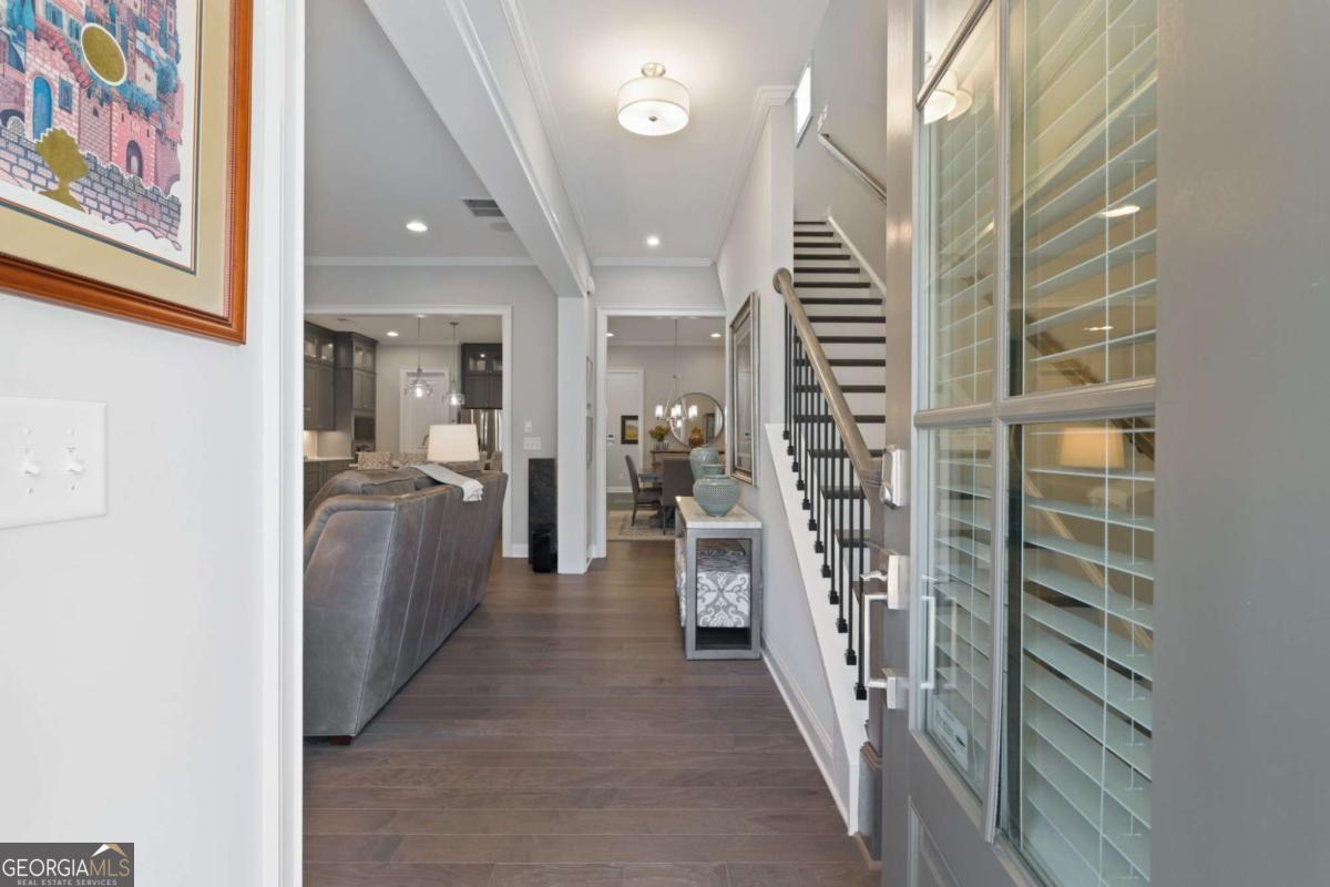 HALCYON PRIME LOCATION! Like new, GORGEOUS designer finishes! This beautifully appointed detached single-family home offers has an amazing floor plan with MASTER ON MAIN and a separate home office on the main with built ins over looking the greenway. Thoughtfully designed, and an unbeatable lifestyle in the heart of Halcyon. From the covered front porch to the light-filled interior, this home is both welcoming and sophisticated. Featuring 4 bedrooms, 3.5 baths, and a 2-car garage, the layout is ideal for modern living and entertaining. Step outside your door with access to the Big Creek Greenway, or walk across the street to Halcyon's vibrant mix of shopping, dining, and entertainment. The main level showcases wide-plank hardwood floors, custom built-ins, and a fireside family room with a sleek tiled fireplace, perfect for everyday living and entertaining. Just off the foyer, a flex room with French doors and custom built-ins offers endless possibilities as a home office, study, sitting room, or playroom. The open-concept layout flows seamlessly into the designer kitchen, featuring an oversized center island, ceiling-height cabinetry, tiled backsplash, under-cabinet lighting, stainless steel appliances, gas cooktop with vent hood, and pendant lighting. A spacious dining area easily accommodates gatherings large or small. The main level also includes a convenient powder room. Step outside to your large covered patio extends the living space outdoors-perfect for dining, relaxing, and entertaining. The main-level primary suite is a true retreat, highlighted by a tray ceiling, abundant natural light, and a spa-inspired bath featuring dual vanities with quartz countertops, custom cabinetry with a center storage tower, framed mirrors, and updated lighting. The bathroom is complete with a frameless glass shower with designer tile, offering refined finishes throughout. Upstairs, you'll find three additional bedrooms, two full baths, and a versatile loft area-ideal for a media room, gaming space, or secondary living area. Located in the Halcyon community, just moments from GA-400, residents enjoy private green space, direct access to the Big Creek Greenway, and effortless connectivity throughout the area. Halcyon is celebrated for its vibrant, walkable atmosphere and an exceptional selection of restaurants, cafes, boutiques, and entertainment options, all just steps from home.(There is even a resident walking tunnel under the roadway for ease of use!) From casual dining and coffee spots to chef-driven restaurants and lively gathering places, there is something for every taste and occasion. This thoughtfully planned community blends nature, architecture, and lifestyle-inviting you not just to live here, but to live well every day here.