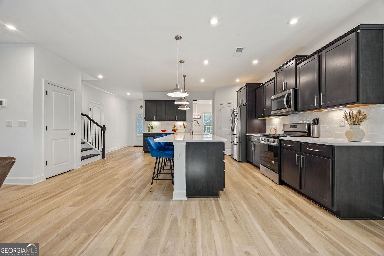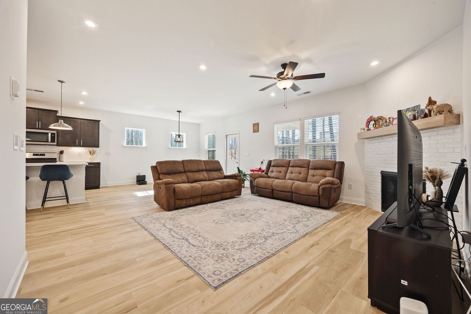 Privately owned resale home - not builder inventory or new construction. This completed 2024 Berkeley Mill property is offered as a short sale subject to lender approval and features extensive upgrades throughout...Available now and offered in like-new condition, this home has been upgraded to the fullest extent offered for this floor plan. Hardwood floors run throughout the home, complementing oversized rooms and a functional main-level layout with a true formal dining room. The open living area features a corner fireplace with a painted brick surround and custom mantel, while oak tread stairs with open railing and metal balusters add architectural interest. The kitchen is designed for both style and everyday use, featuring upgraded cabinetry with soft-close doors and drawers, roll-out trays, quartz countertops, an extended island overhang, designer tile backsplash, under-cabinet lighting, and a direct-vent hood.Upstairs, the spacious owner's suite includes tray ceilings and a spa-inspired bathroom with a walk-in shower, separate soaking tub, upgraded tile surrounds, quartz countertops, and modern fixtures. Secondary bedrooms are generously sized, with walk-in closets in every bedroom except the fourth. A large loft offers flexible space for a media room, home office, or additional living area. Additional upgrades include a covered lanai and extended patio, enhanced LED lighting throughout, upgraded trim and baseboards, two-tone interior paint, faux wood blinds, upper laundry cabinetry, a painted garage, EV charging outlet, smart home features, and upgraded door hardware. Berkeley Mill offers resort-style amenities including a pool with cabanas, playground, walking trails, and a neighborhood fire pit. Conveniently located near GA-400, Cumming City Center, and Lake Lanier, this home combines modern design, high-end upgrades, and immediate availability.