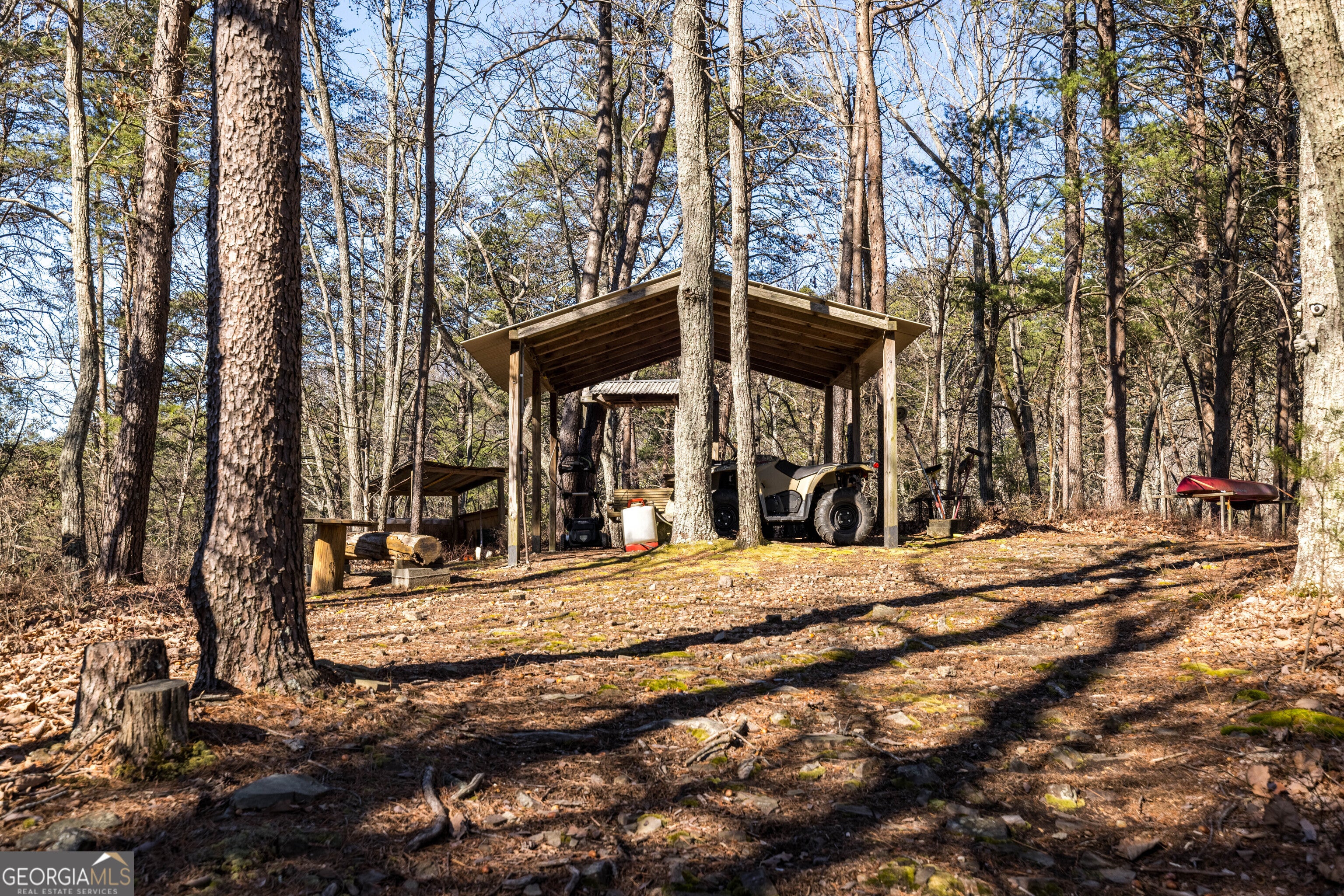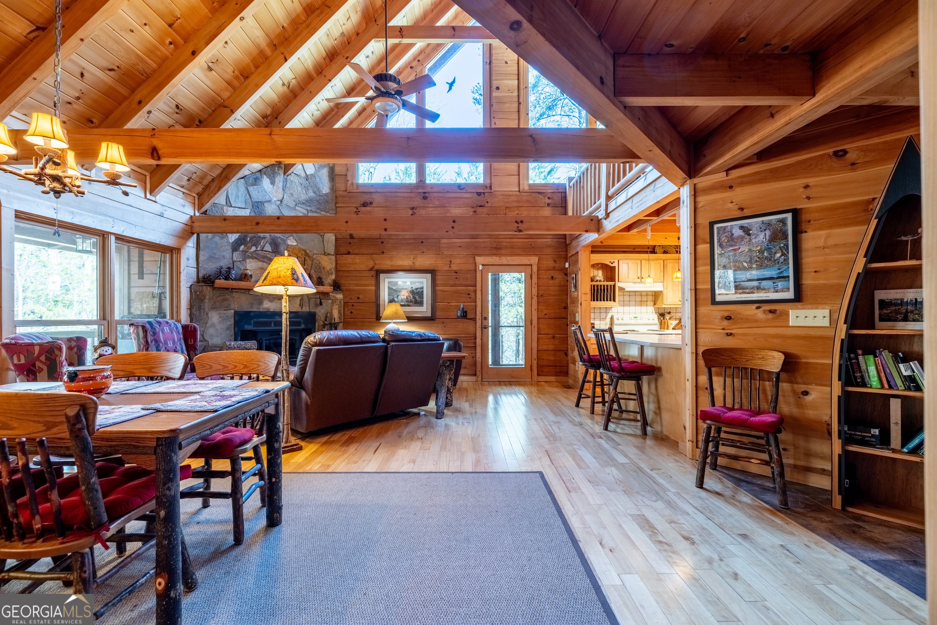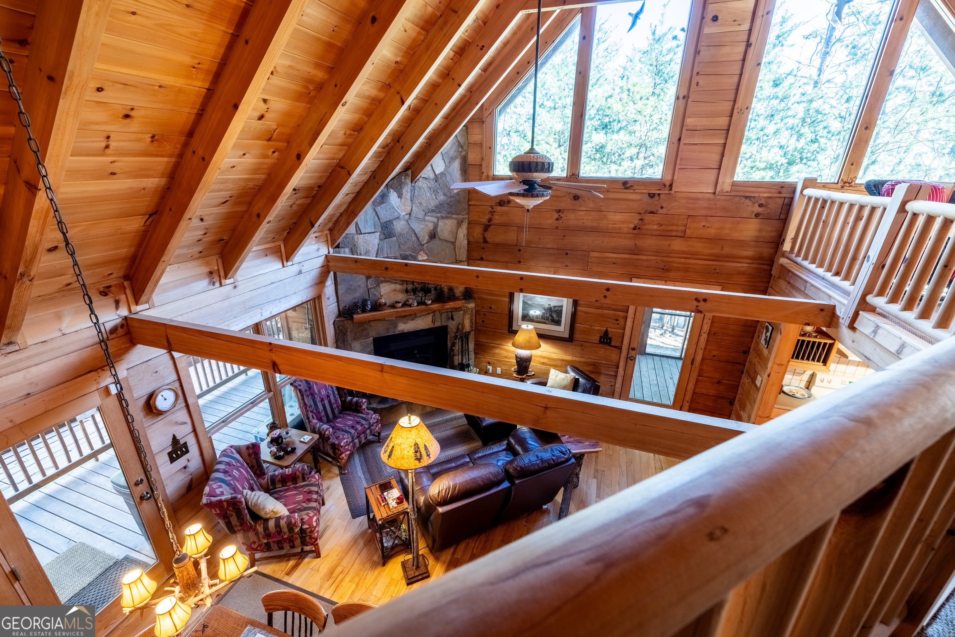 Tucked into the heart of scenic Big Texas Valley on Simms Mountain, this impeccably maintained one-owner log cabin offers a rare combination of privacy, mountain views, and 168 acres of recreational land in Northwest Georgia. Just outside historic downtown Rome and within easy reach of Atlanta and Chattanooga, the property is surrounded by mature hardwoods and pines, with elevation rising to a scenic mountain ridge. The 1,974-square-foot cabin features three bedrooms and two and one-half baths, vaulted wood ceilings, abundant natural light, maple hardwood floors and a warm, rustic interior centered around a custom rock fireplace. A country kitchen with solid surface countertops opens to the great room and wraparound porches, both open and screened-in, creating seamless indoor-outdoor living. The main-level primary suite, kitchen and great room offer direct access to the screened-in porches, while a loft overlooking the great room serves as a game and gathering space with two additional bedrooms and bath upstairs. Carefully planned walking and ATV trails lead through the property to the mountain ridge and a covered 3-sided elevated structure, ideal for camping or deer and turkey hunting. Multiple structures provide storage and support for recreational and land management needs. The cabin is positioned on a private 2.12-acre homesite within the larger tract, offering sweeping forest and mountain views with no visible neighbors and the peaceful sounds of nature. Furnishings and lawn/garden equipment remain with the property as well as a recreational vehicle and kayak. This property includes 4 parcels: 3 parcels in Floyd County - cabin and 73.3 acres and 1 parcel in Chattooga County - 95 acres. Located just 4 miles from the 5,000-acre Rocky Mountain Recreation Park with 3 lakes known for fishing and ample hunting opportunities within the Chattahoochee National Forest. This turnkey mountain property is perfectly suited for a private family getaway, hunting and outdoor recreation, or a primary residence.