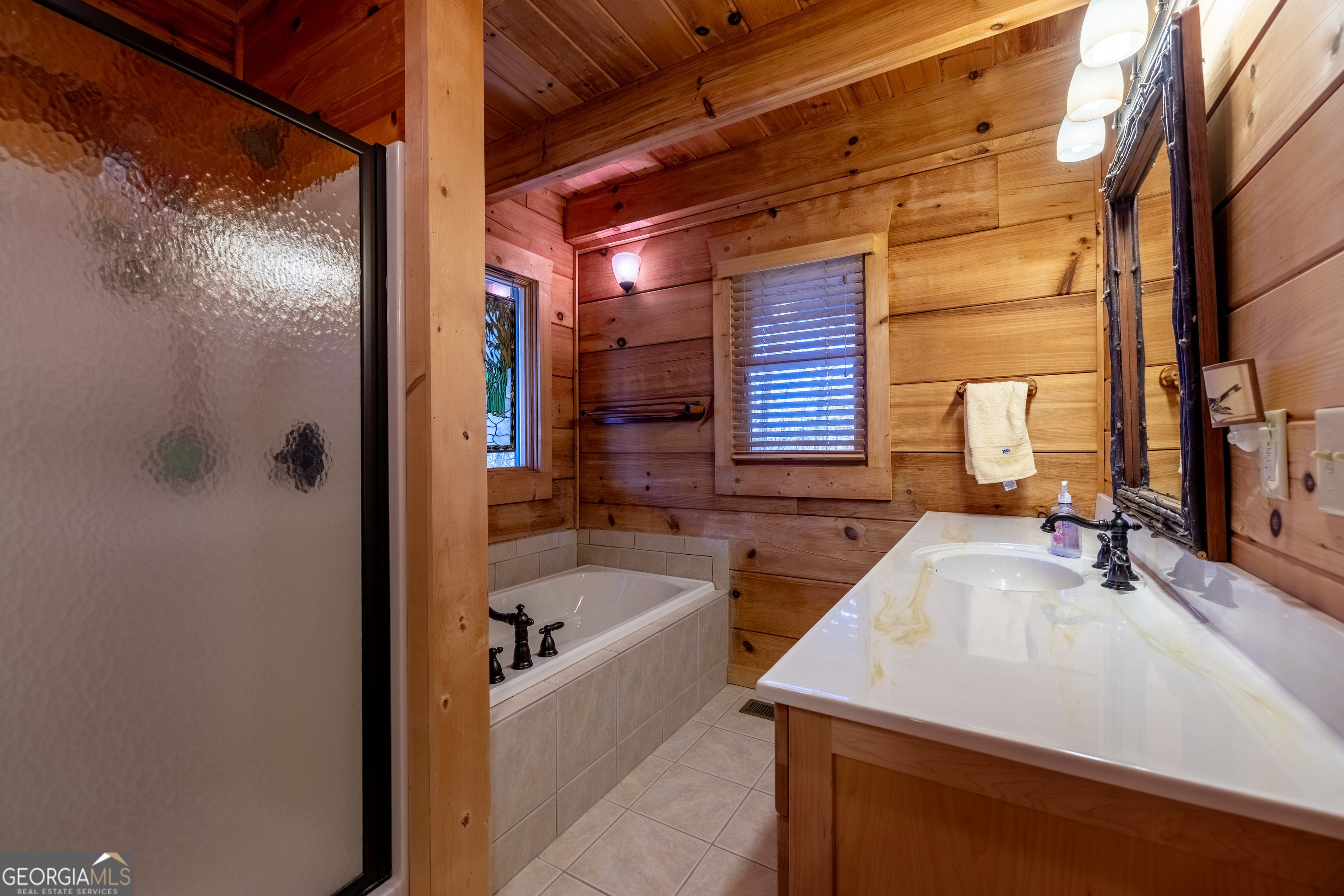 - Interior FeaturesDouble Vanity, High Ceilings, Master On Main Level, Separate Shower, Soaking Tub, Tile Bath, Vaulted Ceiling(s), Walk-In Closet(s), Beamed Ceilings