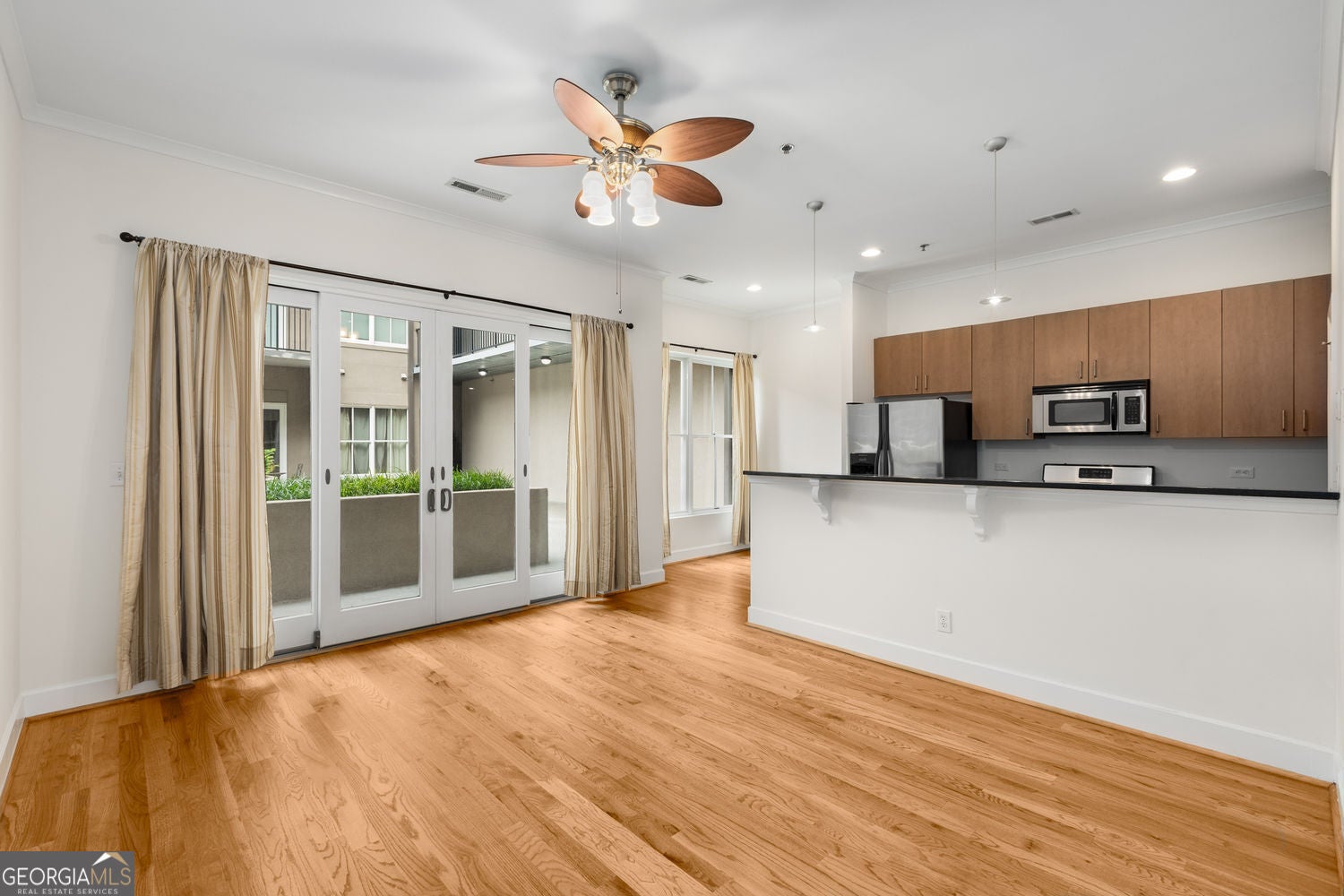 This is the perfect Old Fourth Ward condo, just minutes from midtown & downtown, Krog Street Market, Ponce City Market, The Beltine, and has excellent access to freeways. This one bedroom condo has over $26k in recent updates & improvements: brand new 3-1/2" wide, 3/4" thick, oak hardwood floors throughout (2025), fresh paint (2025) and a new HVAC system (2024). This rare courtyard unit has a large private patio on the pool and clubhouse/fitness center terrace level. It features 10' ceilings, 8' doors, crown molding, stainless steel appliances, granite countertops, mahogany stained kitchen cabinets, updated bathroom, walk-in closet with adjustable Elfa Closet Organization System and recessed lighting. The large in-unit laundry fits a full size stackable washer & dryer, and the secured and reserved garage parking space is just 2 spaces from the elevators. This full service, secured building features concierge, business center, pool, clubhouse, fitness center, dog park and secured garage parking. Monthly HOA fees include everything but electricity: water, gas, trash, sewer, cable and internet are all included. You can't beat the location, unit upgrades, building amenities and garage parking at this price point! Building is FHA/VA approved.