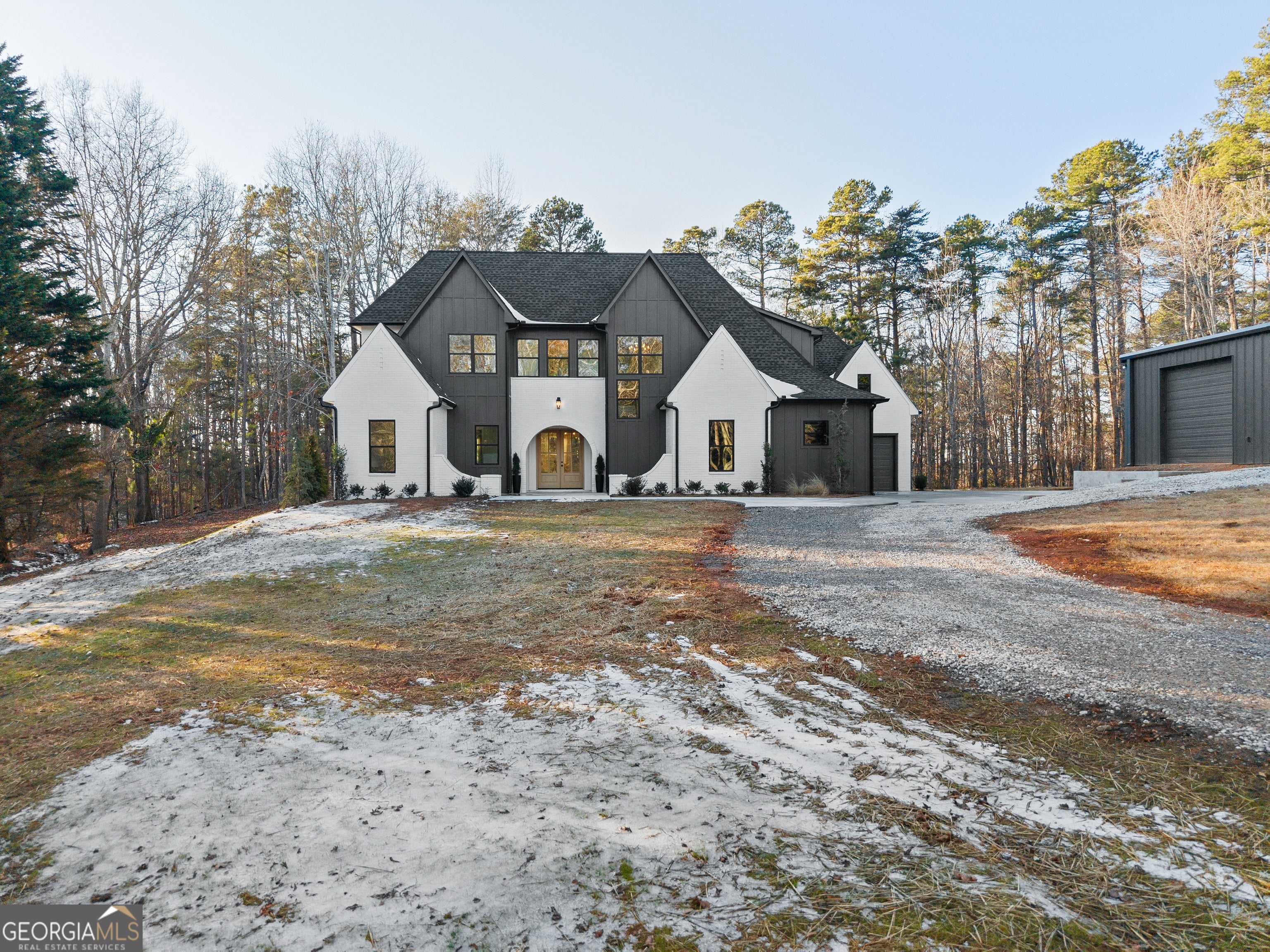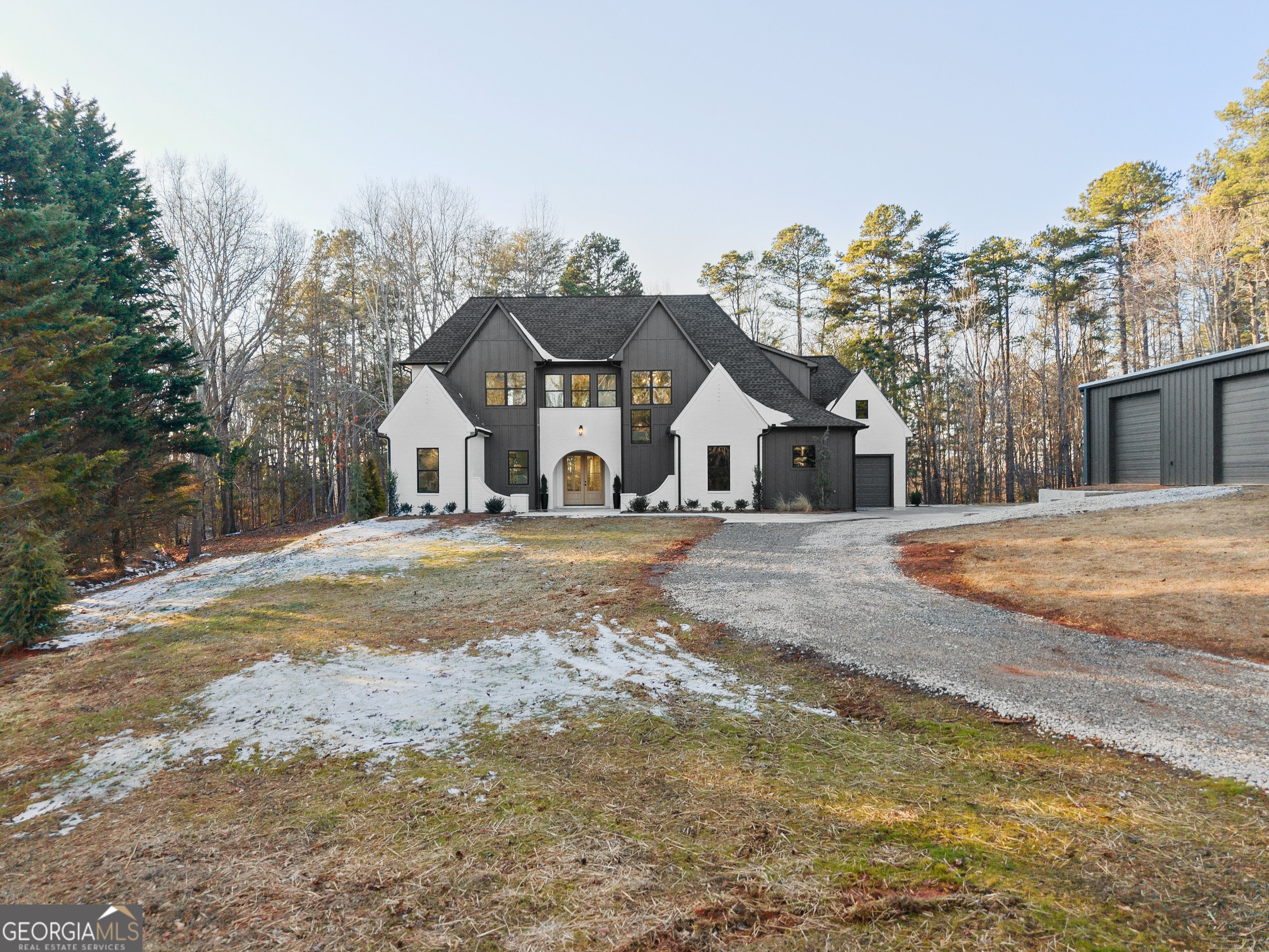 Brand-new, custom-built European farmhouse inspired by California-modern design, offering high-end fixtures, refined finishes, and thoughtful architectural detail throughout. Situated on a private lot with no HOA and no restrictions, this home provides rare flexibility with future opportunities to expand, personalize, or subdivide. The exterior features painted brick, vertical siding, dramatic gables, and clean architectural lines. Inside, light-filled interiors, wide-plank hardwood floors, and curated finishes enhance the open-concept layout. The chef's kitchen includes high-end appliances, an oversized quartz island, custom cabinetry, and an expanded walk-in pantry with space for a second refrigerator. The kitchen flows seamlessly into the living area with a gas fireplace and extends outdoors to a covered back patio with an outdoor fireplace-ideal for year-round entertaining and future backyard customization, including space for a pool. The primary suite on the main level offers privacy and spa-inspired comfort, featuring a luxury walk-in shower, freestanding soaking tub, abundant natural light, an oversized custom closet, and direct access to the laundry room. Upstairs includes a spacious media and game room with wet bar and beverage center, three generously sized ensuite bedrooms with custom closets, and a versatile flex room suitable for a home office, playroom, or additional bedroom. Notable Builder upgrades include hardwood floors throughout, a tankless gas water heater, expanded custom pantry, custom closets, a three-car garage, and a 1-year limited builder warranty. Enhancing the property is a 60x40 steel-frame workshop with 12-foot ceilings and three garage doors, ideal for boat or RV storage, a car collection, home gym, or additional workspace. The property has been platted into two separate tracts, offering the ability to sell the front tract or develop it for resale or rental income. List price includes both tracts. Located just 1.3 miles from Young Deer Creek Park and Boat Ramp, this property combines architectural design, modern amenities, flexible living spaces, and proximity to outdoor recreation. You have to see this home in person to experience all it has to offer!
