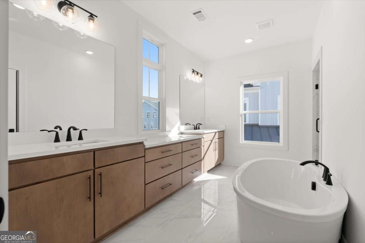 - Interior FeaturesDouble Vanity, High Ceilings, Pulldown Attic Stairs, Separate Shower, Soaking Tub, Tile Bath
