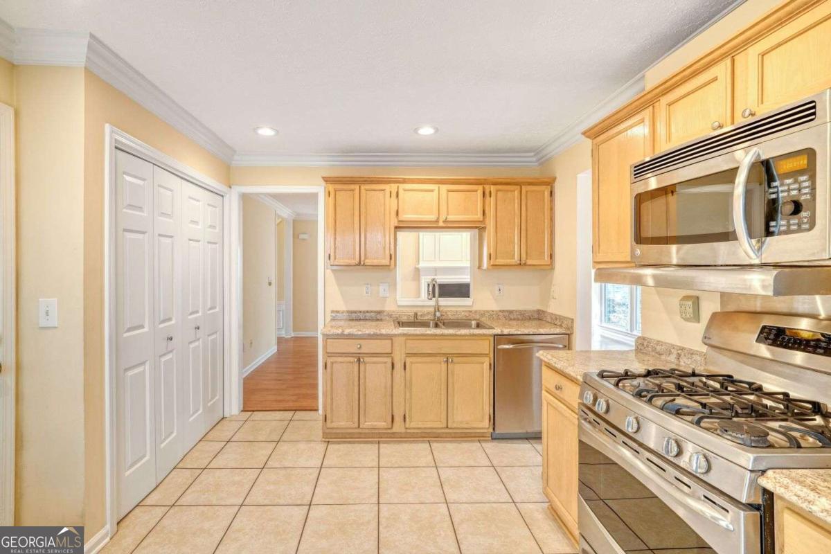 Fabulous, well-maintained 4-bedroom, 21/2-bath home in a Prime School District located in Johns Creek! This home is not just beautiful; it is built for efficiency and longevity. Owners have invested heavily in quality, such as Champion energy efficiency high performance windows ($30K), insulated garage doors, and Champion gutters with gutter guards ($4K) to keep your weekends free. Worry free architectural roof, HVAC system, and water heater are all only 5 years old. A beautiful mahogany leaded-glass front door welcomes you inside to a two-story foyer. The spacious family room features a cozy fireplace with ventless gas logs. This home is loaded with laminate flooring throughout, crown molding, recessed lights, and wainscoting. Updates include new low-flow toilets, faucets, and a deep kitchen sink. The kitchen offers stainless-steel appliances-GE Profile refrigerator, microwave, gas stove, and dishwasher-along with tile floors and a pantry. The large master bedroom boasts cathedral ceilings and a spacious master bathroom with dual vanities, seamless shower doors, a garden tub, tile flooring, leaded-glass design windows, and new light fixtures, ceiling fan, and faucets. The versatile finished basement includes a den or flex room, and an additional bedroom-ideal for guests, a home office, or a gym. A deck overlooks the private backyard. Location, location, location! Forget the morning carpool! you are just a 3-minute walk to Taylor Middle School and Chattahoochee High School. Enjoy the convenience of being minutes away from premier shopping, restaurants, and major highways.
