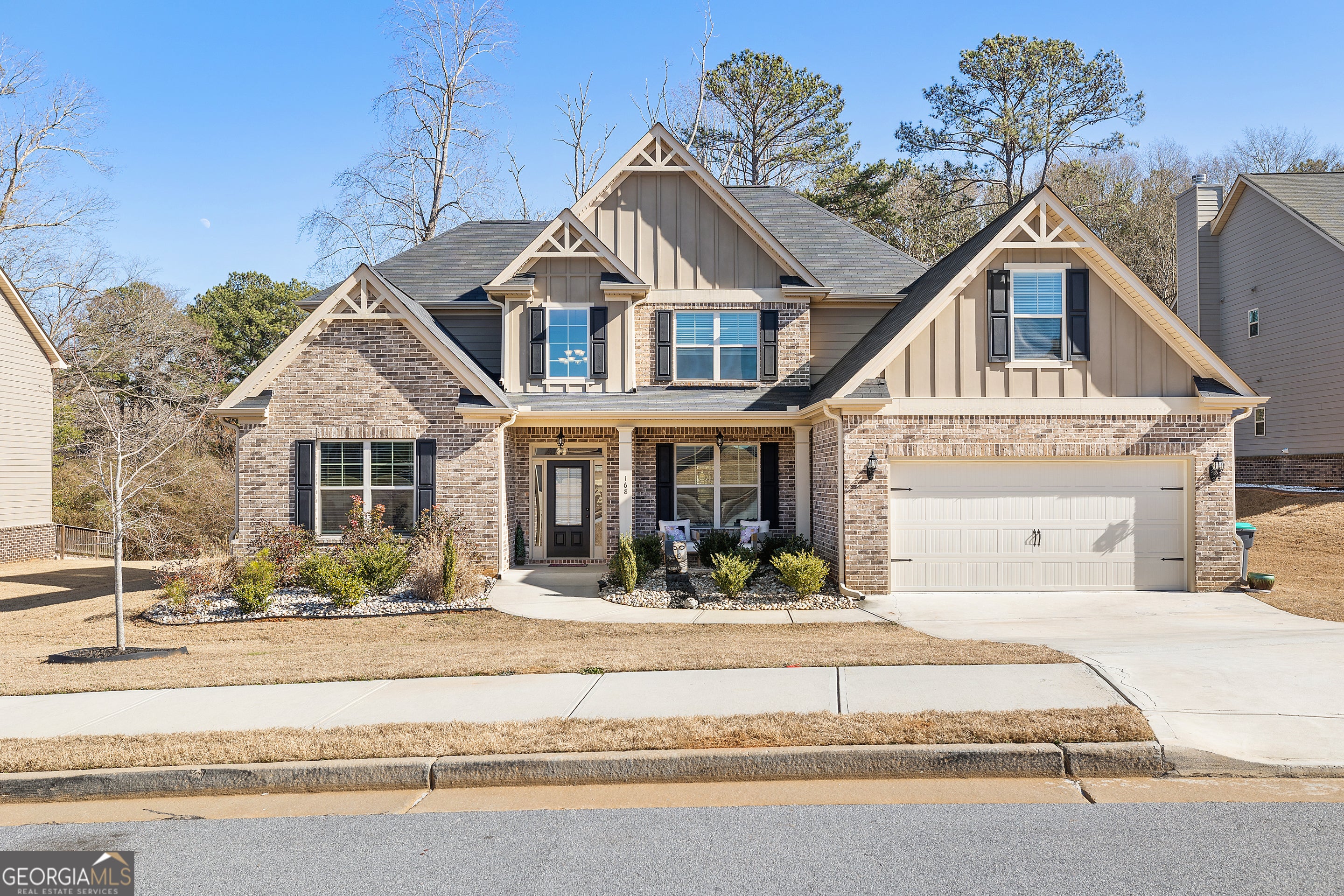 Better than new home with exceptional "Master on the Main" residence located in sought after Union Grove school district. This stunning home offers 5 spacious bedrooms and 4.5 beautifully appointed baths, thoughtfully designed for both elegant entertaining and everyday comfort. Upon entry, a dramatic two-story foyer with hardwood flooring sets the tone, complemented by a graceful catwalk overlooking both the foyer and the family room. The formal living room features soaring vaulted ceilings, while the formal dining room impresses with coffered ceilings, shadowbox trim, and rich hardwood floors, perfect for hosting unforgettable gatherings. The family room boasts a vaulted ceiling and striking stone fireplace with gas starter, seamlessly flowing into the heart of the home, an incredible chef's kitchen. Highlights include stainless-steel appliances (double ovens, gas cooktop, side-by-side refrigerator, microwave, and dishwasher), 42" stained cabinetry, granite countertops, tile backsplash, a large island with breakfast bar, hardwood flooring, and a walk-in pantry. A sun-filled breakfast room with vaulted ceilings completes the space. The luxurious main-level owner's suite offers a private sitting area and a spa-inspired bath featuring a garden tub, tiled shower, raised cabinet double vanity with granite countertops, tile flooring, and an expansive walk-in closet. Upstairs, you'll find two private teen suites with full baths, an additional secondary bedroom, and a versatile bonus or fifth bedroom. Exterior features are equally impressive, including a covered front porch, covered rear patio, irrigation system, brick front with board-and-batten accents, brick water table on three sides, and durable concrete core siding. The home is completed by a two-car garage with carriage style doors and remotes. An extraordinary opportunity to own a refined, thoughtfully designed home that blends luxury, comfort, and timeless style. Enjoy the benefits of newer construction, public water and sewer, and a well-kept neighborhood with community standards in place. Conveniently located near shopping, dining, Union Grove schools, and major roadways, this home offers both comfort and accessibility.