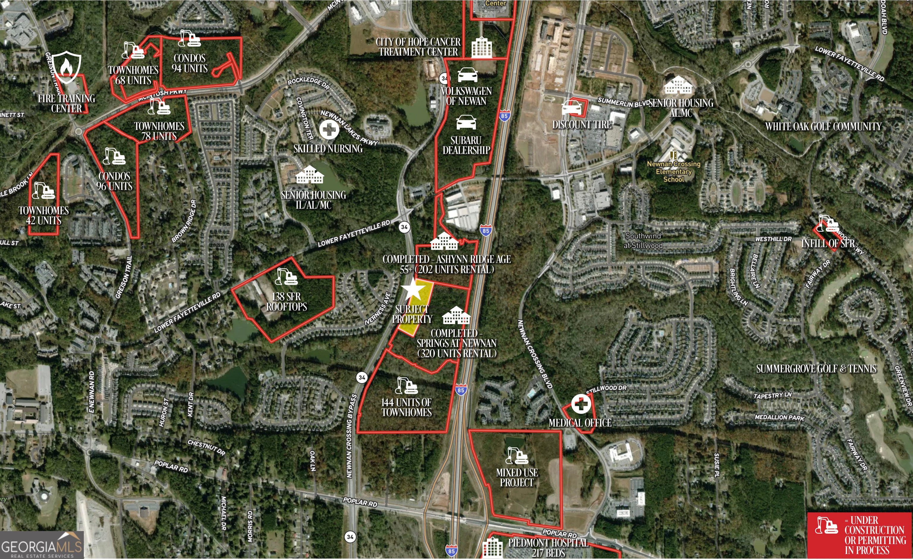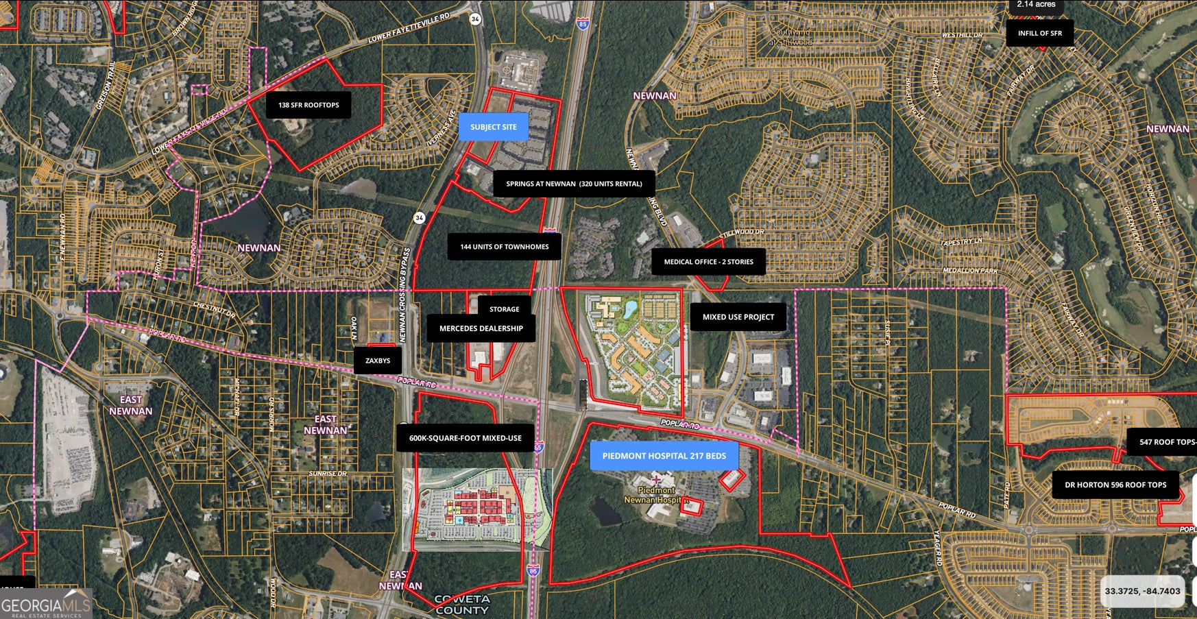 Prime 5.93 acre pad-ready commercial parcel located WITHIN the City limits of Newnan along the heavily traveled Newnan Crossing Bypass (SR 34), offering exceptional visibility and access. Zoned MXD, this pad-ready improved land is approved for retail, convenience store, medical office, restaurant and other commercial uses and features an approved site plan for two one-story buildings totaling approximately 43,520 SF with 232 parking slots, significantly reducing entitlement risk and accelerating development timelines. The property offers approximately 755 feet of road frontage, off-site stormwater detention, and access to public water, sewer, underground utilities, and high-speed internet. Access is well designed with a north-south curb cut including a median break, along with two additional right-in/right-out access points serving both directions of traffic. Strategically positioned directly in front of the 320-unit Springs at Newnan apartment community and adjacent to the 202-unit Ashlynn Ridge 55+ community, the site benefits from strong surrounding rooftops and ongoing growth, with over 2,000 residential units and 50+ projects currently under construction or in permitting within the city limits. The property is located less than 0.8 miles from the I-85/Poplar Road interchange and within close proximity to major anchors including Piedmont Newnan Hospital (217 beds), City of Hope Cancer Treatment Center, Ashley Park lifestyle retail center, SummerGrove Golf & Tennis, White Oak Golf Club, and historic Downtown Newnan. Hartsfield-Jackson Atlanta International Airport is approximately 29 minutes away, further enhancing regional accessibility. This highly visible infill opportunity offers a rare combination of approved entitlements, dense surrounding development, and immediate access to Newnan's premier medical, retail, and residential corridors. OM available to qualified buyers.