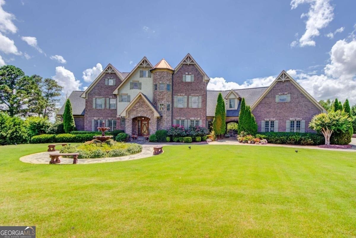 Exceptional luxury estate set well back from the street on nearly 6 private acres with NO HOA, highlighted by a stunning front-yard fountain and grand curb appeal. This 5BR/6.5BA, 8,000+ sq ft residence offers refined living with hardwood floors on the main level, a granite-appointed kitchen, and an oversized main-level primary suite. Designed for entertainment and lifestyle, the home features a theater, game room, gym, and a fully finished basement or in-law apartment-ideal for a music studio, creative space, or guest retreat. Enjoy resort-style outdoor living with a sparkling pool and expansive cabana complete with full kitchen and bar. A private in-law apartment above the garage includes a bedroom, kitchen, living room, full bath, and laundry. A rare combination of privacy, versatility, and luxury-truly a showpiece estate.