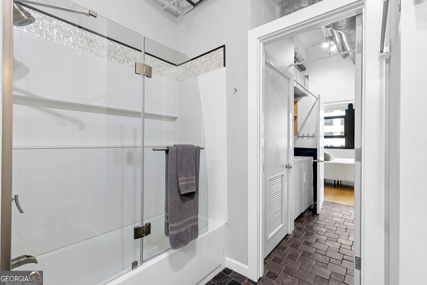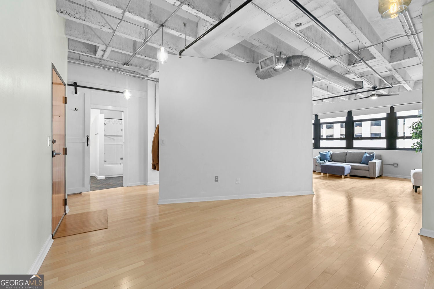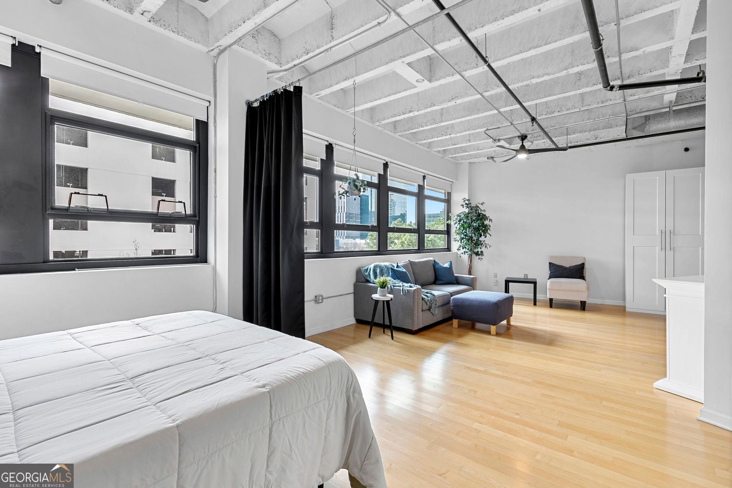 Live in the heart of the city at Peachtree Lofts. This bright one bedroom loft features 12 foot exposed ceilings, hardwood floors throughout, and an open, flexible layout with no load bearing walls, offering endless options to customize the space. A versatile entry area is perfect for a home office, dining area, or additional living space. An entire wall of windows with shades fills the home with natural light. The open kitchen overlooks the living area and features white cabinetry with black uppers, quartz and butcher block countertops, stainless steel appliances, and a spacious pantry. The bedroom area offers room for a king size bed and can be curtained off for privacy. The bathroom includes a bright white vanity, custom cabinetry, and a modern shower. Custom California Closets sit conveniently next to the in unit washer and dryer. Building amenities include 24/7 concierge, fitness center, saltwater pool, resident lounges, large dog park, and a whole building generator. Walk Score 93 with steps to Publix, restaurants, coffee shops, Fox Theatre, Piedmont Park, MARTA, the BeltLine, and more.