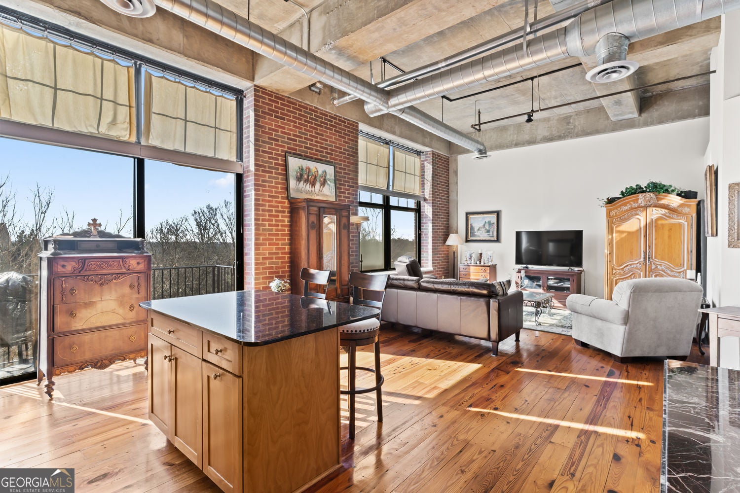 Elevated loft living in the heart of Sandy Springs. This light-filled 1 bedroom, 1 bath residence blends industrial character with modern convenience in one of the area's most walkable locations. Soaring exposed ceilings, classic brick accents, hardwood floors, and oversized windows create a timeless loft feel, while a private balcony offers open views and great natural light. The open-concept kitchen flows seamlessly into the living space and features stained cabinetry, granite countertops, and a full appliance package. The spacious bedroom offers privacy and comfort, and the bath includes a soaking tub and separate shower. An additional storage unit and two assigned parking spaces in the covered garage are included. Enjoy unbeatable walkability to shopping, dining, grocery stores, green space, and the Sandy Springs City Center, with easy access to MARTA, GA-400, I-285, and major business districts. Building amenities include a rooftop pool, fitness center, concierge services, resident clubhouse with event kitchen, pet walk, and secure access. A rare opportunity for stylish loft living in a prime location.