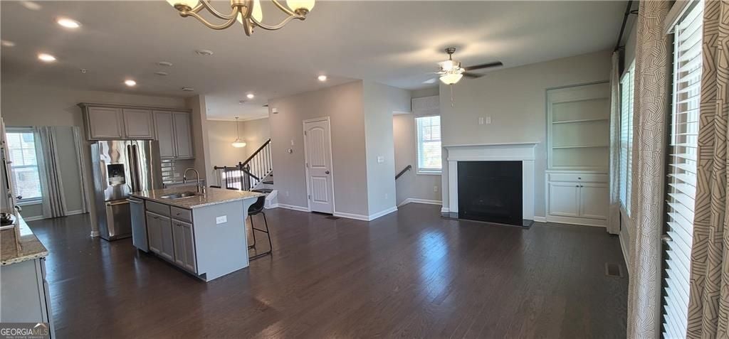This desirable end unit townhouse, once the builder's model, boasts a spacious 4 bed/3 bath floorplan. The open-concept main level seamlessly connects the kitchen, living, and dining areas. The kitchen features double ovens, a gas cooktop, stone countertops, and a center island ideal for both meal prep and casual dining. The living area features a cozy fireplace and bookcases, leading to a private covered deck. Located on the upper level is the master suite featuring an ensuite bath complete with double vanities, a separate shower, and a soaking tub. Two more sizable bedrooms and a full bath complete the upper level. The finished lower level offers another bedroom and full bath. Additional highlights include all draperies, bidets on all toilets, a Tesla charger in the garage, and two Ring cameras (front door and garage). Conveniently located just steps from the pool and visitor parking, and a mere ten-minute stroll to vibrant downtown Woodstock! Plus, enjoy easy access to I-575 and the Outlet Shoppes at Atlanta, just a quick two-minute drive away.