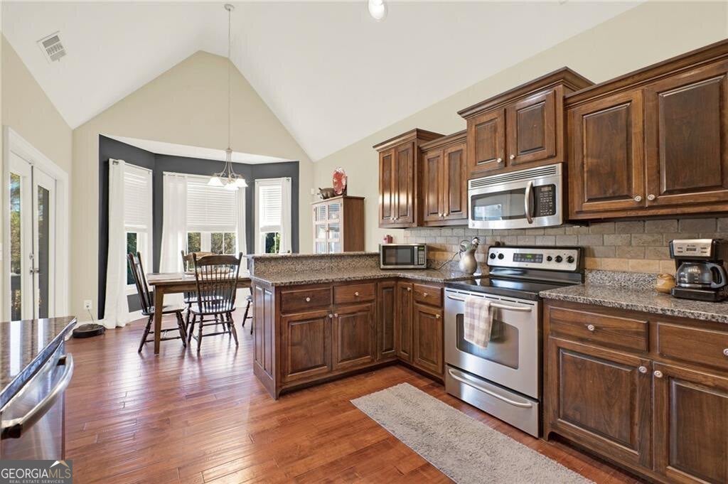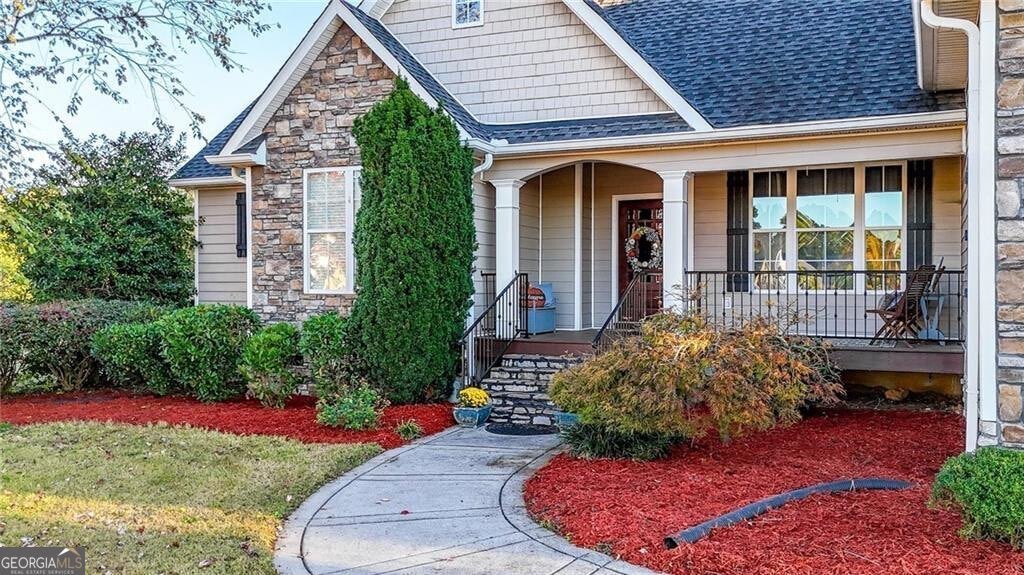 Beautiful Craftsman style home in the sought after Soda Creek neighborhood! This spacious 4-bedroom, 2.5-bath home offers a welcoming open concept floor plan with hardwood and ceramic tile flooring, a large bonus room upstairs, and tons of upgrades. Enjoy an inviting double-sided fireplace connecting the family room and outdoor living space, and professional landscaping perfect for entertaining or relaxing. The kitchen features a breakfast bar, stained cabinets, and solid surface counters with a view to the family room. The oversized master on main includes a double-vanity bath with a separate tub and shower. Located in a quiet community with street lights, convenient to schools, shopping, and I-75 access. Don't miss your chance to own this beautifully maintained home in one of the area's most desirable neighborhoods!