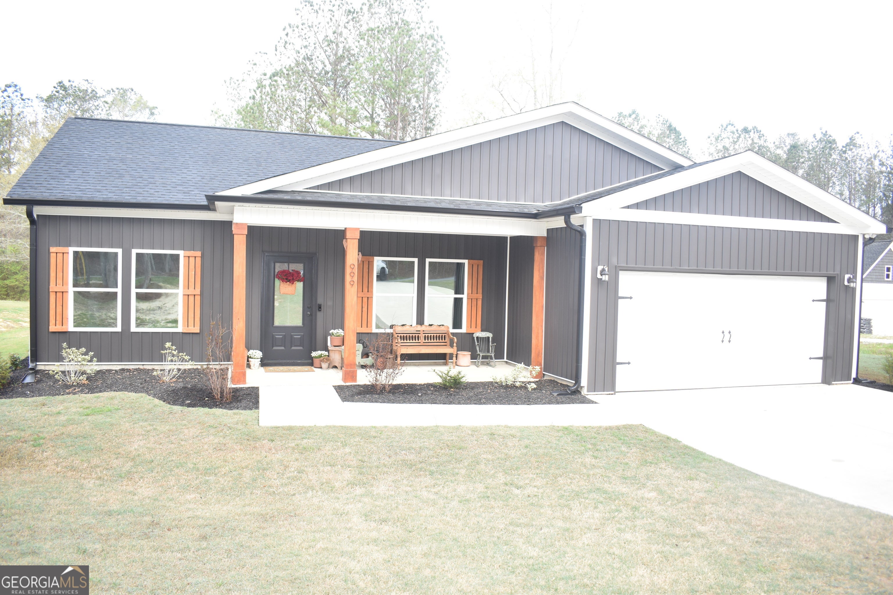 Welcome home to this move-in-ready ranch, thoughtfully designed and less than two years old. From the moment you arrive, the home's eye-catching board-and-batten exterior sets the tone for the tasteful upgrades found throughout. Inside, 9-foot ceilings and an open-concept layout create an airy, welcoming atmosphere. The sun-filled living room is anchored by a beautiful fireplace insert, elegantly set into a textured feature wall-perfect for cozy evenings and effortless entertaining. The kitchen is both stylish and functional, offering abundant counter space, quiet-close cabinetry, granite countertops, and a classic subway tile backsplash that ties the space together beautifully. The spacious primary suite easily accommodates a king-size bed and additional furnishings, providing a true retreat. The en suite bathroom features a large walk-in closet, tile countertops, and an oversized shower adorned with gorgeous subway tile. A split floor plan ensures privacy, while the secondary bedrooms are generously sized and include their own walk-in closets. Additional highlights include a fully finished two-car garage, designed for easy maintenance and a polished entry into the home. Step outside to enjoy ample yard space and an oversized patio spanning over 650 square feet, ideal for entertaining, grilling, or relaxing. The pergola, which stays with the home, adds both charm and functionality to this exceptional outdoor living area. With numerous tasteful upgrades already completed, this home offers comfort, style, and modern living-all without the wait of new construction.