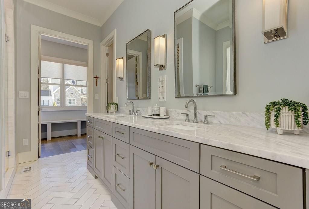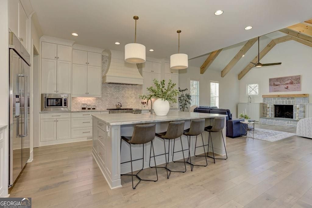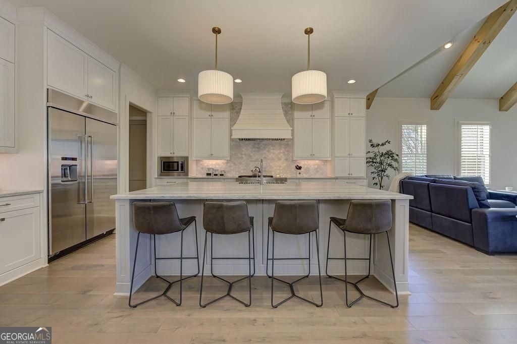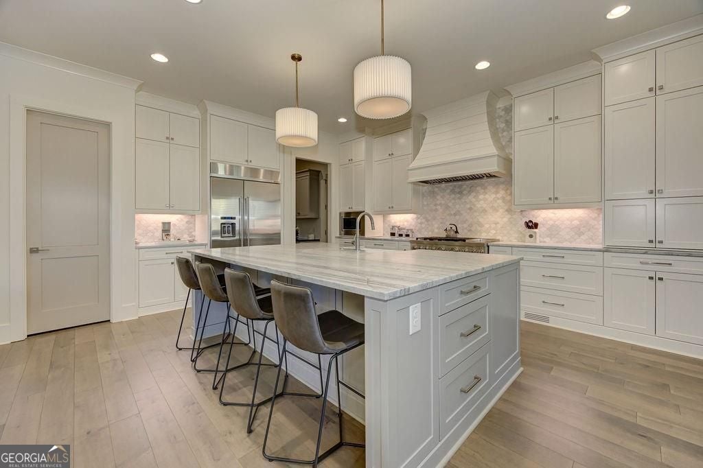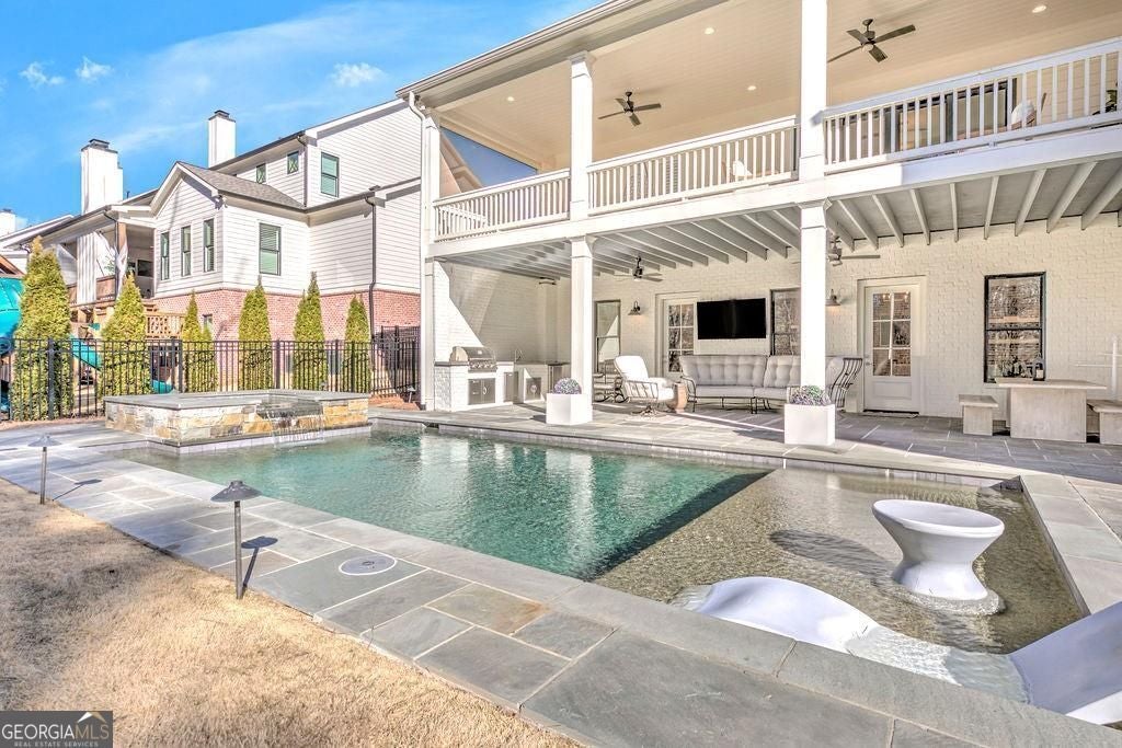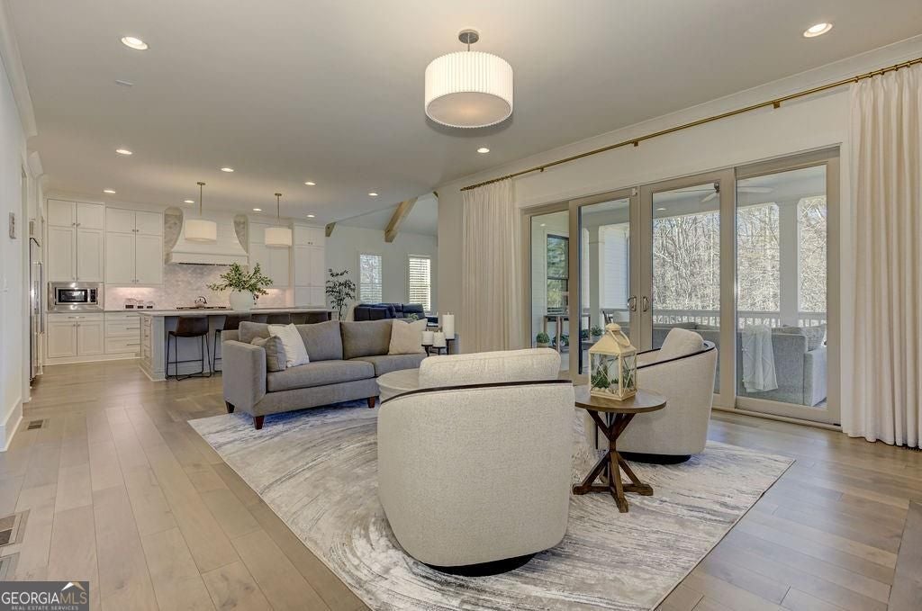 Located on a Street of Dreams, come experience the pinnacle of luxury living in the prestigious Owens Mill community near award winning Creekview High School. This stunning newer construction 5BR/6BA estate home by Steve Powell, one of Atlanta's premier builders, brings you 5900+ square feet of magnificent living space on three levels. A warm, bright foyer welcomes you as you walk through the exquisitely crafted metal front door into a large open floor plan on the main. The Dining Room sits eloquently off the foyer and adjacent to a large family room with a wood burning fireplace and stunning glass doors that look out at a tree-lined fenced backyard. The Chef's kitchen is one of the highlights of this beautiful home with KitchenAid appliances, an expansive oversized custom quartz island, elegantly crafted hood range and ample custom cabinetry. A charming keeping room sits off the kitchen with vaulted wood beams and a second wood burning fireplace. The family and keeping rooms both lead to a covered oversized porch that overlooks the heated saltwater pool, spa, Pennsylvania Bluestone decking and a covered lower patio that includes a fully equipped outdoor kitchen with gas grill, sink and refrigerator. Splendid bright light floods every room, thanks to the large windows and 10-foot-high ceilings throughout, including the basement. The main level Owners Suite is a sanctuary of luxury, including custom spa-like bathroom, dual vanities, frameless glass shower, separate soaking tub, and his and hers water closet. Not to be outdone, the second story Owners Suite includes an oversized spa-like bathroom, dual vanities, frameless glass shower, his and hers closets and a bonus living area that could serve as an office or reading area. The second story also includes two other spacious bedrooms with large closets and gorgeous full bathrooms. The fully finished basement is an open floor plan that offers space galore with entertaining areas, wet bar, movie room, exercise room, student work areas and a spacious guest room with luxury full bathroom. Don't miss additional features that include pre-finished wood floors throughout, clad windows, three car garage with epoxy flooring, custom metal railings, custom beams, exterior lighting and Leaf Guard gutter system. This home and its stunning design will take your breath away. Minutes away from top rated Cherokee Schools and four charming towns (Canton, Woodstock, Milton and Alpharetta) that offer top rated restaurants, night life, and fabulous shopping -- all while living in a conservation community. You will not want to miss out on seeing this great home. MOVE IN TODAY with an easy close.