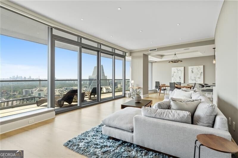 Exquisite Luxury Living at The Sovereign! Located in one of Atlanta's most iconic luxury high-rises, this spectacular residence at The Sovereign offers breathtaking, panoramic views from every room. From the moment you enter the elegant foyer, you are greeted by floor-to-ceiling windows and expansive sliding glass doors that perfectly frame the glittering skyline, lush treetops, and serene pool terrace below. This highly sought-after floor plan flows effortlessly from the spacious family room to the dining area and into the designer kitchen, appointed with Sub-Zero, Wolf, and Thermador appliances, custom cabinetry, and a walk-in pantry. Designed for both comfort and style, the home has been meticulously renovated with hardwood floors throughout, a neutral palette, and timeless finishes. The grand primary suite boasts its own private balcony with stunning views, a spa-inspired marble bathroom, and dual custom walk-in closets. A second bedroom with equally impressive vistas provides comfort for family or guests, while a separate office offers a quiet retreat for work or reading. Enjoy Atlanta's finest sunrises and sunsets from the expansive outdoor terrace. Additional features include two private parking spaces, a storage room, and a private wine cellar. As a resident of The Sovereign, you'll enjoy world-class, resort-style amenities including a recently renovated Skydeck with a zero-entry saltwater pool and hot tub, Wolf-equipped grilling stations, three private entertaining areas, a meeting room, wine cellar, and exclusive dining club. Step outside to Bistro Niko, or stroll to Phipps Plaza and Buckhead's finest shops and restaurants-all just moments away. Don't miss this rare opportunity to own one of The Sovereign's most desirable floor plans, combining sophisticated design, unrivaled views, and the very best of Buckhead living.
