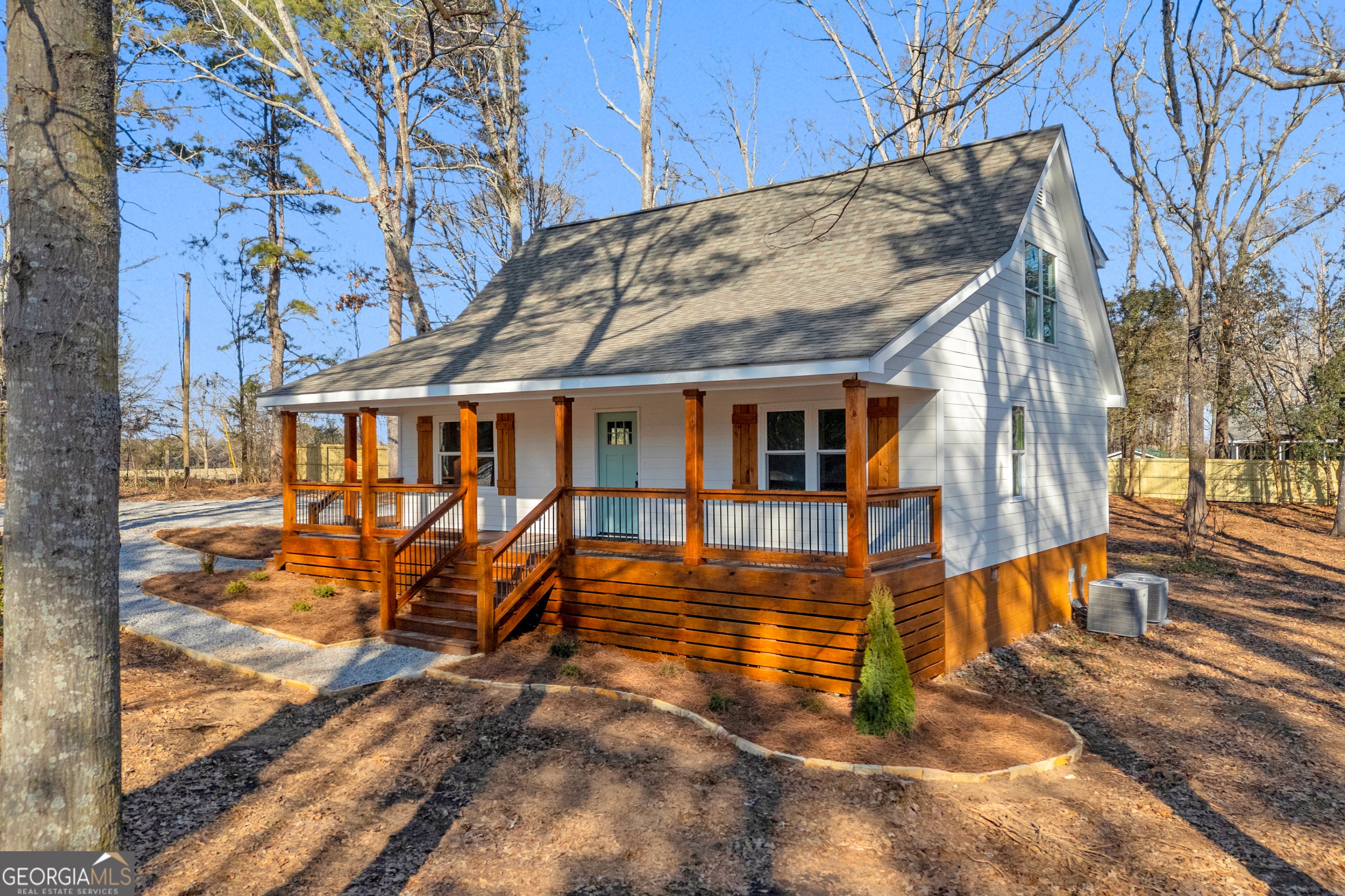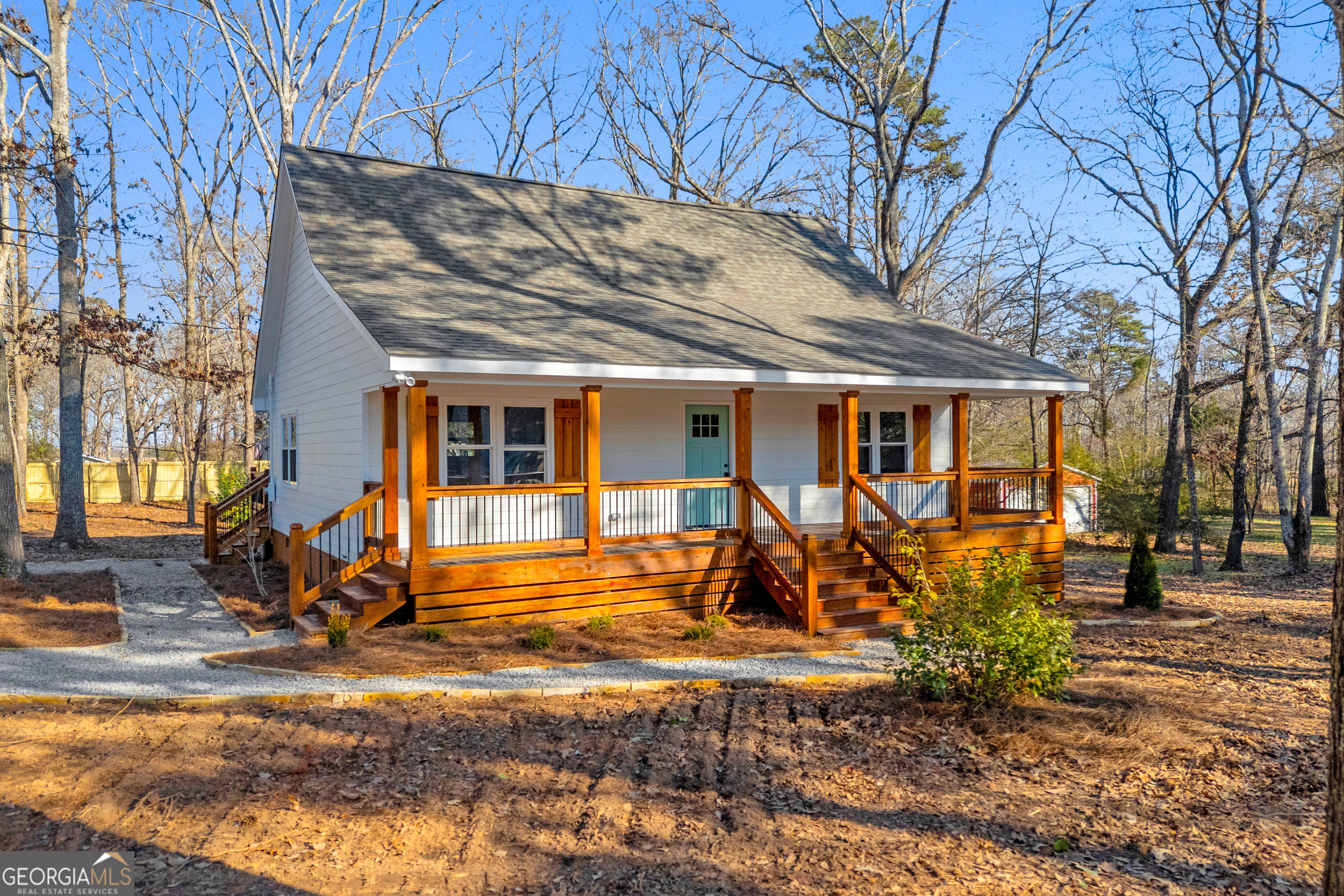 Situated on a 1-acre lot just outside of Bostwick, this like-new farmhouse cottage is a rare opportunity in north Morgan County. Completely renovated from top to bottom, the home features all-new siding, windows, roof, insulation, and more, offering true peace of mind and a move-in-ready experience. A welcoming, oversized rocking chair front porch sets the tone and invites you inside. The main level showcases beautiful hardwood floors throughout and opens into a bright living space that flows seamlessly into the eat-in kitchen. The kitchen features an island, shaker-style painted cabinetry, granite countertops, and brand-new stainless steel appliances. The main-level owner's suite offers both comfort and style, complete with a spacious en-suite bath featuring double vanities, a tiled shower with honeycomb tile flooring, and an impressively large closet. A convenient laundry room / powder room are also located on the main level. Stunning oak stair treads lead upstairs to two generously sized bedrooms, a full bathroom with a tub/shower combo, and a versatile bonus room. New carpet to be installed. Outdoor living is equally inviting with a large deck overlooking the partially wooded backyard, along with a newly installed privacy fence along the rear of the property. With scenic countryside views, open space, and peaceful surroundings, this property offers the tranquility of the countryside while remaining within easy reach of Monroe, Athens, Watkinsville, and Madison for shopping, dining, and entertainment.