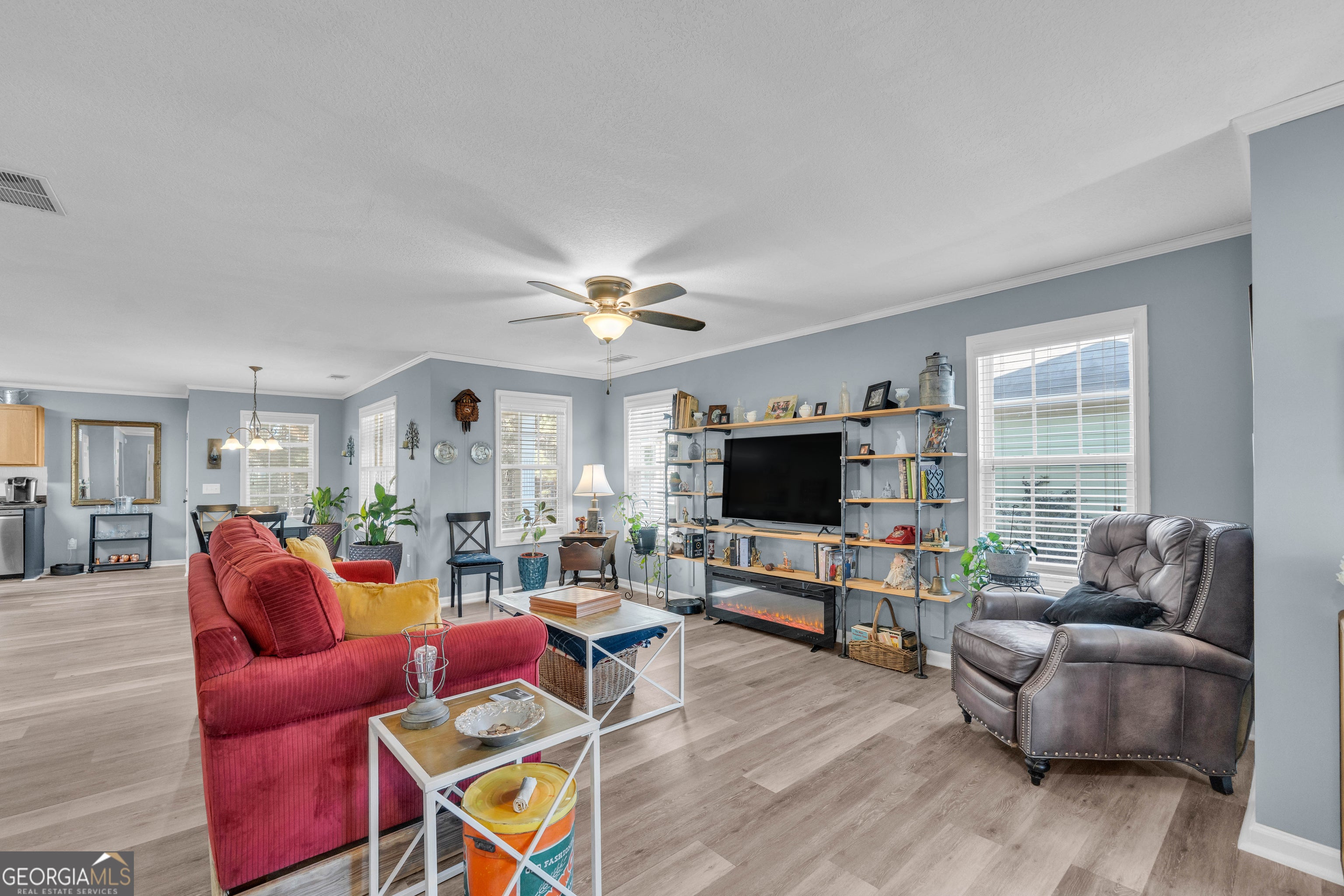 Welcome home to this inviting two-story residence featuring a charming front porch and exceptional indoor and outdoor living spaces. Thoughtfully designed with comfort and functionality in mind, this home offers a bright, open floor plan and impressive upgrades throughout. The open kitchen is ideal for both everyday living and entertaining, featuring a large island, walk-in pantry, and an abundance of cabinetry for exceptional storage. Adjacent to the kitchen, the dining area flows seamlessly into the family room, creating a welcoming space perfect for Saturday afternoon football gatherings, backyard BBQs, and entertaining friends and family. The family room is enhanced with custom built-in bookshelves and a cozy electric fireplace. There is no carpet in the home-durable, stylish wide-plank LVP flooring was added in 2021 on both levels, providing a cohesive and modern feel throughout. Crown molding runs throughout the entire main level, adding timeless character and elegance. Custom blinds have been installed on every window, allowing for both privacy and natural light. A guest bedroom and full bath on the main level offer flexibility and can easily serve as a home office or private guest suite. Upstairs living continues with ample space while maintaining the home's open and functional layout. Outdoor living truly shines with multiple entertaining areas, including a covered patio and a floating deck with a retractable canopy for shade on hot afternoons. The deck features built-in planters and a potting stand, creating a perfect blend of relaxation and functionality. Major systems have been thoughtfully updated, including a 3-year-old roof, a water heater just 6 months old, and an HVAC system less than one year old-providing peace of mind and energy efficiency for years to come. These are the kinds of upgrades typically found in homes priced hundreds of thousands more, making this property an exceptional value.