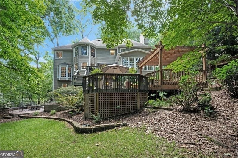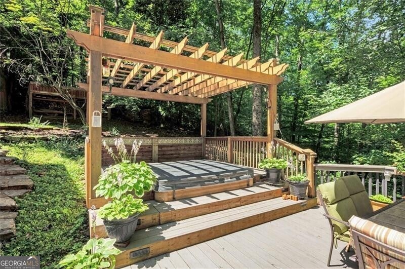 Welcome Home to Four-Season Living at Its Finest! This beautifully designed finished basement executive home is nestled deep on a spectacular 1.34-acre private lot on a quiet cul-de-sac street in Grove Park - a premier amenity-rich community known for its endless beauty, green space and ideal location minutes to everything, but seemingly miles away from it all! This wonderful home offers a fabulous open floor plan, comfort, charm, and entertainment-ready features make everyday living feel like a retreat. You'll experience scenic views and an abundance of outdoor living amenities beginning with the long and level tree-lined driveway, fragrant herb garden and wonderful wraparound rocking-chair front porch. Exceptional living spaces are standard features in this home. Step inside the welcoming two-story foyer while noticing the stunning hardwood flooring and triple crown moldings throughout the home. The foyer is flanked by a spacious main-level bedroom with private bath access and a living room/office space with large windows and scenic views. The heart of this lovely home includes a banquet-sized dining room and a large, bright, inviting chef's kitchen perfectly blending style and function with a gas range, endless granite counter-tops and cabinetry with soft-close drawers, a large breakfast area and bar, pantry and so much more. The kitchen is open to a magnificent family room with soaring ceilings and a two-story stacked stone, gas or wood-burning fireplace, and backstairs to the 2nd-floor! You'll fall in love with the adjoining sunroom offering stunning panoramic views of nature connecting you with the outdoors year-round. Upstairs, the owner's suite is a true retreat with a relaxing sitting area, more great views, beautiful hardwood floors, natural stone finishes, a walk-in shower, Jacuzzi tub, and a large closet. You'll also find roomy secondary bedrooms, a jack-and-jill bath and an upstairs laundry room on this level of the home. The finished terrace level is purpose-built for fun and function - perfect for game night, guests and multigenerational living. It includes a pool table, party kitchen, family/media room with gas log fireplace, bedroom/office, full bathroom, craft/hobby room, ample storage and a stone patio leading to an amazing backyard oasis including upper and lower decks perfect for grilling and gatherings, a brick patio with built-in benches ready for a cozy fire pit night, a built-in 6-person hot tub beneath a charming pergola, a sodded grassy area for recreation, a butterfly garden and a spring-fed creek - all with an incredible connection to the surrounding sights and sounds of nature. This home adapts to your lifestyle whether entertaining, relaxing, or working from home and offers beauty in every season. Welcome Home!