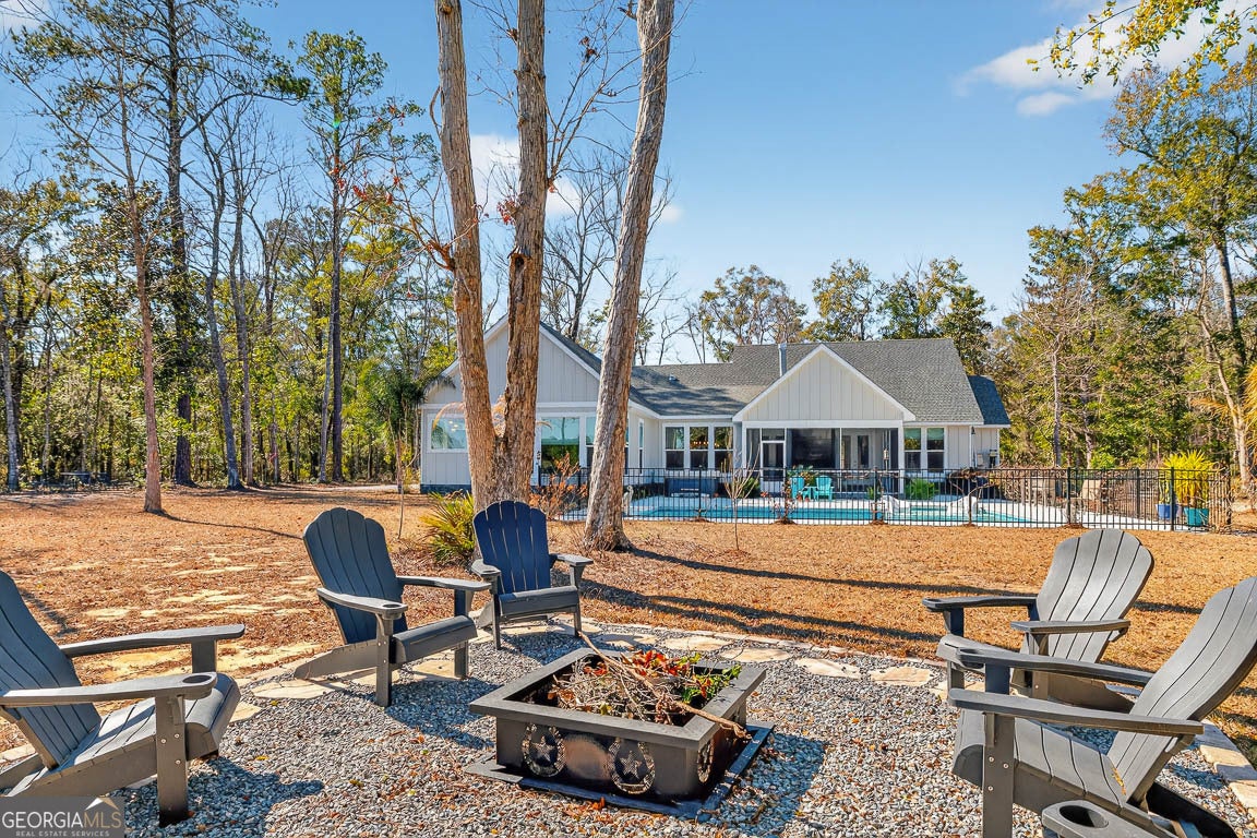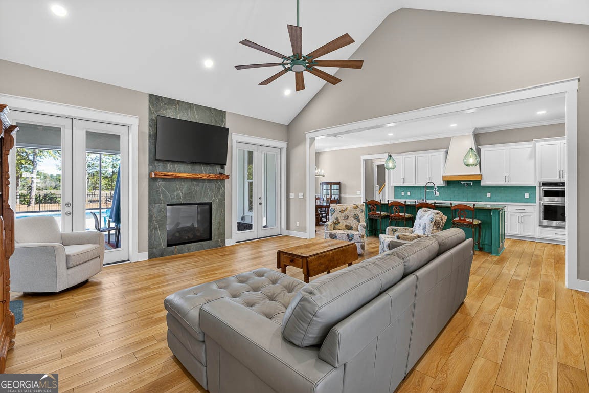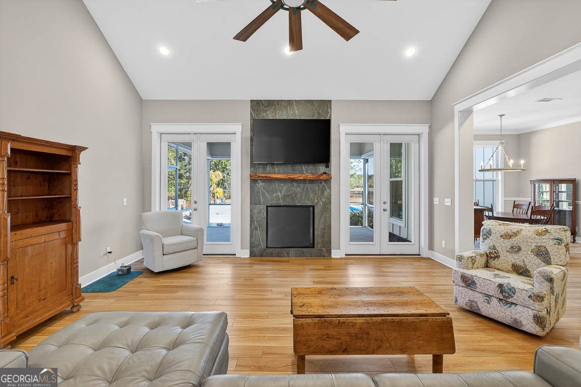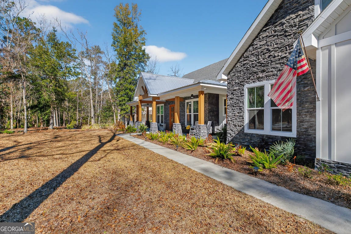 This remarkable deep-water retreat features 4 bedrooms and 3.5 bathrooms on a sprawling 0.81-acre lot, showcasing stunning views and an impressive orchard with 57 fruit trees. The home's stone and Hardiplank exterior is complemented by a large covered front porch that creates a warm and inviting first impression. Inside, a welcoming foyer leads to a private office or study and spacious living areas accented by beautiful hardwood floors throughout. The living room features vaulted ceilings and a cozy fireplace, creating an open yet comfortable gathering space filled with natural light. The kitchen is thoughtfully designed for both everyday living and entertaining, featuring a breakfast area, breakfast bar, center island, stainless steel appliances including double ovens, a separate cooktop with range hood, pot filler, and an oversized walk-in pantry. The primary suite provides a relaxing retreat with a spa-like ensuite bath complete with a soaking tub, large, tiled shower, double vanities, and a walk-in closet with built-in shelving. A well-equipped laundry room offers a sink, ample counter space, and cabinetry for added convenience. Upstairs, a large bonus room with a full bath provides flexible space for a guest suite, media room, or playroom. Outdoor living is just as impressive, with a spacious screened porch featuring its own fireplace, an in-ground swimming pool, fenced backyard, and fire pit - all perfectly positioned to enjoy the serene water views. A 3-car garage adds the finishing touch to this beautifully appointed home that blends comfort, functionality, and stunning waterfront living.