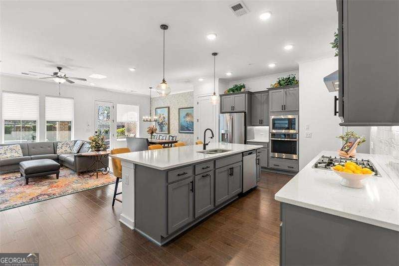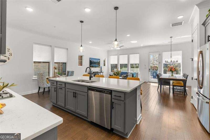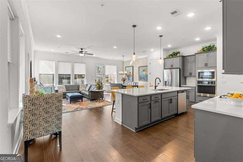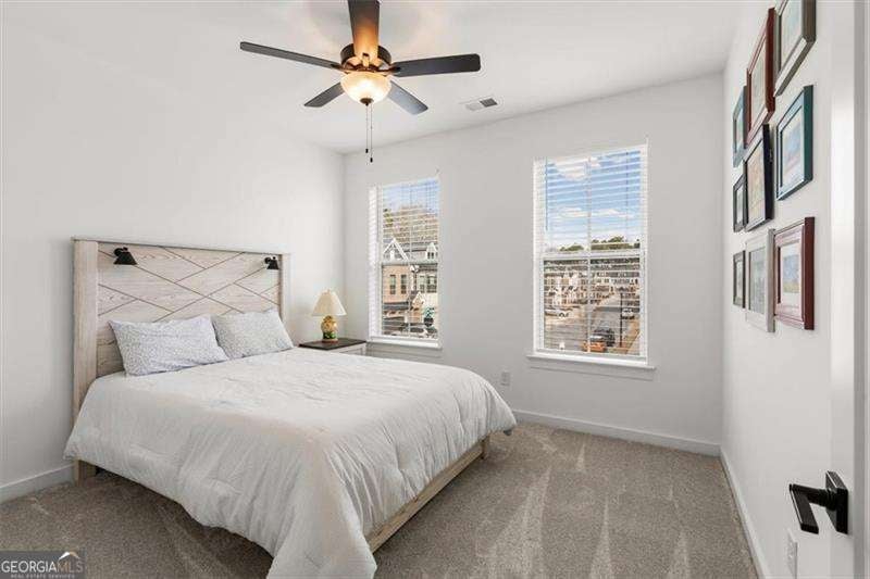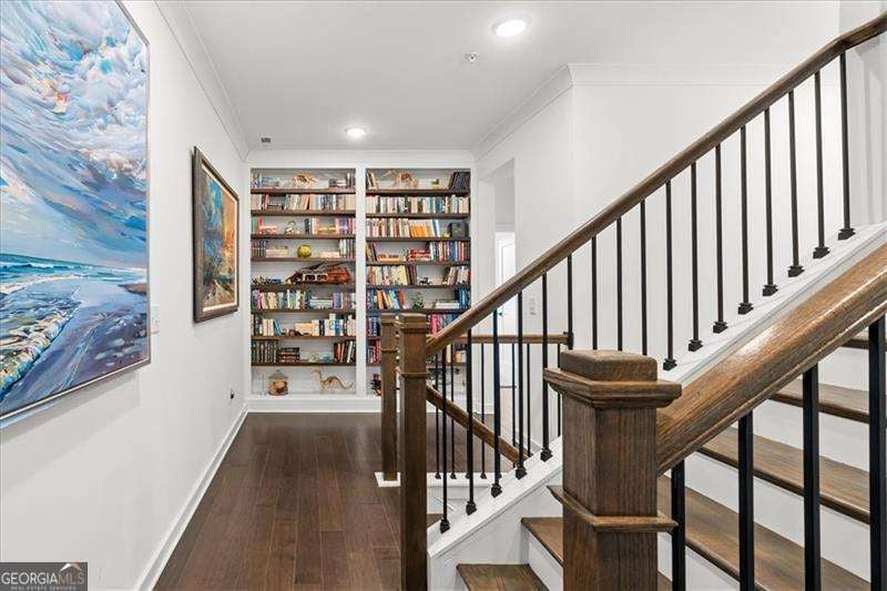 Lovingly maintained and truly move-in ready, this north-facing luxury end-unit townhome in the gated Ashbury community offers a light-filled, open-concept layout with 10-foot ceilings on the main level and three beautifully finished levels designed for comfortable, elevated living. The main living level features hardwood floors throughout and a seamless flow ideal for both everyday living and entertaining. The kitchen anchors the space with expansive counter space, making it well suited for meal prep, casual dining, and hosting. Just off the main floor, a covered and private patio has been landscaped to create a peaceful outdoor space for morning coffee or unwinding at the end of the day. The second floor includes custom built-in bookcases on the landing, new carpet in the secondary bedrooms, and a spacious primary suite complete with a private sitting area, new tile flooring in the primary bath and closet, and an oversized luxury shower. A private screened and enclosed balcony off the primary bedroom provides an additional outdoor retreat. The flexible layout includes three bedrooms, a third-story bonus room, two full baths, and two half baths, offering exceptional versatility across all three levels. The third-floor bonus room with a half bath is ideal for a media room, home office, fitness space, or additional living area. An attached two-car garage completes the home. Residents enjoy sidewalk-lined streets, a community pool with cabana, and a dog park, creating a low-maintenance lifestyle with resort-style amenities. Ideally located just minutes from Avalon, Downtown Roswell, the Alpha Loop, and North Point Mall, with easy access to GA-400 via Holcomb Bridge and Mansell Road for convenient commuting throughout North Fulton and beyond. Built by David Weekley Homes, this exceptional townhome combines refined finishes, quality construction, and lock-and-leave ease in a highly desirable location.
