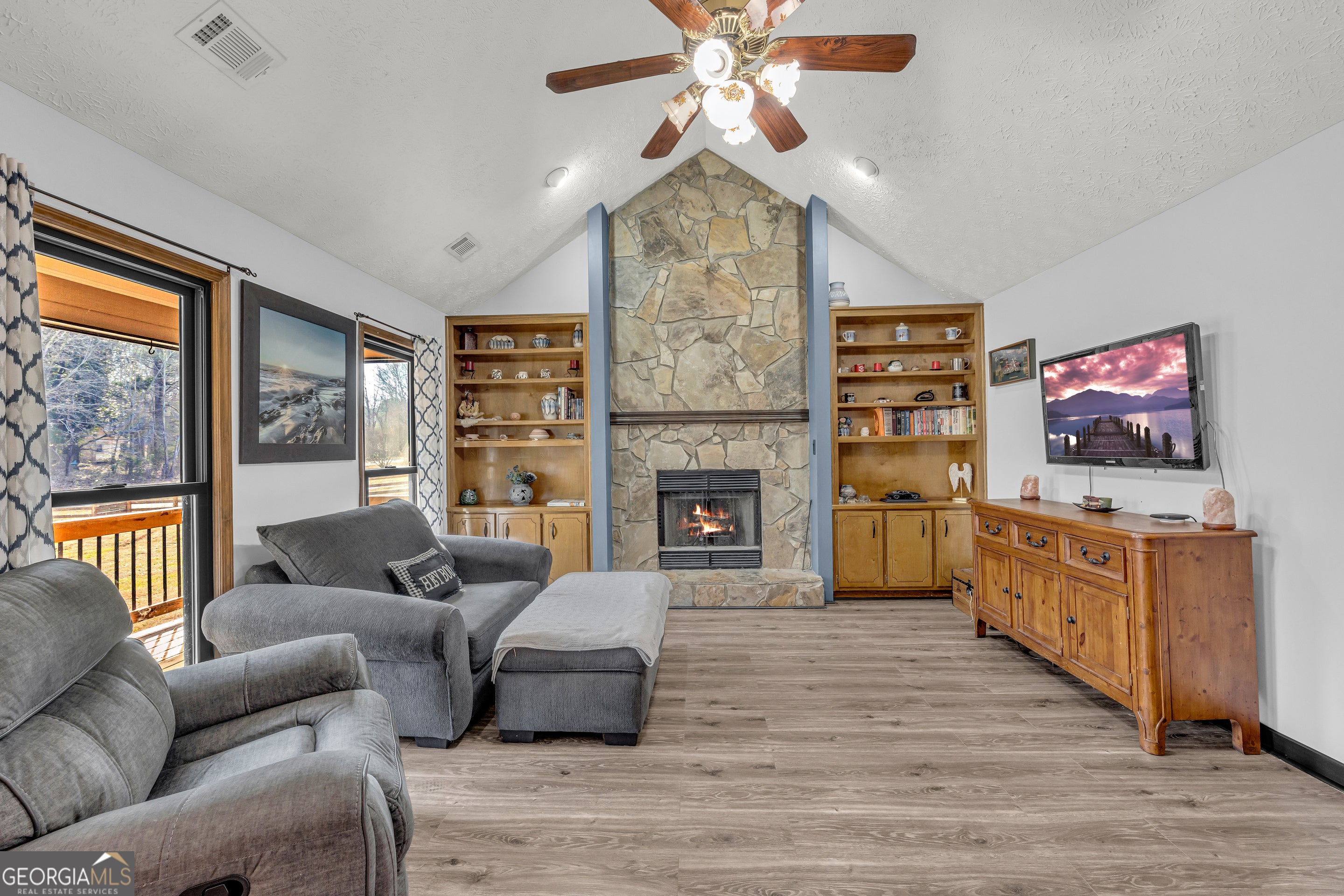 This is the kind of home that checks all the boxes-beautiful, flexible, well maintained, and ideally located. Sitting on just over an acre, this easy, one level living home offers 3 bedrooms, 2 bathrooms, and a bonus room. Inside, tall vaulted ceilings and an abundance of natural light create an airy, welcoming feel, anchored by a dramatic floor to ceiling stone fireplace with built in bookshelves on either side making it the true heart of the living space. A versatile bonus room provides the perfect flex space for a home theater, office, playroom, or hobby room. The bathrooms have been tastefully renovated with stylish tile showers, adding a fresh, modern touch. Outside, you will be equally as impressed with the spacious deck ideal for grilling and entertaining, to the incredible functionality of having a detached 16x32 building with air and an additional storage shed in the backyard. Major upgrades bring peace of mind, including a newer roof, brand-new HVAC, and an encapsulated crawlspace. Conveniently located near Hwy 316, this home offers easy access to both Athens and Atlanta while still delivering the privacy and breathing room that come with an acre of land.