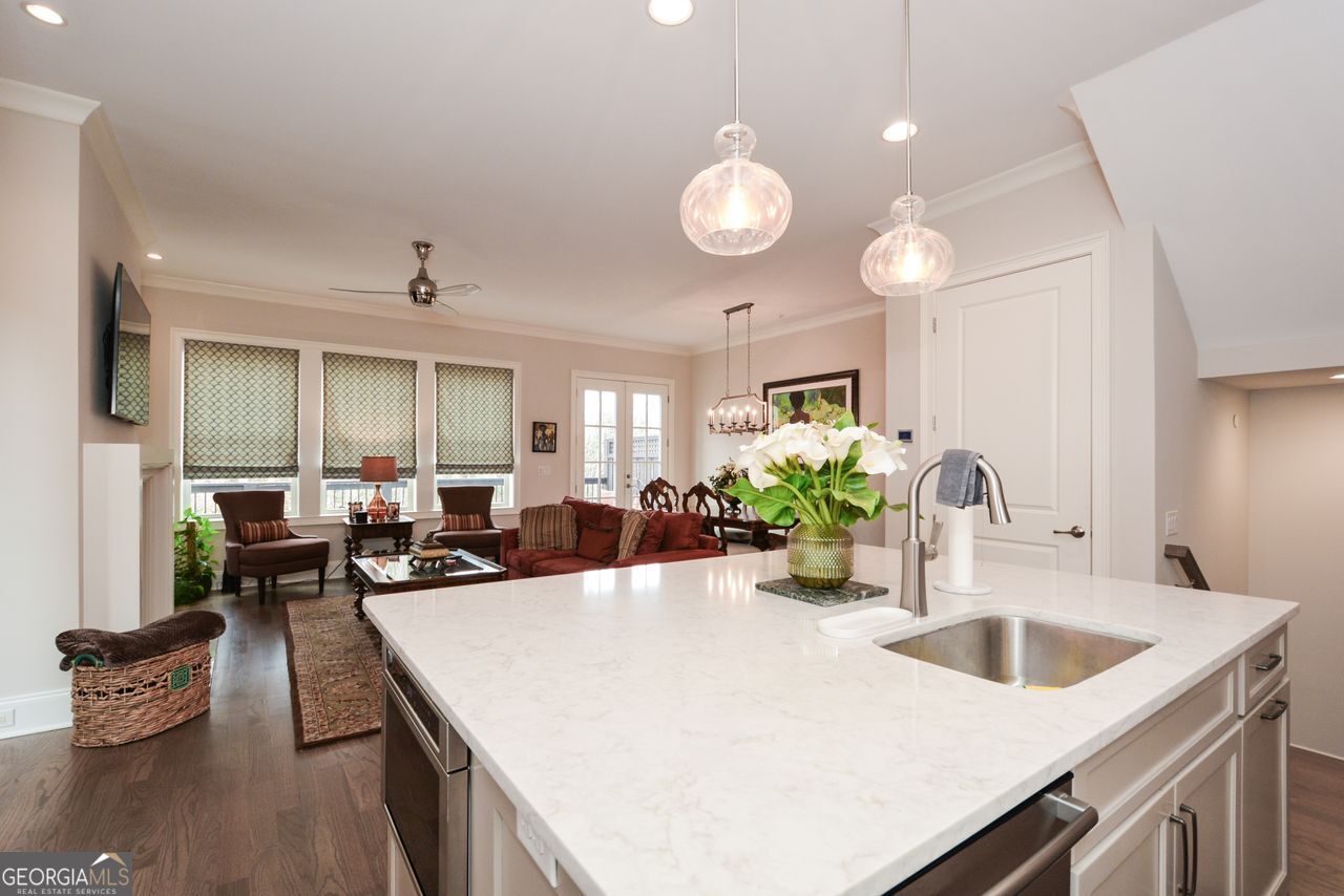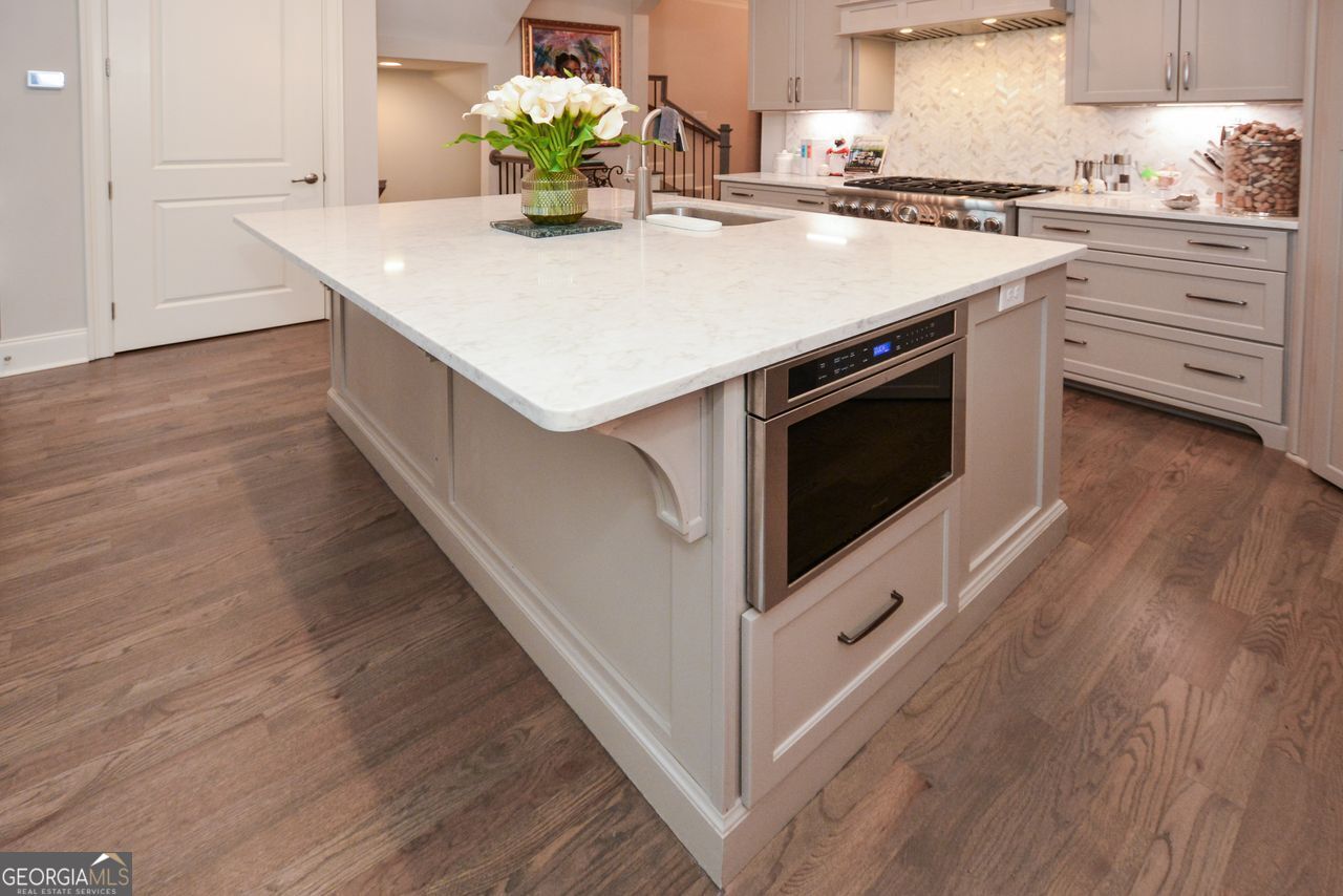 This hidden gem is located in the coveted Wildwood gated community. Surround yourself with luxury in a 3 bedroom, 3.5 bathroom, end-unit townhome. Formerly the Model Home for this JW Collection community. An easy access to both 285 and 75 corridors, yet nestled away within the Chattahoochee nature trails. As you enter the 2 story front foyer, you will see quality and upgrades at every turn including: upgraded moldings throughout, high-end custom flooring, drop zone, and top of the line kitchen appliances including Thermador Professional range. The main level boasts of a wrap around porch with a covered area and a cozy fireplace. Upstairs, the over-sized primary suite has serene views of the lush backyard, fireside sitting area and a spa-like primary bath with separate vanities, oversized step in shower and a free standing soaking tub. Additional bedroom upstairs is also large with walk-in closet and private bath. Large laundry room is well appointed. On the terrace level you will find the 3rd bedroom with private bath, plus a wet bar and additional living space. Don't miss the terrace level covered patio and private yard. Home is elevator ready. The one on kitchen level has electricity for extra beverage refrigerator. All other closets have custom upgrades including pantry by California Closets. Community features include: secure gated access, dog run, gathering area and private access to Chattahoochee Nature trails. Seller is open to selling furnishings and decor. The location is outstanding with a short drive to Truist Park and the Battery.