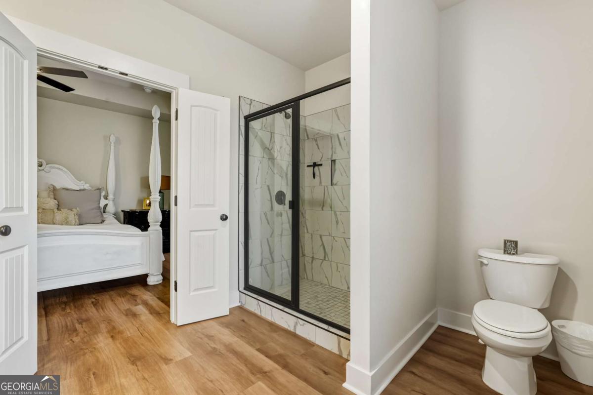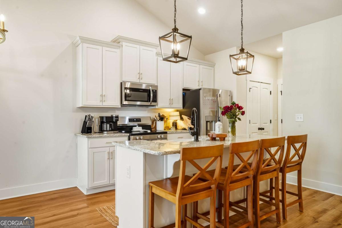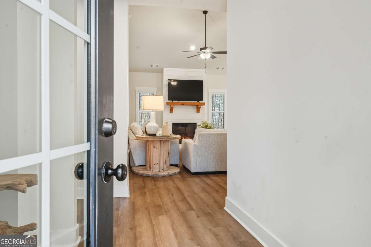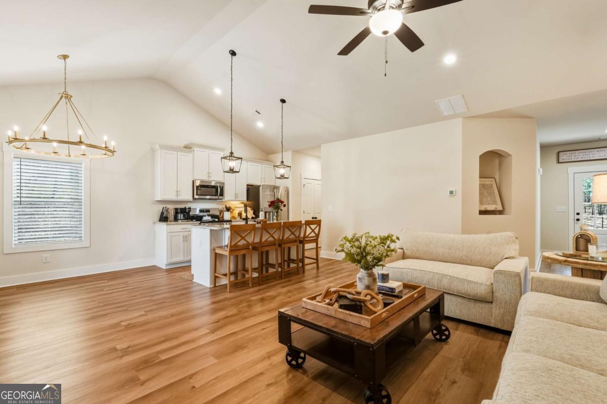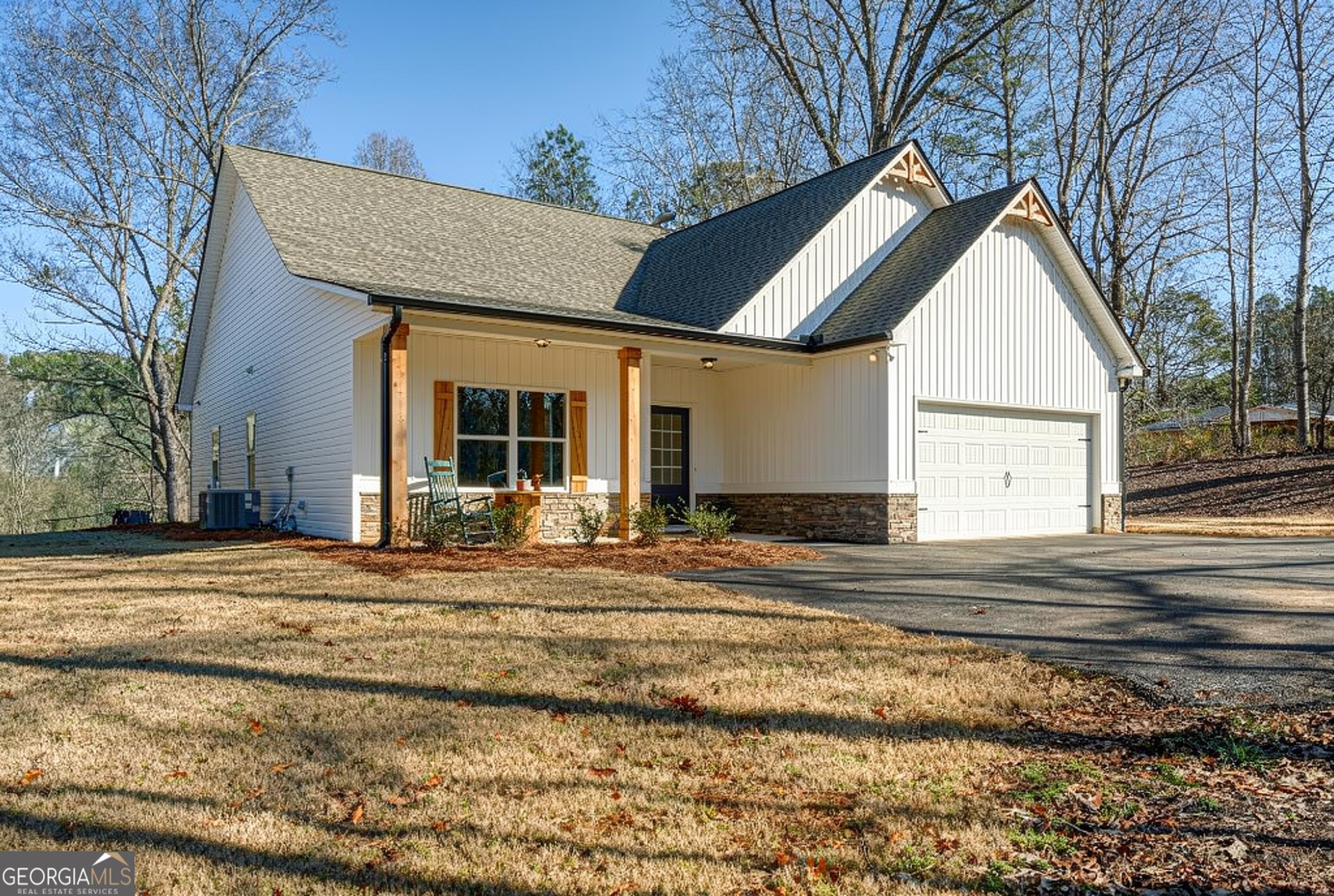 Welcome home to this practically brand-new 3-bedroom, 2-bathroom ranch, built in 2025 and nestled on 4.42 peaceful acres in Rockmart-complete with its own private pond. This one-owner home offers the perfect blend of modern comfort and country charm with a stepless Ranch, split-bedroom floor plan designed for both privacy and functionality. Inside, you'll love the open-concept kitchen, dining, and living area, ideal for everyday living and entertaining. The kitchen features a large island with seating, farmhouse sink, granite countertops, shaker cabinets, and stainless-steel appliances, all complemented by warm farmhouse-style finishes throughout. The living room is anchored by a cozy electric fireplace, creating an inviting gathering space. The spacious owner's suite includes a tile shower, double vanity, and a walk-in closet, while the secondary bedrooms are thoughtfully placed on the opposite side of the home. Step outside to enjoy the covered back patio, covered rocking-chair front porch, and a long driveway that opens to a beautifully cleared lot, offering privacy and endless possibilities. If you're looking for nearly new construction on acreage with charm, space, and serenity, this one checks every box.