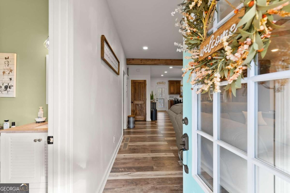 This beautiful custom Cape Cod-style home sits on a quiet road on a wooded .96-acre lot, only minutes from North Hall High School. A true rocking-chair front porch welcomes you home, while two full-length covered back porches offer peaceful views of the private backyard and plenty of space to relax or entertain. Inside, the home features three bedrooms and two and a half baths with an oversized master on the main level. The kitchen and both full baths include custom built cabinets, and the home is finished with solid wood interior doors and hardwood flooring throughout. Upstairs, both spacious bedrooms include large storage closets, offering great functionality and storage space. The home sits over a full daylight unfinished basement that is stubbed for a full bath and ready to be finished, giving you room to grow and add value. Everything in this home is in excellent condition and feels practically brand new, making it a move-in-ready option with quality craftsmanship and timeless style.