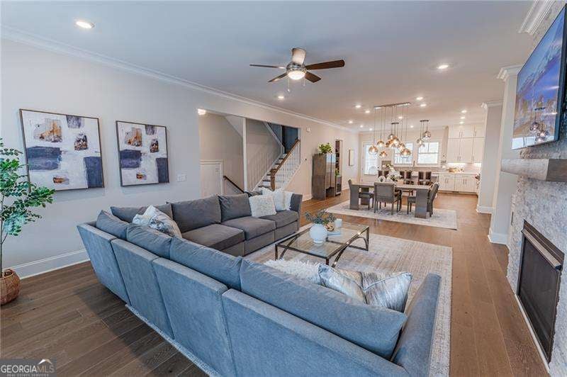 URBAN LIVING MEETS SUBURBAN TRANQUILITY! Perfectly situated in the heart of Downtown Alpharetta, near Town Green, Avalon, and Alpha Loop, this home offers a walkable lifestyle to it all! Ideal for those seeking top-rated dining experiences, shopping, an array of concerts and events, farmers markets and nearby parks. This nearly new single family home is beautifully designed across three floors. At the heart of the home, you will find a gourmet kitchen with high-end Wolf, Sub-Zero appliances, stunning quartz countertops with a sprawling island, ceiling-height cabinetry, pot filler, a smart vent hood and designer walk-in pantry. The kitchen opens seamlessly to the dining area and family room, highlighted by a gorgeous stone fireplace, soaring 10-foot ceilings, and an abundance of natural light. Completing this level are two outdoor covered balconies perfect for relaxing or entertaining, along with a convenient powder room. Upstairs, the owners suite features an ensuite bath with double vanities, oversized seamless glass shower with dual shower heads, coupled with custom walk-in closet. This level offers an additional two large bedrooms with walk-in closets, full bath, and a dedicated laundry room. The terrace level offers a full bath and finished flex space making it an ideal setting for movie nights, an exercise room, home office, or a potential fourth bedroom. Every detail of this courtyard home has been curated for elevated living with high-end finishes and thoughtful upgrades including stunning lighting, built-in cabinetry, drop zone and ample storage solutions . With HOA provided lawn maintenance, this incredible community exemplifies a stress-free lock-and-leave lifestyle. Located in the highly sought after Manning on the Square with Top North Fulton schools.