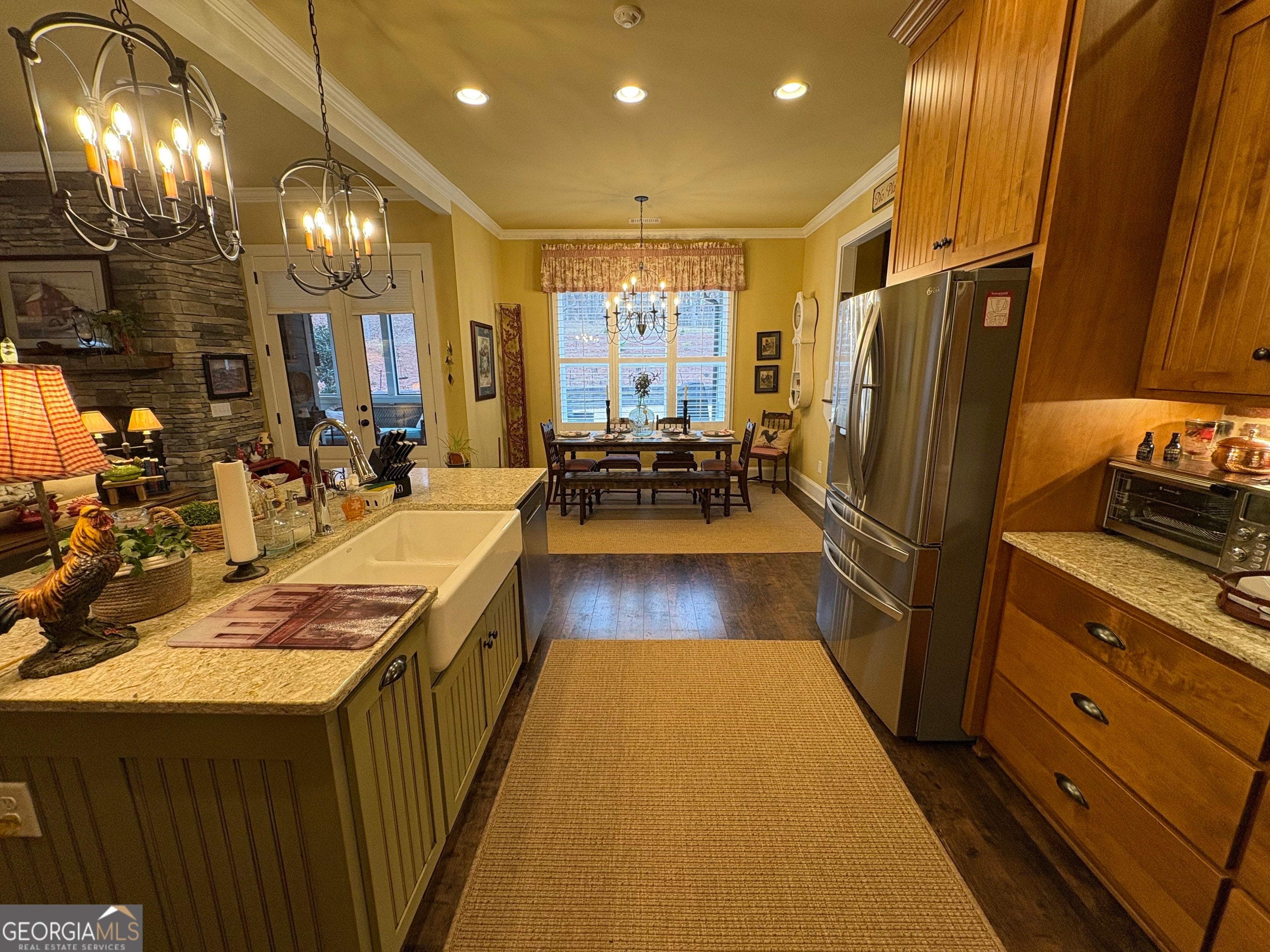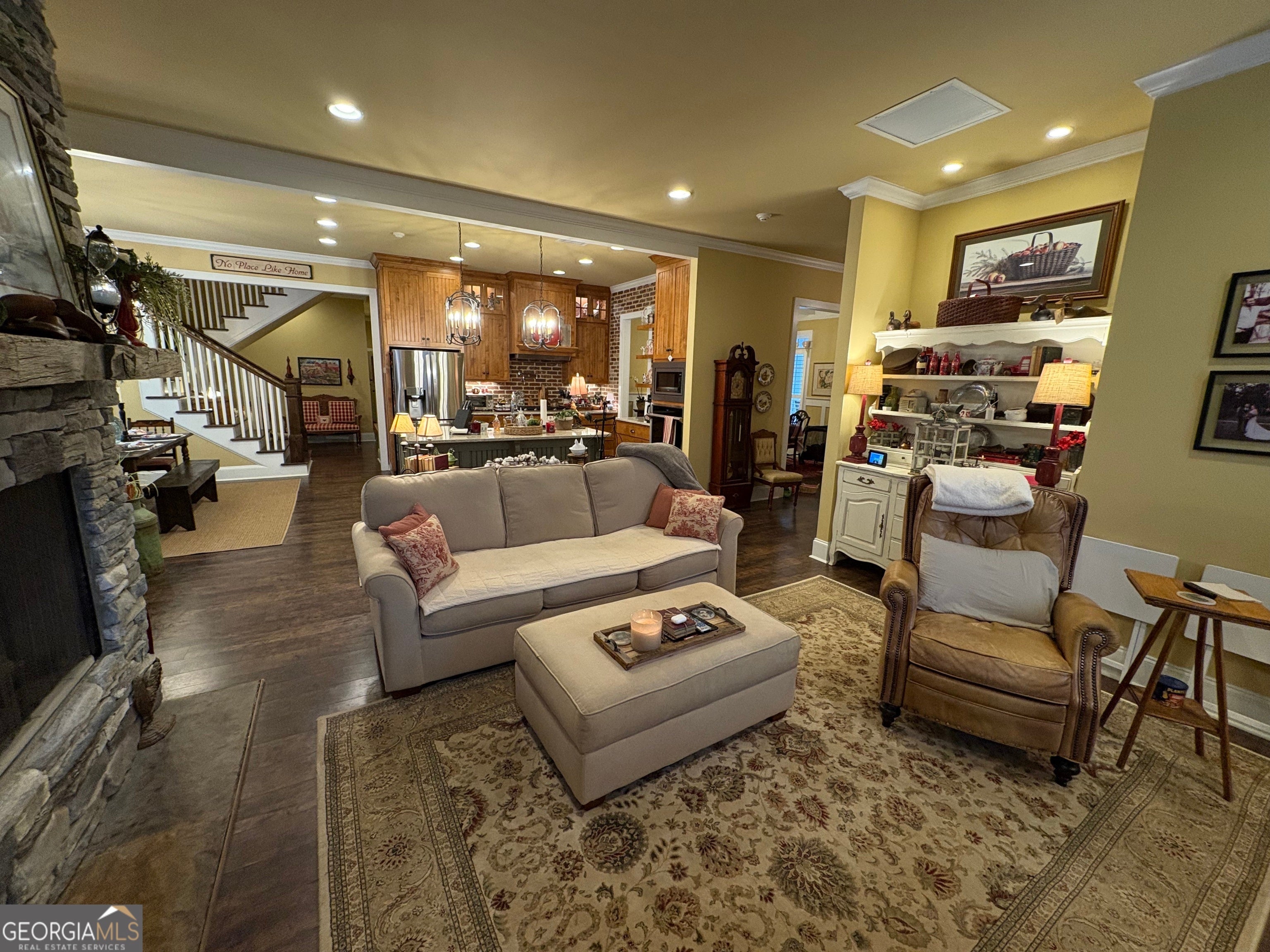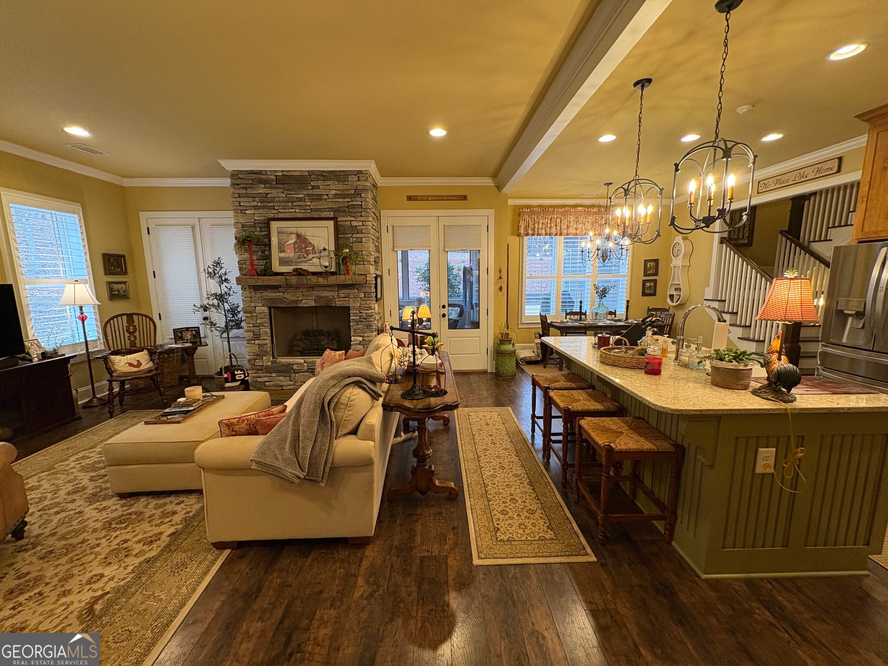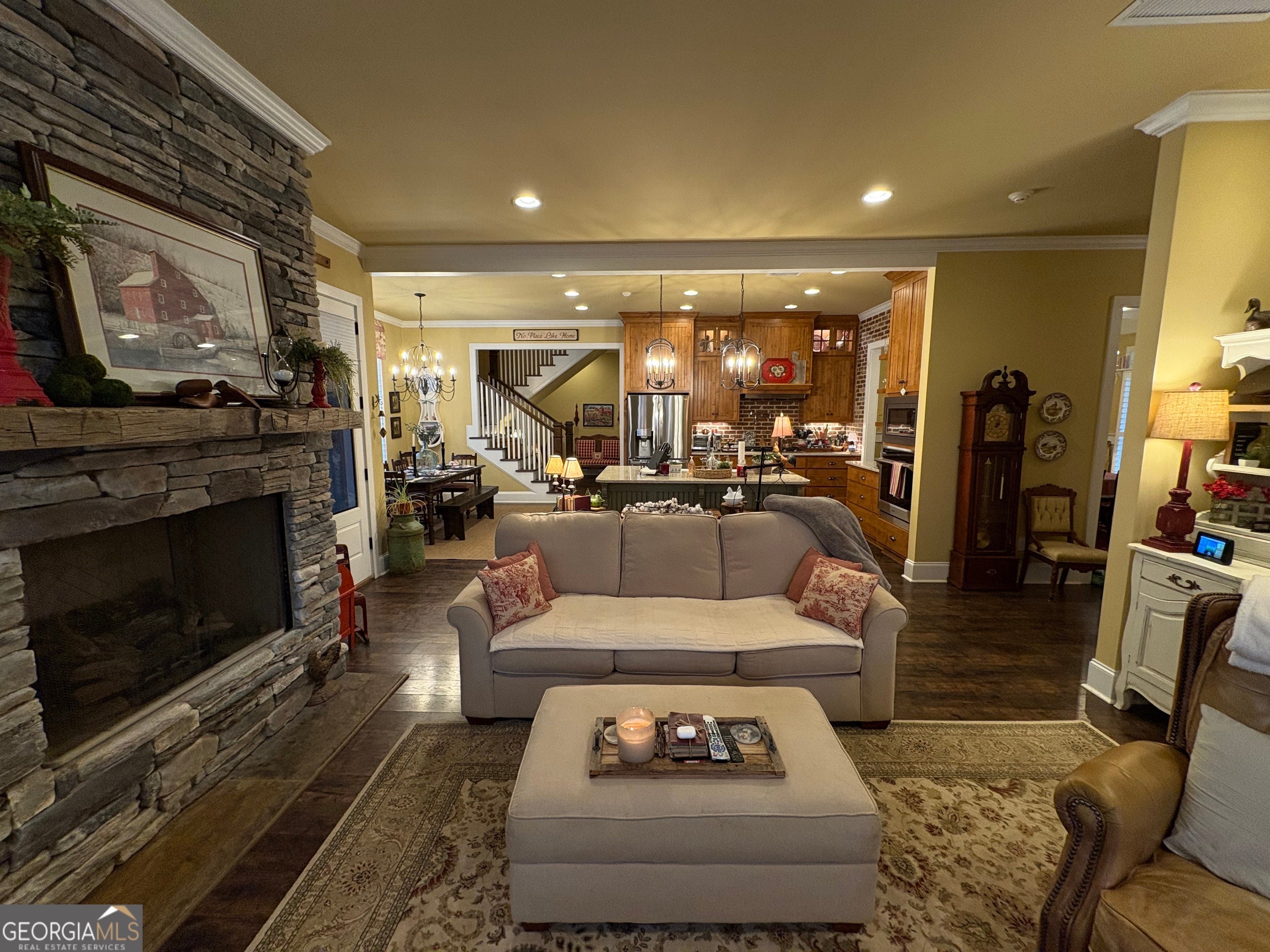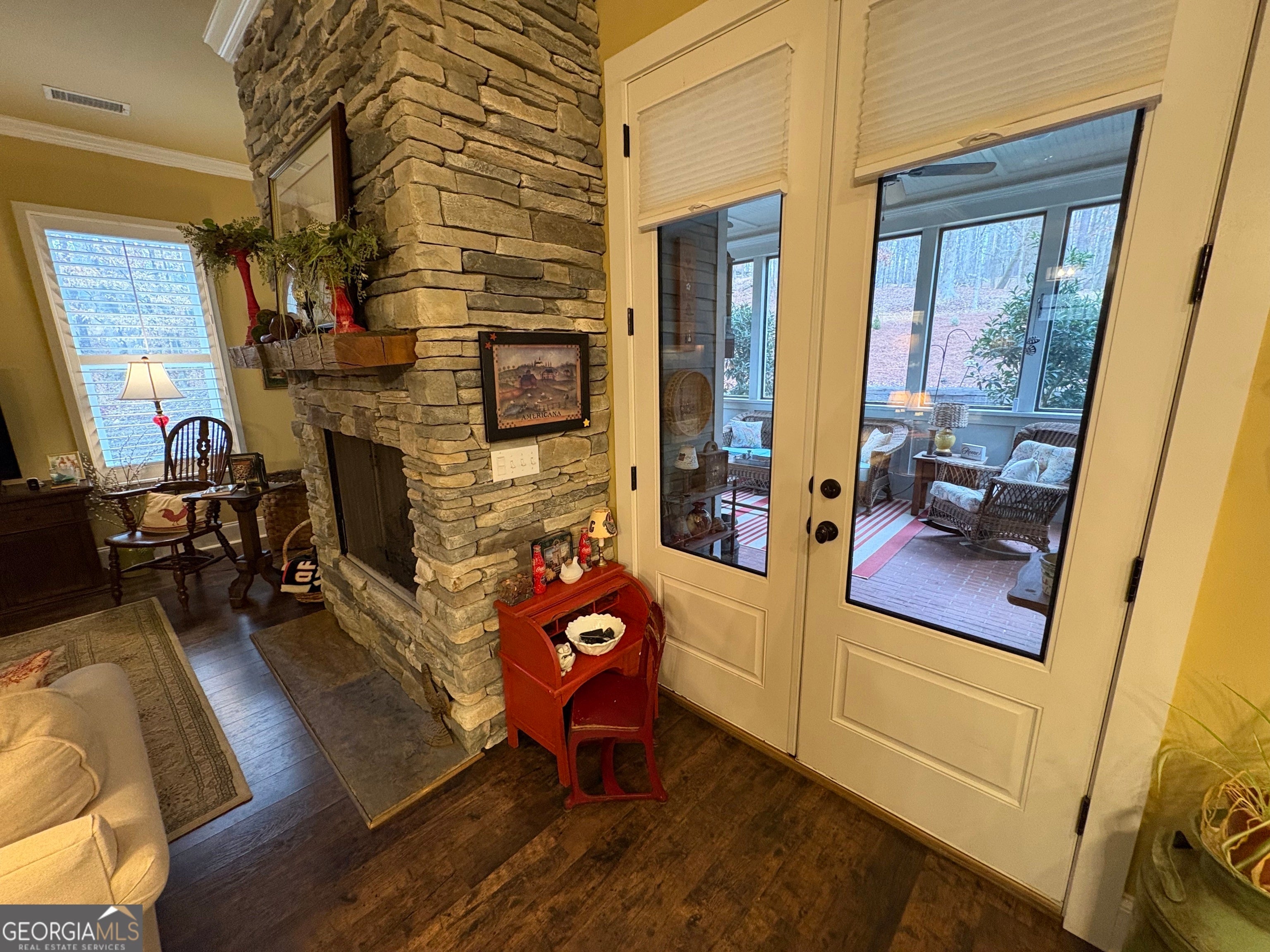 Tucked away on a serene two-acre wooded lot, this stunning property offers privacy, charm, and exceptional flexibility. The main home showcases timeless Craftsman details, beamed vaulted ceilings, and a cozy yet open great room anchored by a stone fireplace. The kitchen is designed for gathering, featuring a central island, breakfast area, and classic brick surrounds that add warmth and character. A separate dining room with elegant coffered ceilings provides a refined space for entertaining. Enjoy peaceful views from the expansive screened-in porch with stone fireplace, perfectly positioned to take in the natural setting. The thoughtfully designed floor plan includes a first-floor owner's suite retreat, private office, and additional bedroom and bath on the main level. Upstairs, you'll find an additional office space and two more bedrooms connected by a Jack-and-Jill bath-ideal for work-from-home needs or guests. A private, connected residence offers its own front and garage entrances, a great room with kitchen dining & living areas, two additional bedrooms and a bath, a private screened porch, and includes ADA features, making it perfect for multigenerational living, guests, or rental opportunities. A rare combination of beauty, comfort, and versatility in a truly gorgeous private setting.