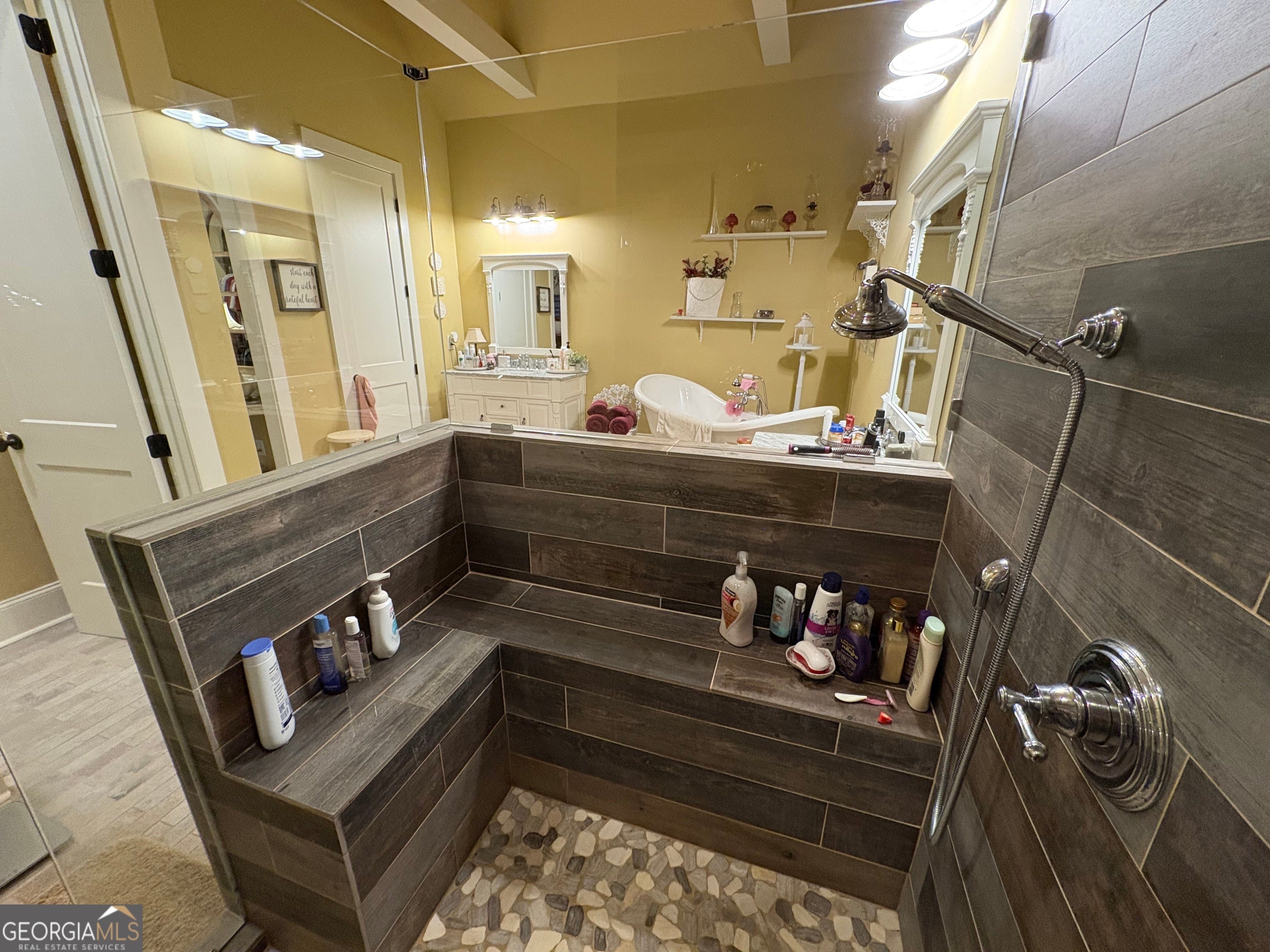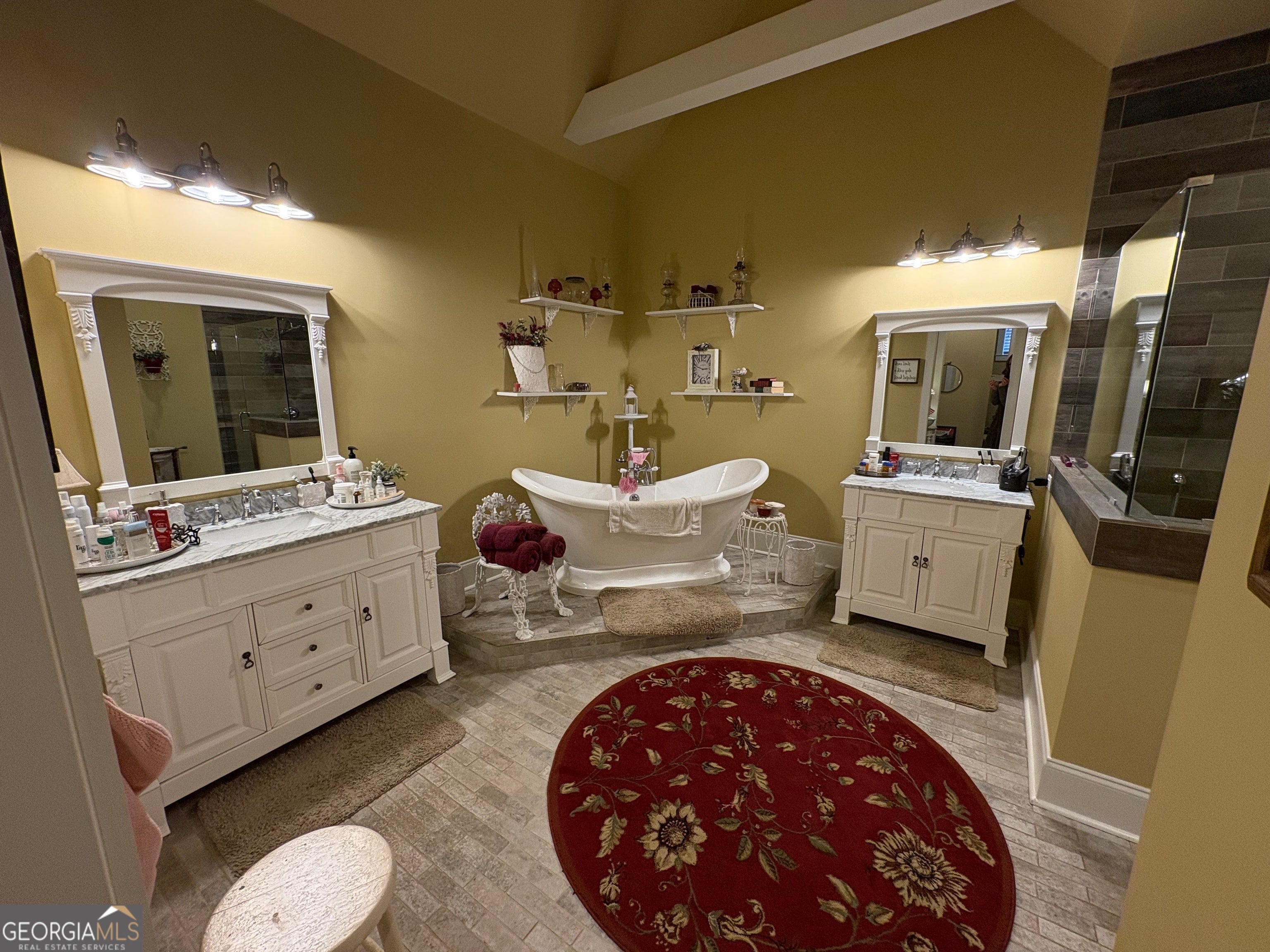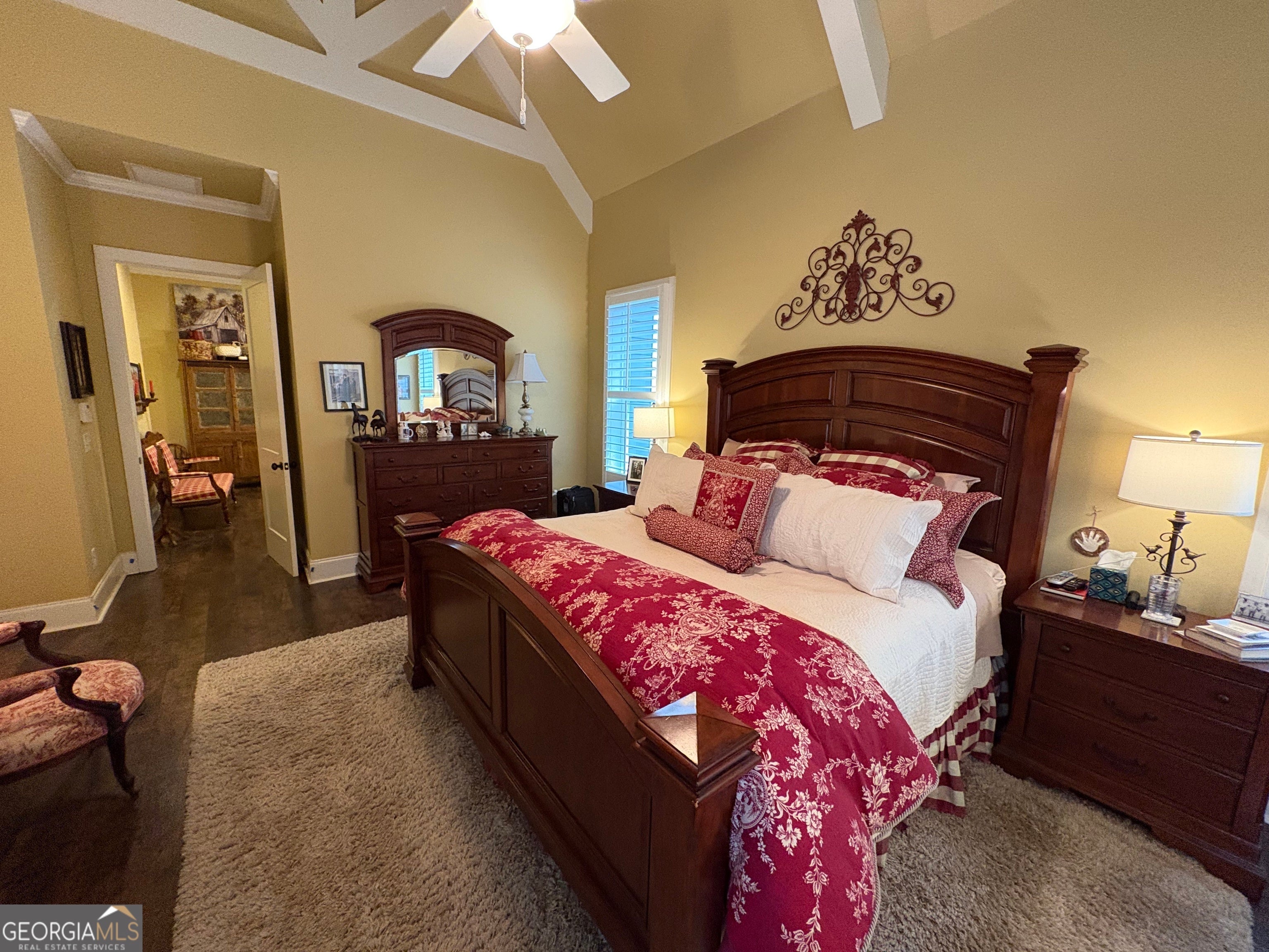 - Interior FeaturesBeamed Ceilings, Double Vanity, High Ceilings, Master On Main Level, Separate Shower, Soaking Tub, Vaulted Ceiling(s), Walk-In Closet(s), In-Law Floorplan