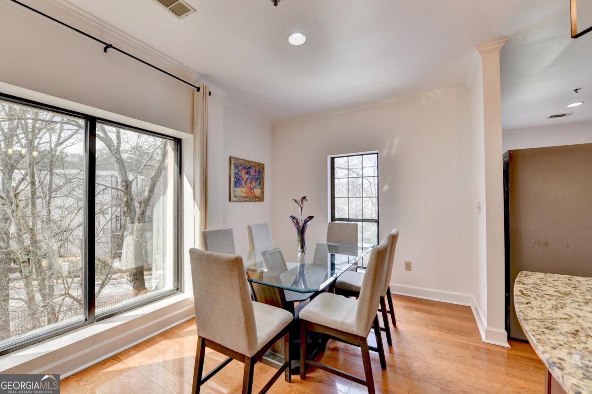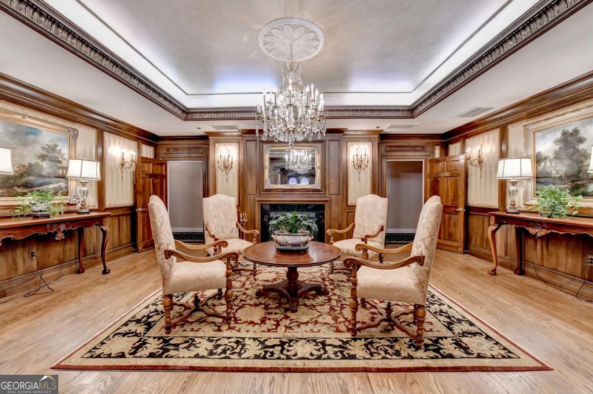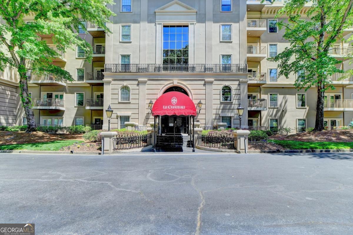 Welcome home to this Lenox Road gem in the heart of Buckhead. Nestled within the gated Le Chateau community, this elegant residence offers two deeded garage parking spaces, 24/7 concierge service, and resort-style amenities including a saltwater swimming pool, community grill, fitness center, business center, and beautifully landscaped, pet-friendly green spaces. Step inside this end unit to gleaming hardwood floors and expansive windows that flood the home with natural light. The inviting living room features a gas-log fireplace framed by custom built-in bookcases with glass shelving-perfect for cozy evenings or stylish entertaining. The updated kitchen shines with granite countertops, stone backsplash, and stainless steel appliances, and includes a pantry, breakfast area, and additional built-in storage. Just beyond, the private balcony overlooks serene pool and garden views. The dining area sits adjacent to the kitchen and is wrapped in large windows, creating a bright and airy setting for everyday meals or special occasions. The oversized primary suite offers dual walk-in closets and a spa-inspired ensuite with double vanities, jetted soaking tub, separate shower, linen closet, and tile floors. A second bedroom-ideal for guests or a home office-features its own full bath and double closets. The laundry is conveniently located nearby, and a powder room welcomes guests off the entry hall. Updated light fixtures throughout add a modern touch. This non-smoker, pet-free home has been lovingly maintained. Enjoy unbeatable convenience just minutes from Lenox Mall, Phipps Plaza, Salesforce, and major Buckhead employers-shorten your commute and elevate your lifestyle. HOA fees include gas, internet, cable, trash, and all amenities. Brand new refrigerator. Guest parking is available in front. Elegant, inviting, and centrally located-this is Le Chateau living at its finest.
