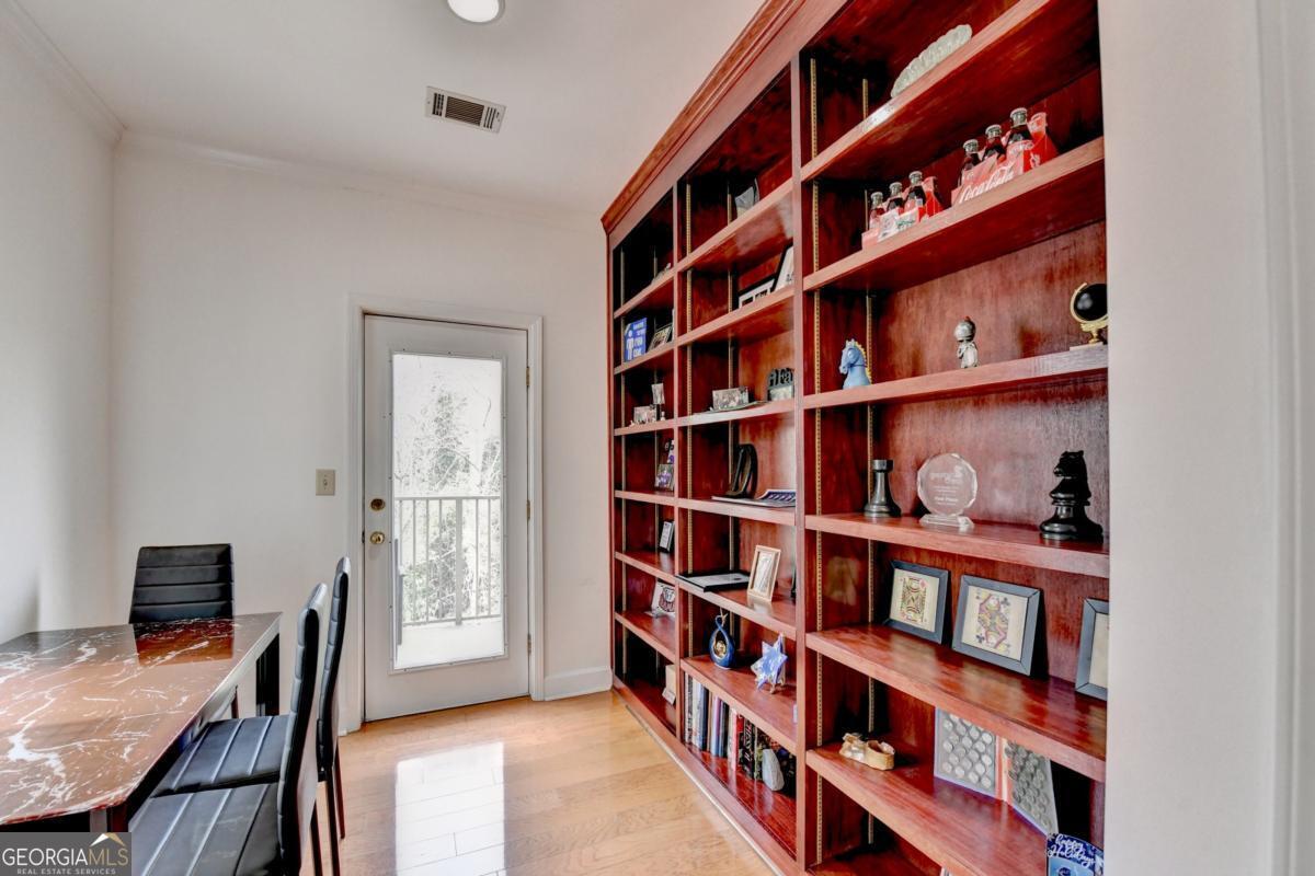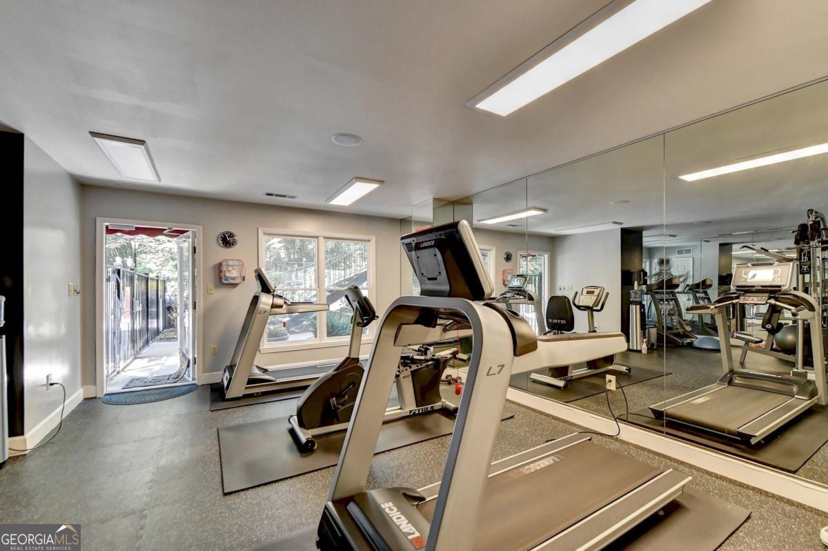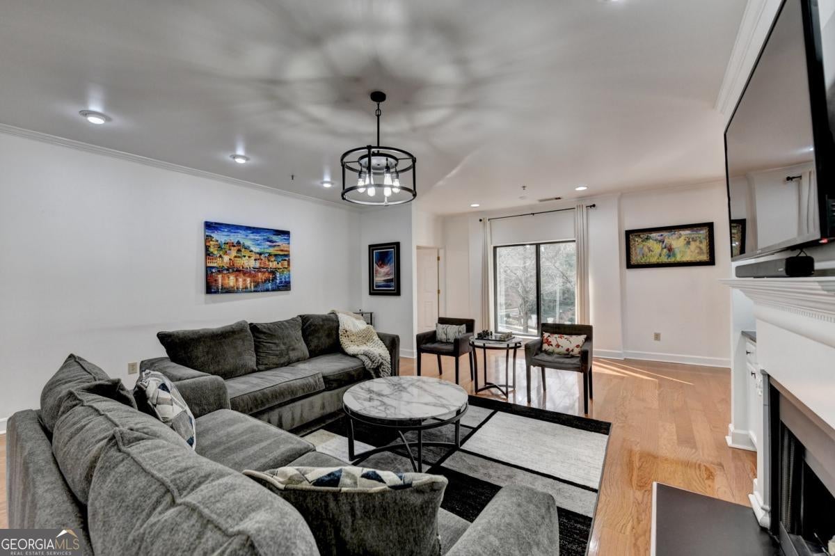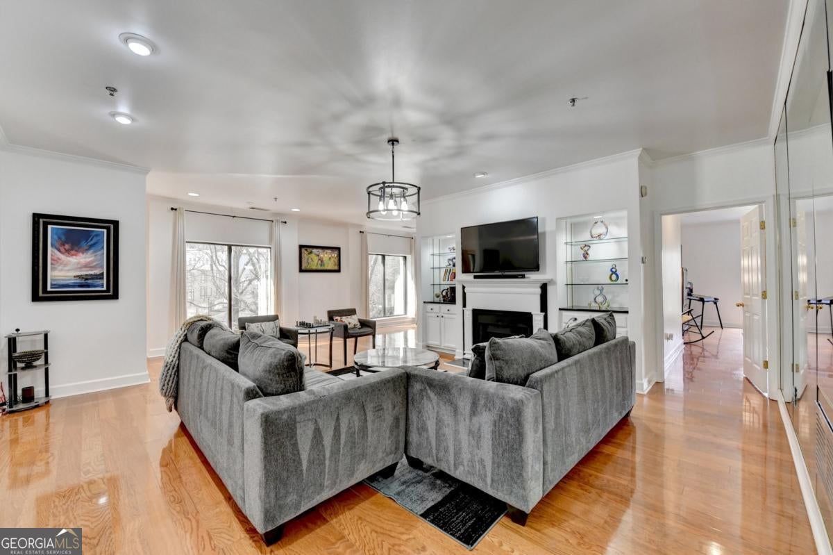 Welcome home to this Lenox Road gem in the heart of Buckhead. Nestled within the gated Le Chateau community, this elegant residence offers two deeded garage parking spaces, 24/7 concierge service, and resort-style amenities including a saltwater swimming pool, community grill, fitness center, business center, and beautifully landscaped, pet-friendly green spaces. Step inside this end unit to gleaming hardwood floors and expansive windows that flood the home with natural light. The inviting living room features a gas-log fireplace framed by custom built-in bookcases with glass shelving-perfect for cozy evenings or stylish entertaining. The updated kitchen shines with granite countertops, stone backsplash, and stainless steel appliances, and includes a pantry, breakfast area, and additional built-in storage. Just beyond, the private balcony overlooks serene pool and garden views. The dining area sits adjacent to the kitchen and is wrapped in large windows, creating a bright and airy setting for everyday meals or special occasions. The oversized primary suite offers dual walk-in closets and a spa-inspired ensuite with double vanities, jetted soaking tub, separate shower, linen closet, and tile floors. A second bedroom-ideal for guests or a home office-features its own full bath and double closets. The laundry is conveniently located nearby, and a powder room welcomes guests off the entry hall. Updated light fixtures throughout add a modern touch. This non-smoker, pet-free home has been lovingly maintained. Enjoy unbeatable convenience just minutes from Lenox Mall, Phipps Plaza, Salesforce, and major Buckhead employers-shorten your commute and elevate your lifestyle. HOA fees include gas, internet, cable, trash, and all amenities. Brand new refrigerator. Guest parking is available in front. Elegant, inviting, and centrally located-this is Le Chateau living at its finest.