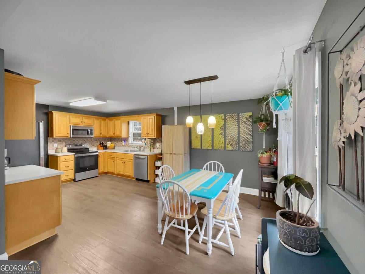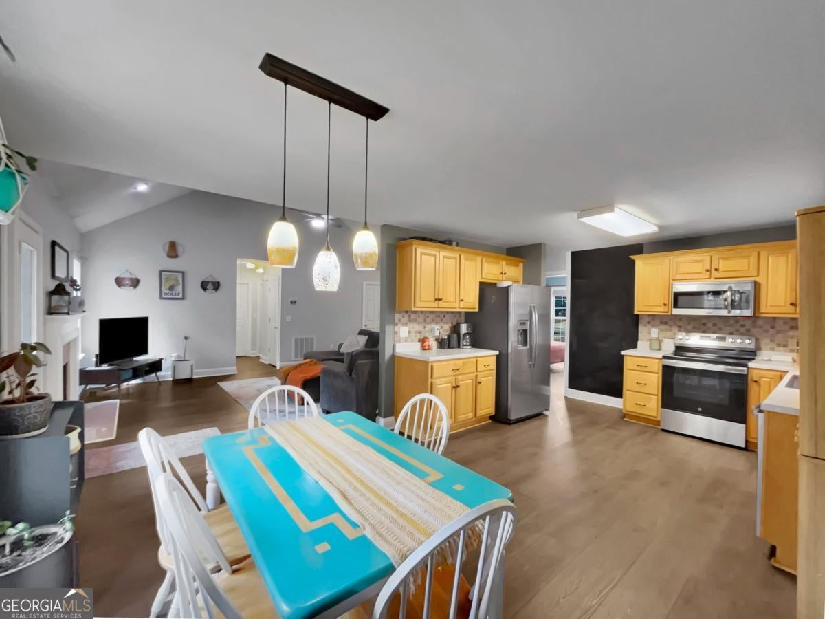 Tucked away in East Athens Woodgrove community and within a couple miles to the UGA Veterinary Teaching Hospital is a perfectly maintained ranch offering comfort, style, and convenience all in one. From the moment you're welcomed inside, you'll notice the thoughtful updates that make this single-level home shine. Luxury vinyl plank flooring flows through the entire home, complemented by curated paint colors, decorative lighting, and inviting finishes throughout. The easy-living layout centers around a vaulted great room with a cozy fireplace seamlessly connecting to the spacious eat-in kitchen-creating the ideal footprint for everyday living or entertaining. Natural light fills the dining area, boasting a sunlit space that easily accommodates seating for six or more. The kitchen itself is a standout, featuring generous space, ample wood cabinetry storage accented by a tile backsplash, expansive counter space, and stainless steel appliances. A split bedroom plan provides privacy, with the owner's suite located toward the front of the home. Each bedroom offers durable LVP floors and roomy closets, while the owner's retreat includes extra space, vaulted ceilings and a well-appointed en-suite bath. Outdoor living is just as inviting. The spacious rear deck overlooks the fenced rear yard and provides the perfect backdrop for dining al-fresco or enjoying time outdoors. This move-in ready gem offers condition, convenient location and thoughtful details providing foundation for your next home!