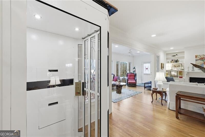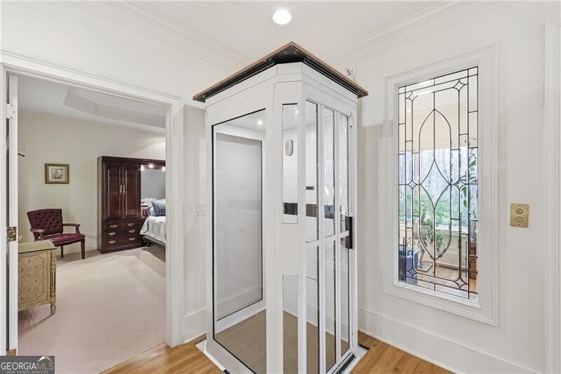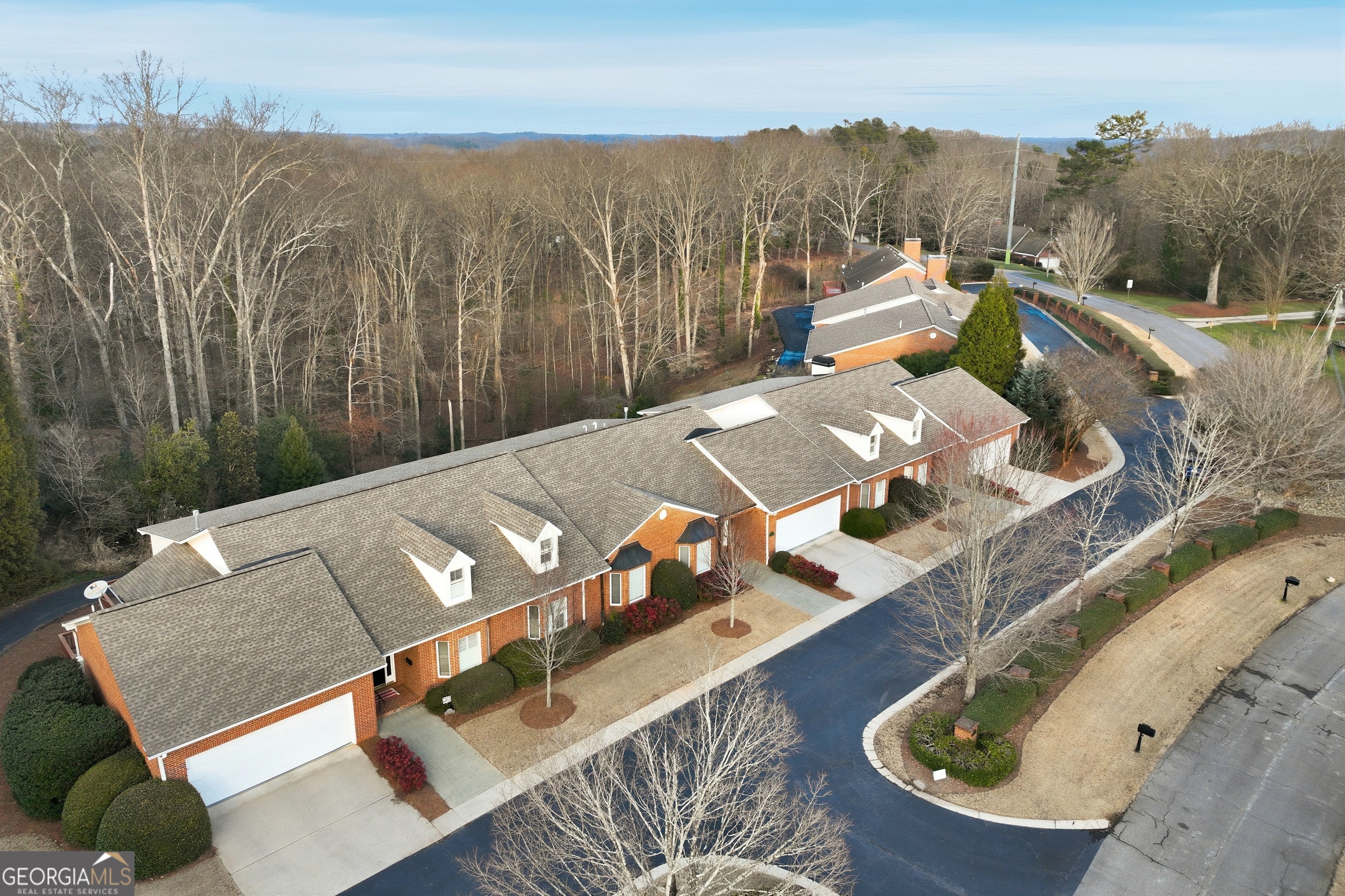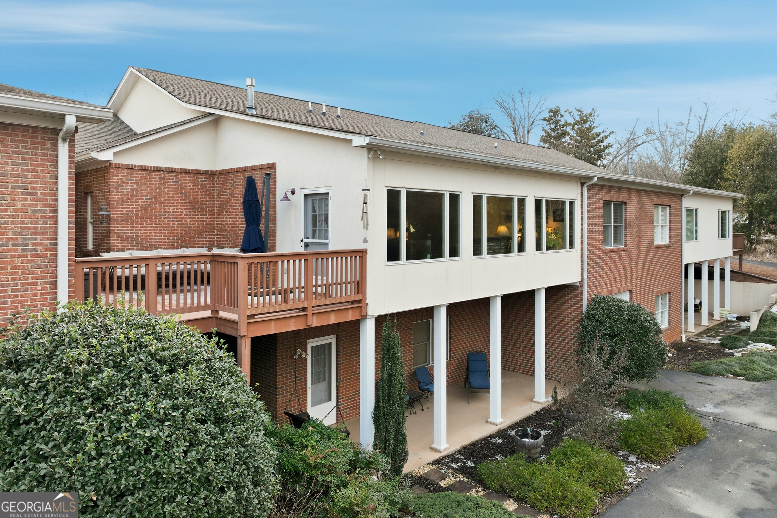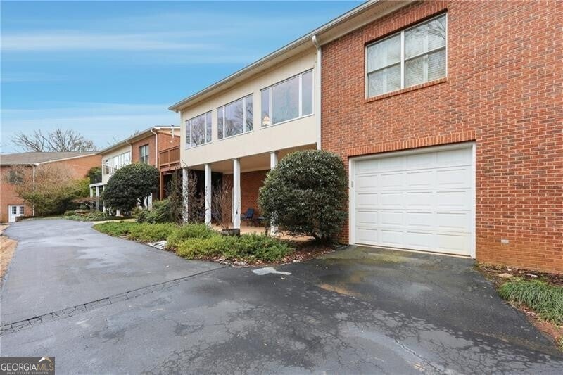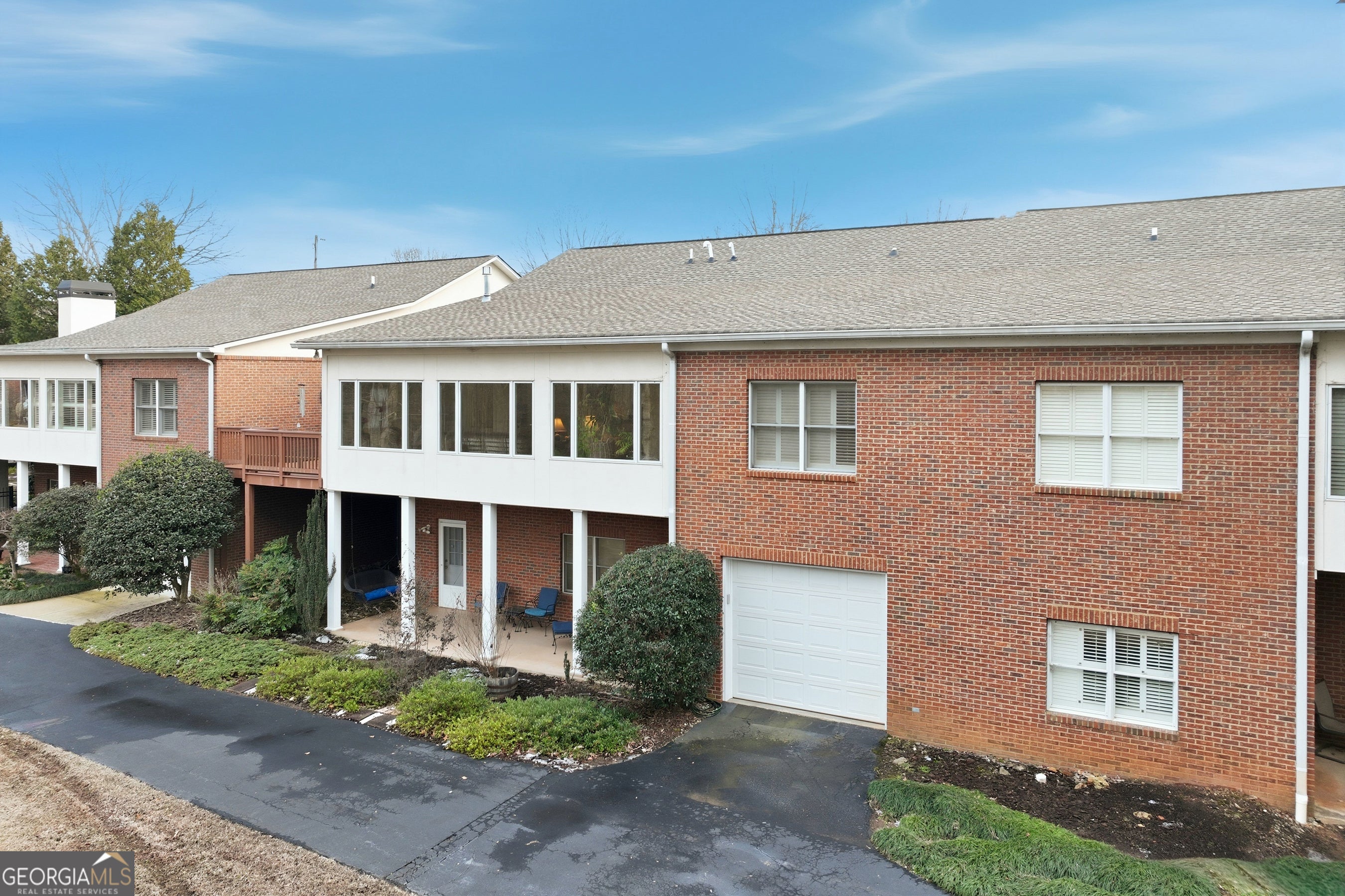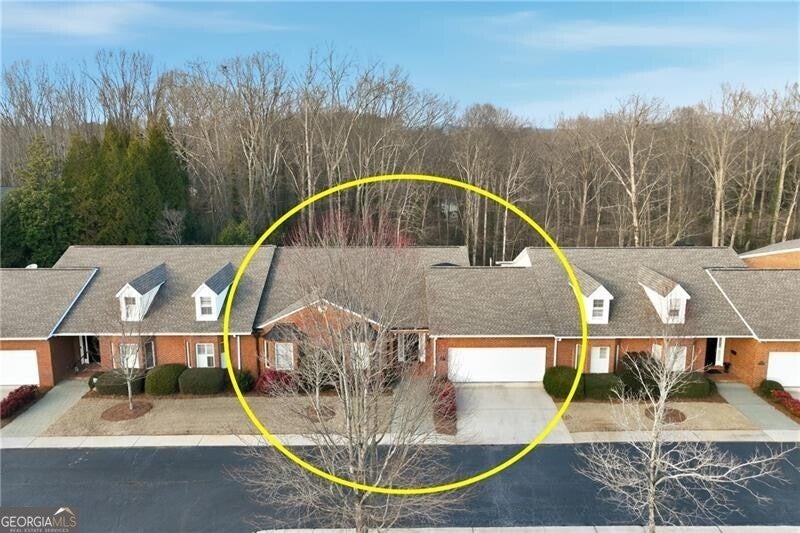 Well-designed and thoughtfully curated, this inviting condo just north of Gainesville offers easy living with room to grow. The main level features two bedrooms plus a study. The spacious primary suite has an accessible, walk-in shower and a custom walk-in closet with built-ins. Plantation shutters add warmth throughout, while the sunroom spans the rear of the home and opens to a sun deck overlooking nature - peaceful woods and wildlife. A private drive leads to the rear of the home and provides access to the lower-level garage. The main-level garage has ramp for accessibility and the built-ins include a Sub-Zero refrigerator for extra cold storage (The kitchen refrigerator, washer and dryer and outdoor furniture will remain with other furnishings negotiable). An elevator connects the main level to the terrace level, where you'll find a finished third full bath and an expansive unfinished space-ideal for future expansion, a workshop, or studio. Convenient to golf, Chattahoochee Country Club, shopping, and medical services, this home is perfectly suited for those looking to downsize without sacrificing space, storage, or serenity.