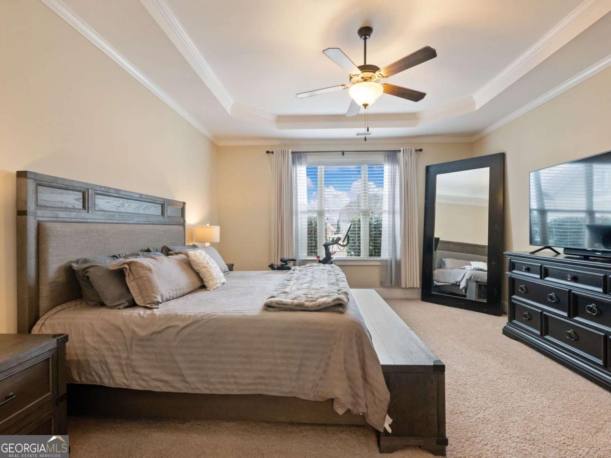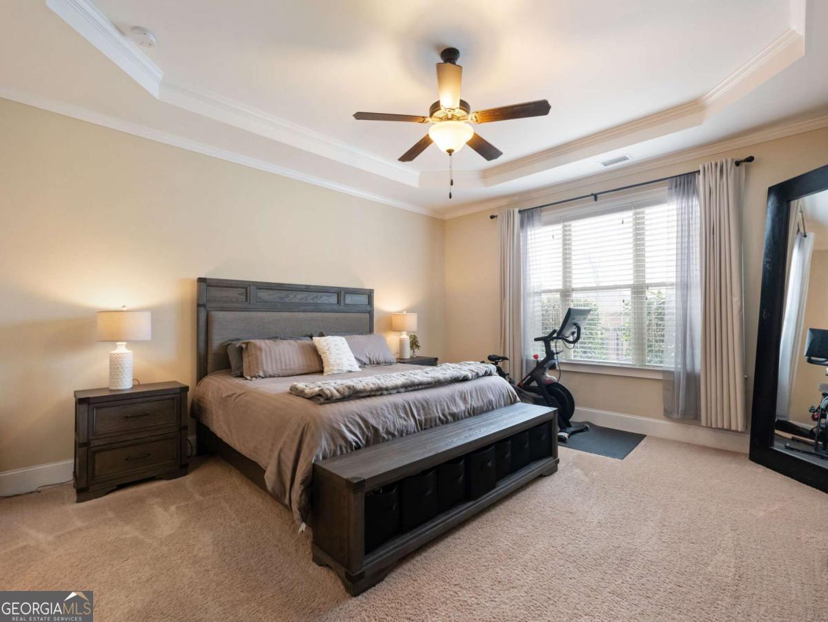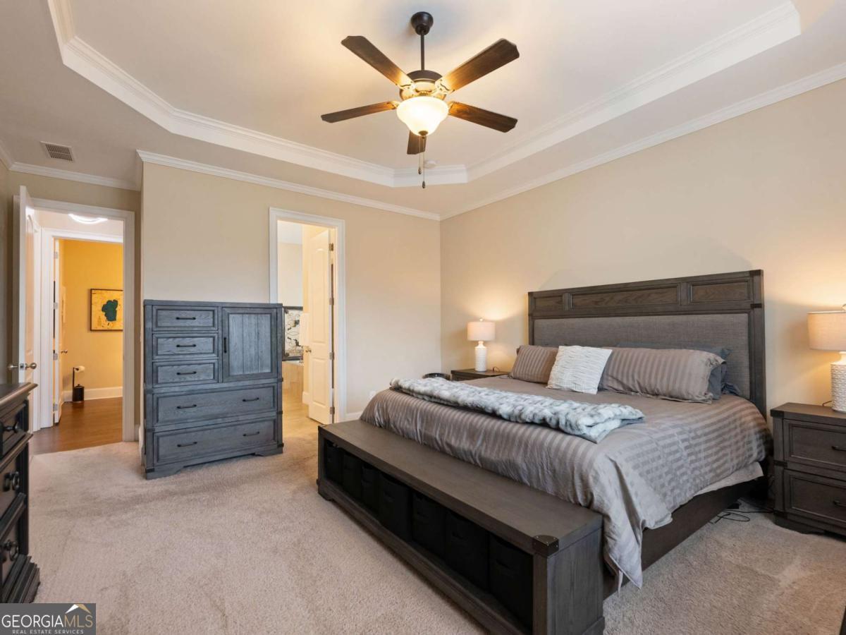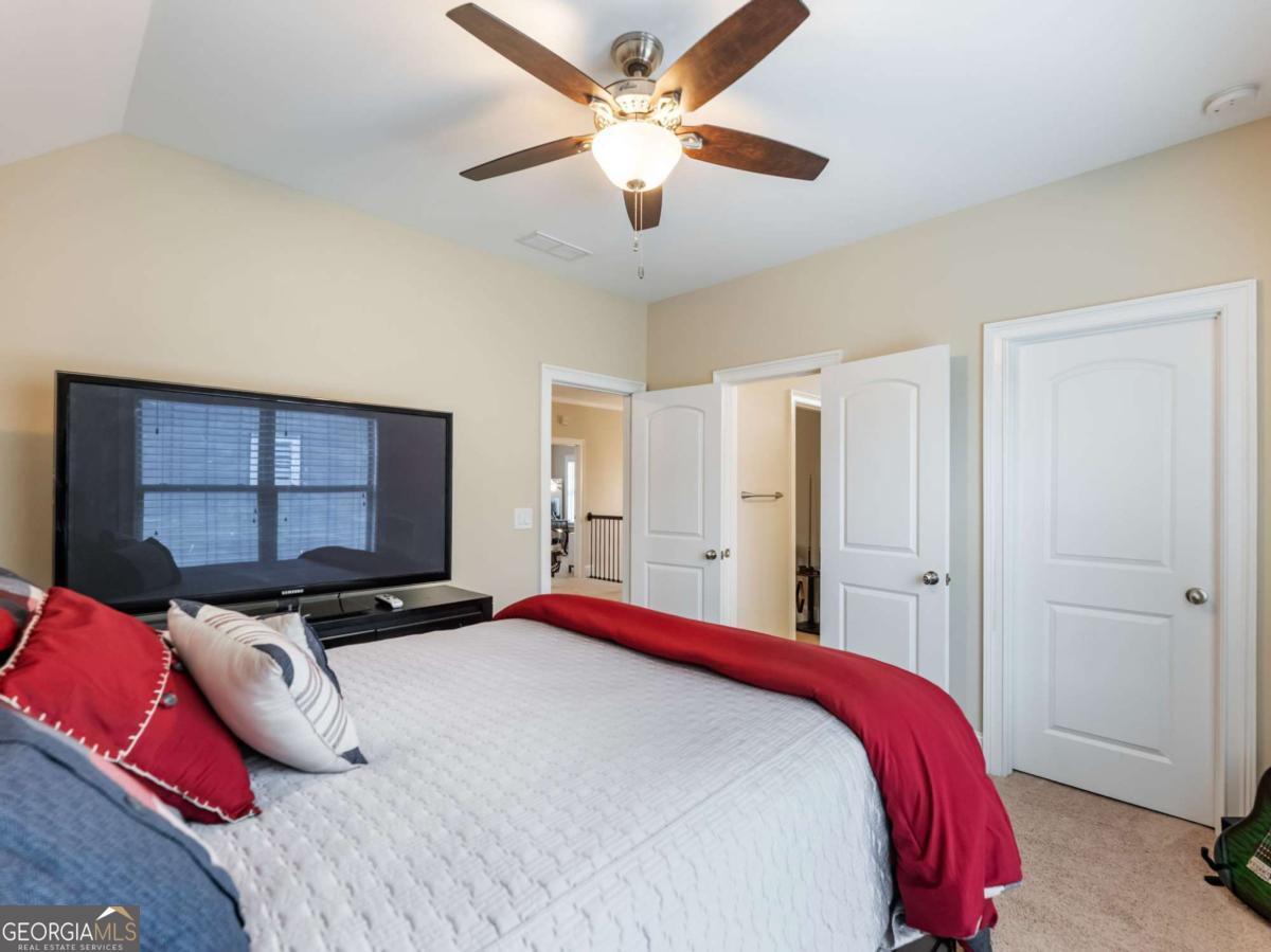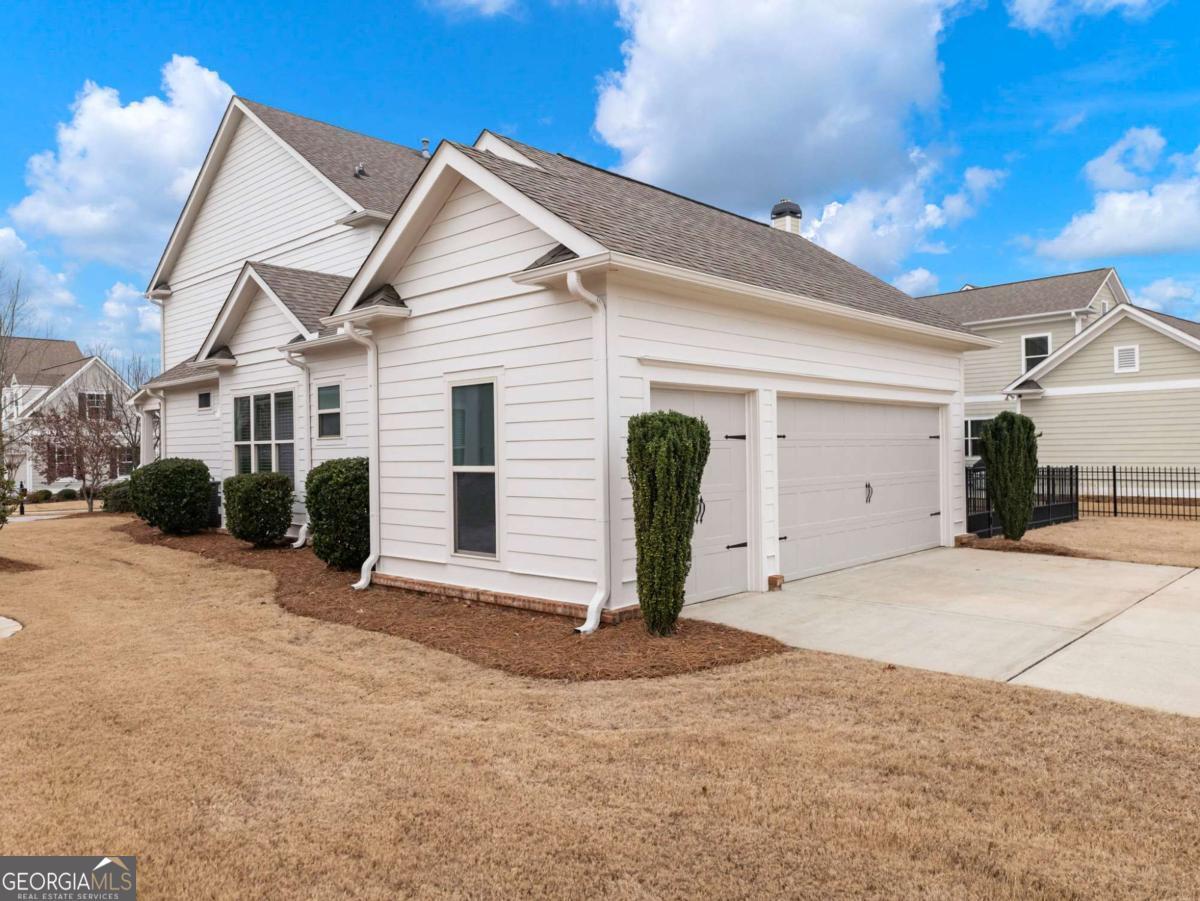 LOCATION, LOCATION, LOCATION in the gated golf community of Creekside Village at Chateau Elan. This home welcomes you with brick/siding, great curb appeal, a golf cart garage, and a fresh coat of paint. Step inside the two-story foyer to an open, light-filled floor plan with coffered ceilings. The kitchen has a large island, stainless steel appliances, breakfast area, and a dry bar. The primary suite is found on the main level, with a spa-inspired bath and an expansive walk-in closet. Upstairs are three additional bedrooms, two full baths, and a loft space. Outdoors, enjoy a level rear-fenced yard and patio. Yard maintenance is included with the HOA. Nearby shopping, restaurants, hospital, and schools.