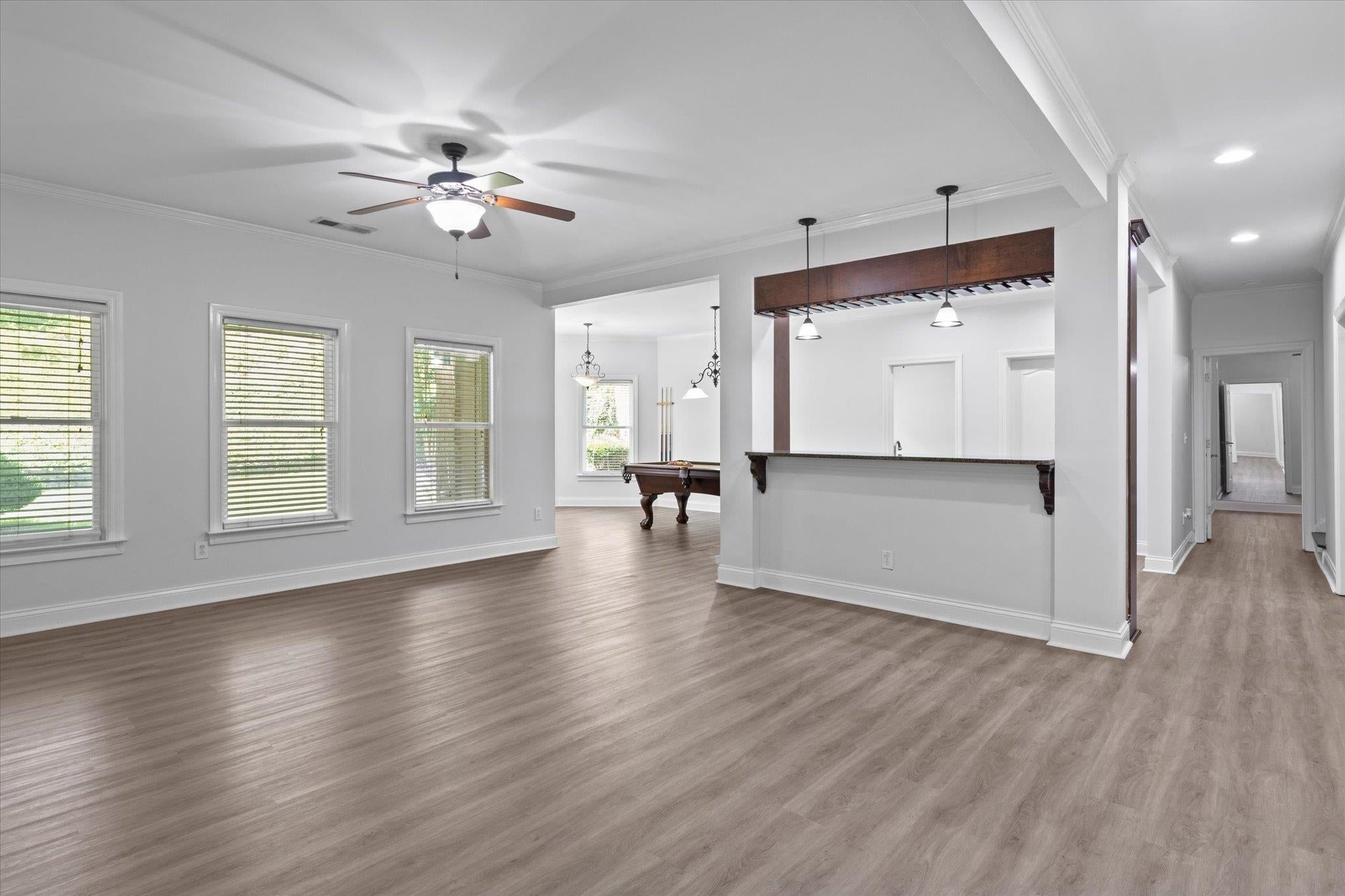 This is a rare opportunity to join Ellenwood's most prestigious community, Thurgood Estates. This stunning property features 6 bedrooms, 4.5 bathrooms, 2 BONUS rooms, finished basement with wet bar, pool table, and a theater. The French front doors welcome you into an open floor plan that connects your 2-story living room, formal dining room, eat-in kitchen, and study. The elegance continues into the master suite, which features a cozy sitting area with a fireplace, a luxurious master bathroom with a jetted soaking tub, a tiled shower, and a custom walk-in closet for all your storage needs. The finished basement is an entertainer's paradise, complete with a theater room, a pool table, a living room, and a wet bar-plus an additional fireplace that adds warmth and ambiance. Step outside to relax or entertain on the expansive deck or covered patio, and enjoy ample parking and storage in the 3-car garage. Minutes from the highway, parks, and restaurants.