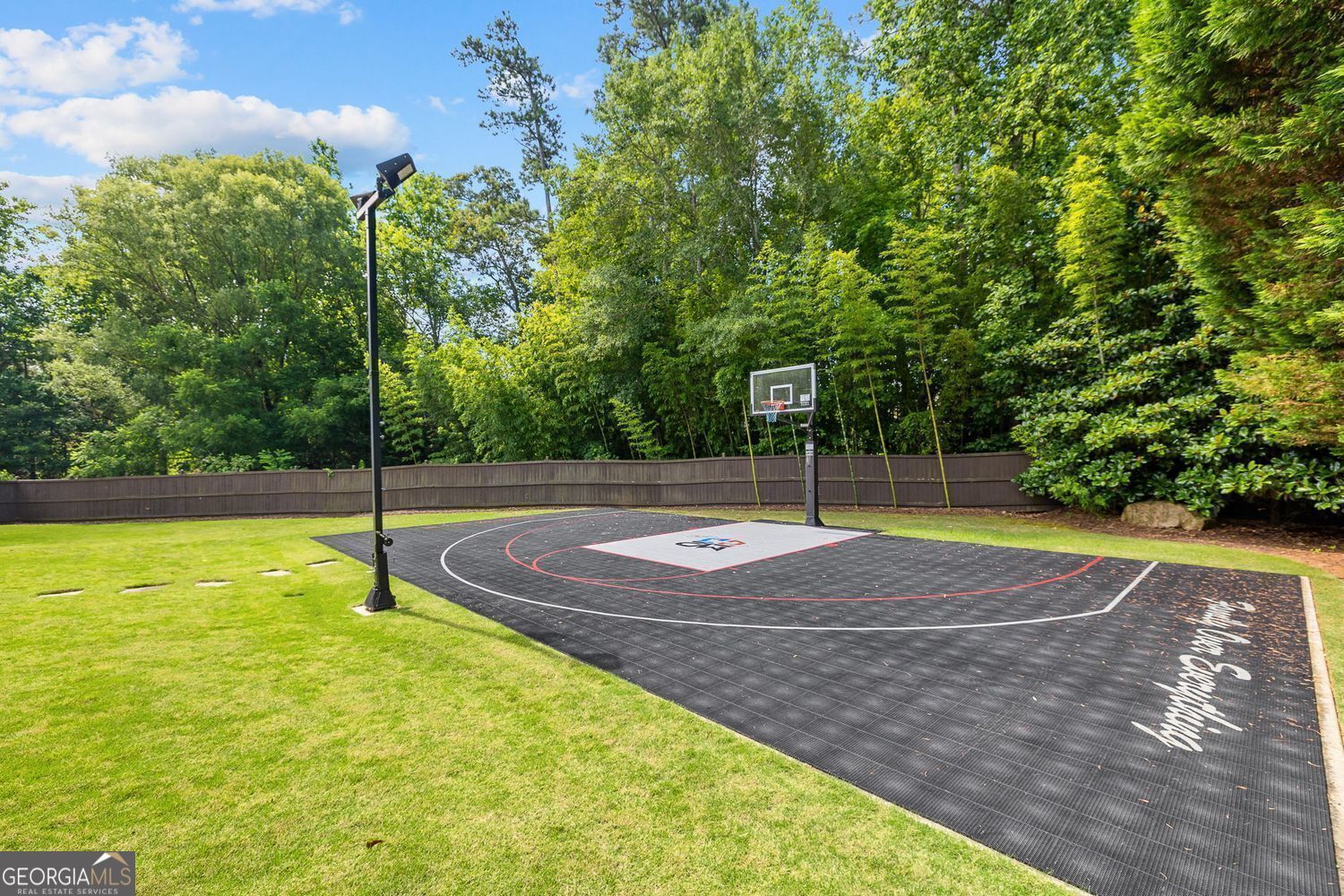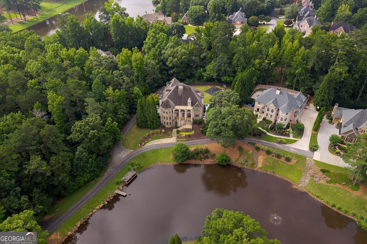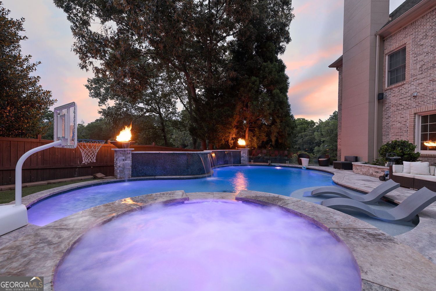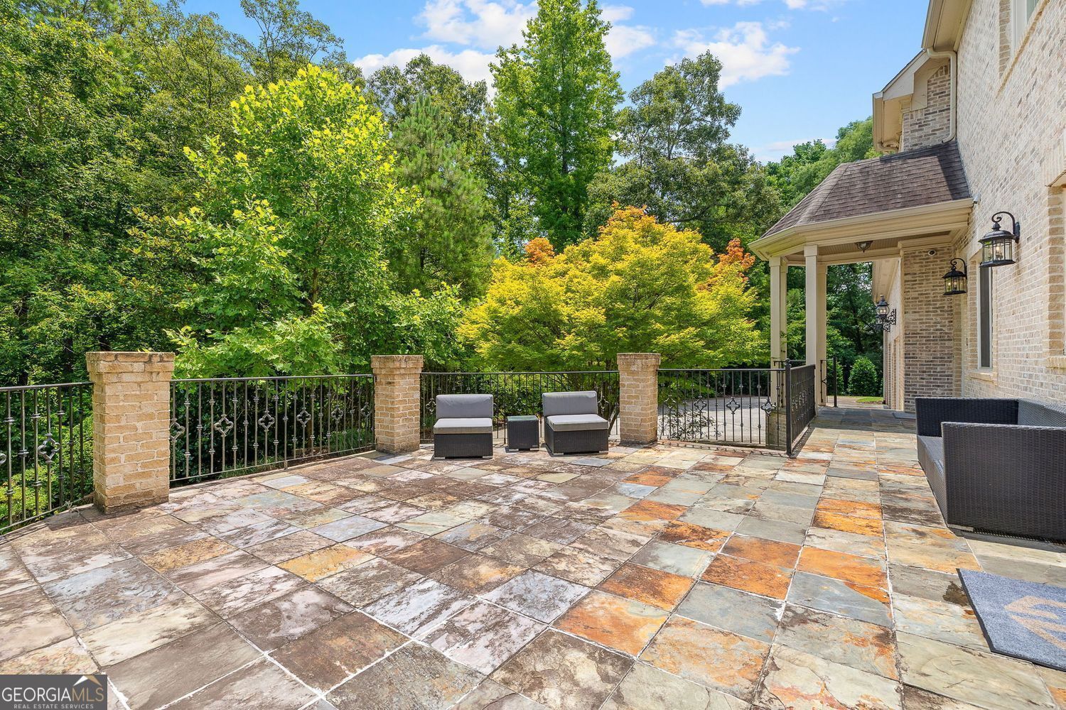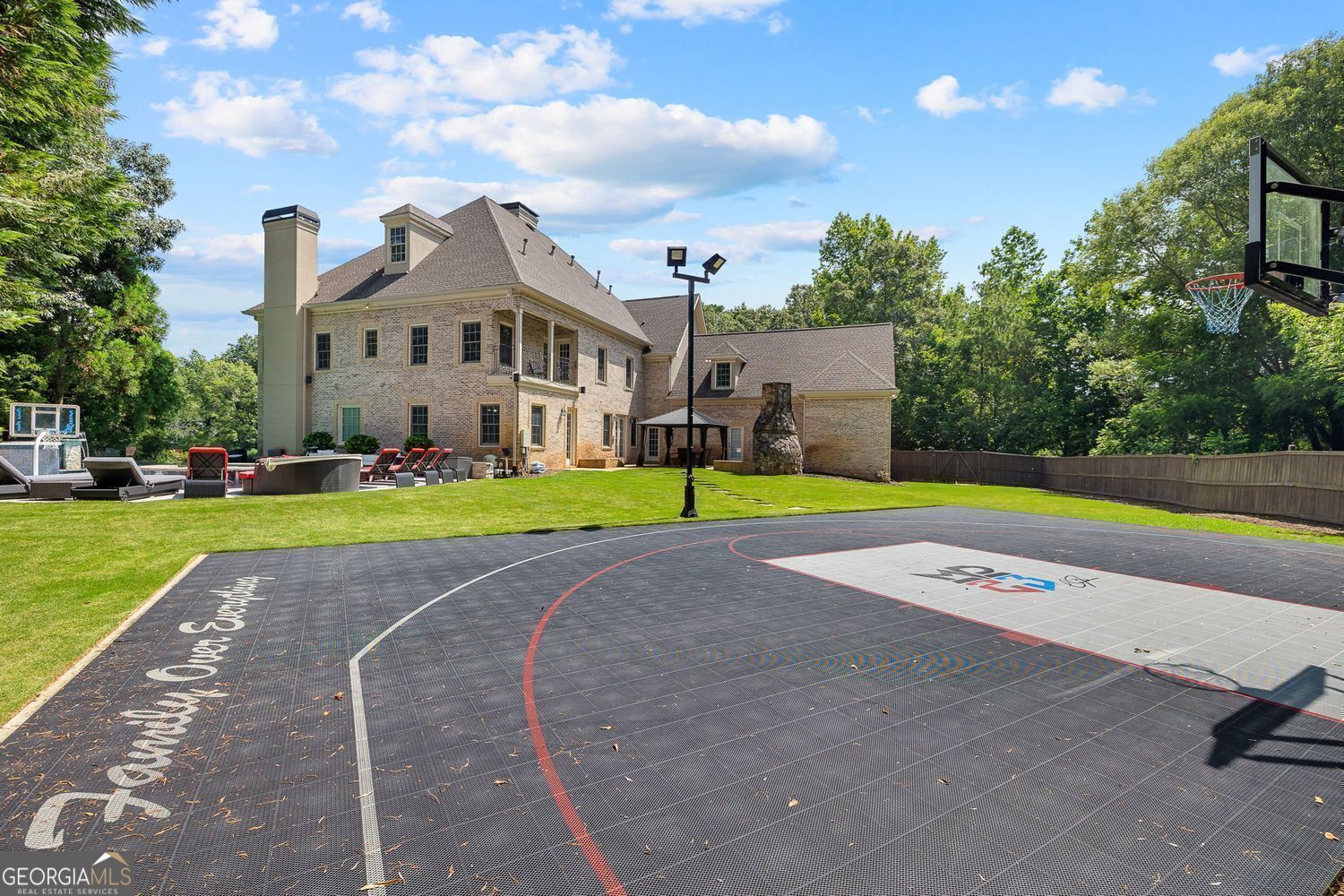 Experience luxury living in this exquisite Roswell estate, thoughtfully designed for both elegant entertaining and everyday comfort. Situated on a private 1.2-acre lot, the backyard oasis features a heated saltwater pool and spa, a lighted basketball court, and expansive stone patios-ideal for alfresco dining and outdoor relaxation. Inside, an open-concept layout is enhanced by soaring ceilings, intricate millwork, and multiple fireplaces that add warmth and character throughout. The gourmet kitchen flows seamlessly into a fireside keeping room and casual dining area, while formal living and dining spaces offer the perfect setting for hosting guests in style. The richly appointed, wood-paneled library features coffered ceilings, built-in shelving, and a fireplace-ideal as a refined home office or reading retreat. The spacious primary suite impresses with a spa-inspired bath, oversized walk-in closet, and a private balcony overlooking the serene grounds. The finished terrace level expands the home's livable space with a home gym, full bar, and state-of-the-art theater. An additional guest suite includes its own kitchen, sitting area, laundry, and private bath-perfect for multi-generational living or long-term guests. Ideally located in a peaceful Roswell enclave with convenient access to top-rated schools, shopping, and dining, this timeless estate offers the ultimate blend of luxury, comfort, and lifestyle.