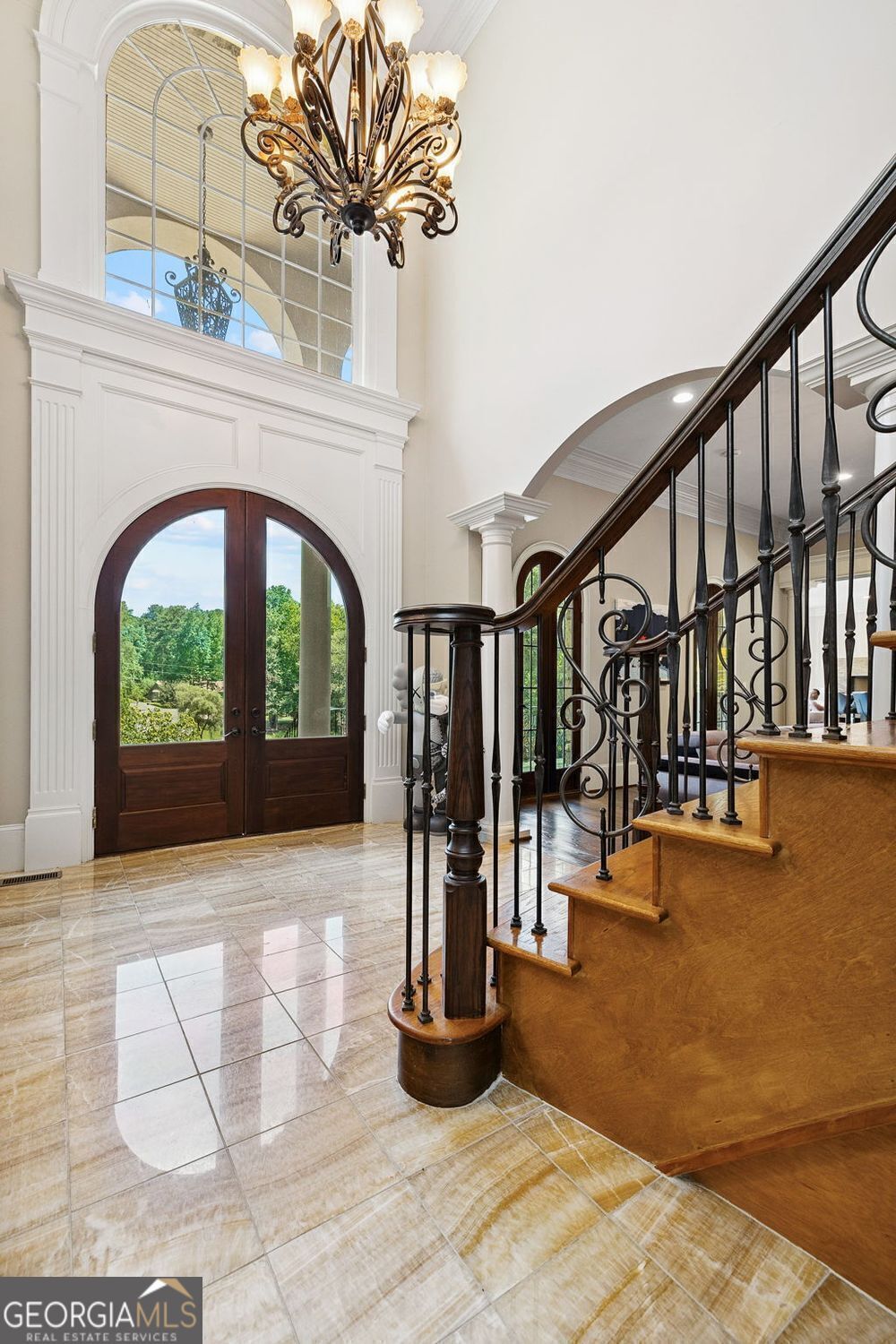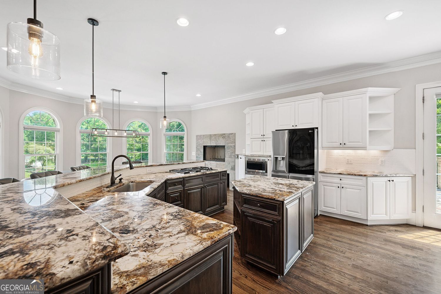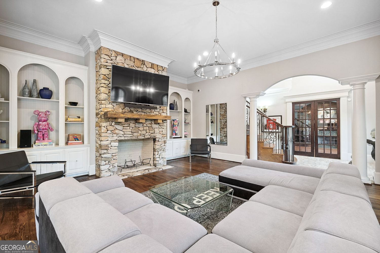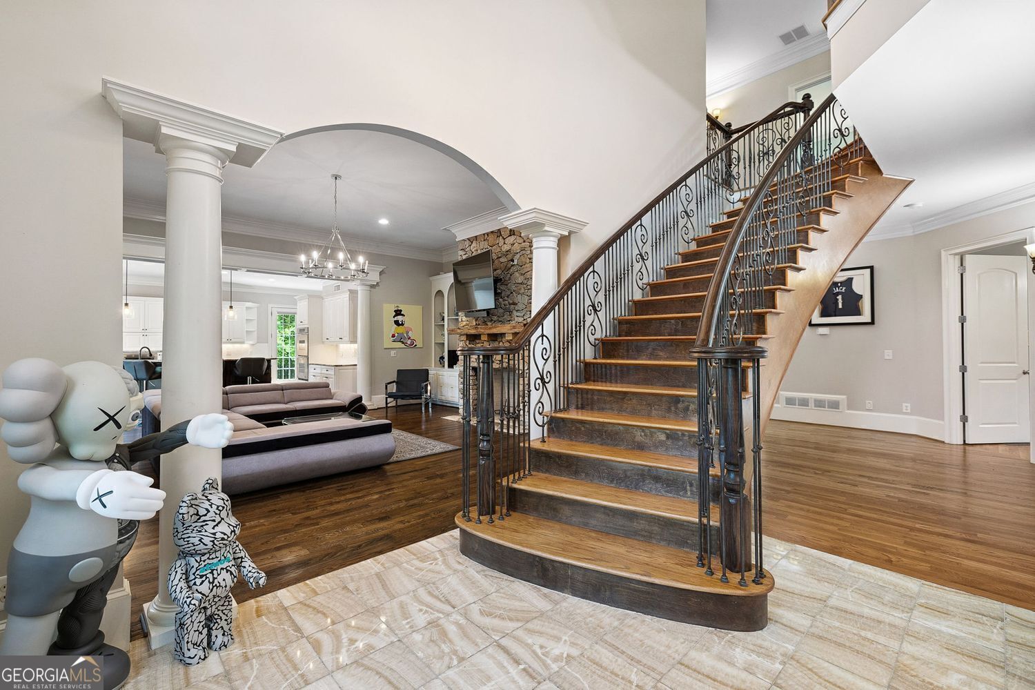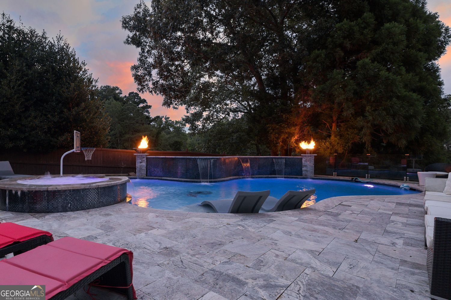 Experience luxury living in this exquisite Roswell estate, thoughtfully designed for both elegant entertaining and everyday comfort. Situated on a private 1.2-acre lot, the backyard oasis features a heated saltwater pool and spa, a lighted basketball court, and expansive stone patios-ideal for alfresco dining and outdoor relaxation. Inside, an open-concept layout is enhanced by soaring ceilings, intricate millwork, and multiple fireplaces that add warmth and character throughout. The gourmet kitchen flows seamlessly into a fireside keeping room and casual dining area, while formal living and dining spaces offer the perfect setting for hosting guests in style. The richly appointed, wood-paneled library features coffered ceilings, built-in shelving, and a fireplace-ideal as a refined home office or reading retreat. The spacious primary suite impresses with a spa-inspired bath, oversized walk-in closet, and a private balcony overlooking the serene grounds. The finished terrace level expands the home's livable space with a home gym, full bar, and state-of-the-art theater. An additional guest suite includes its own kitchen, sitting area, laundry, and private bath-perfect for multi-generational living or long-term guests. Ideally located in a peaceful Roswell enclave with convenient access to top-rated schools, shopping, and dining, this timeless estate offers the ultimate blend of luxury, comfort, and lifestyle.