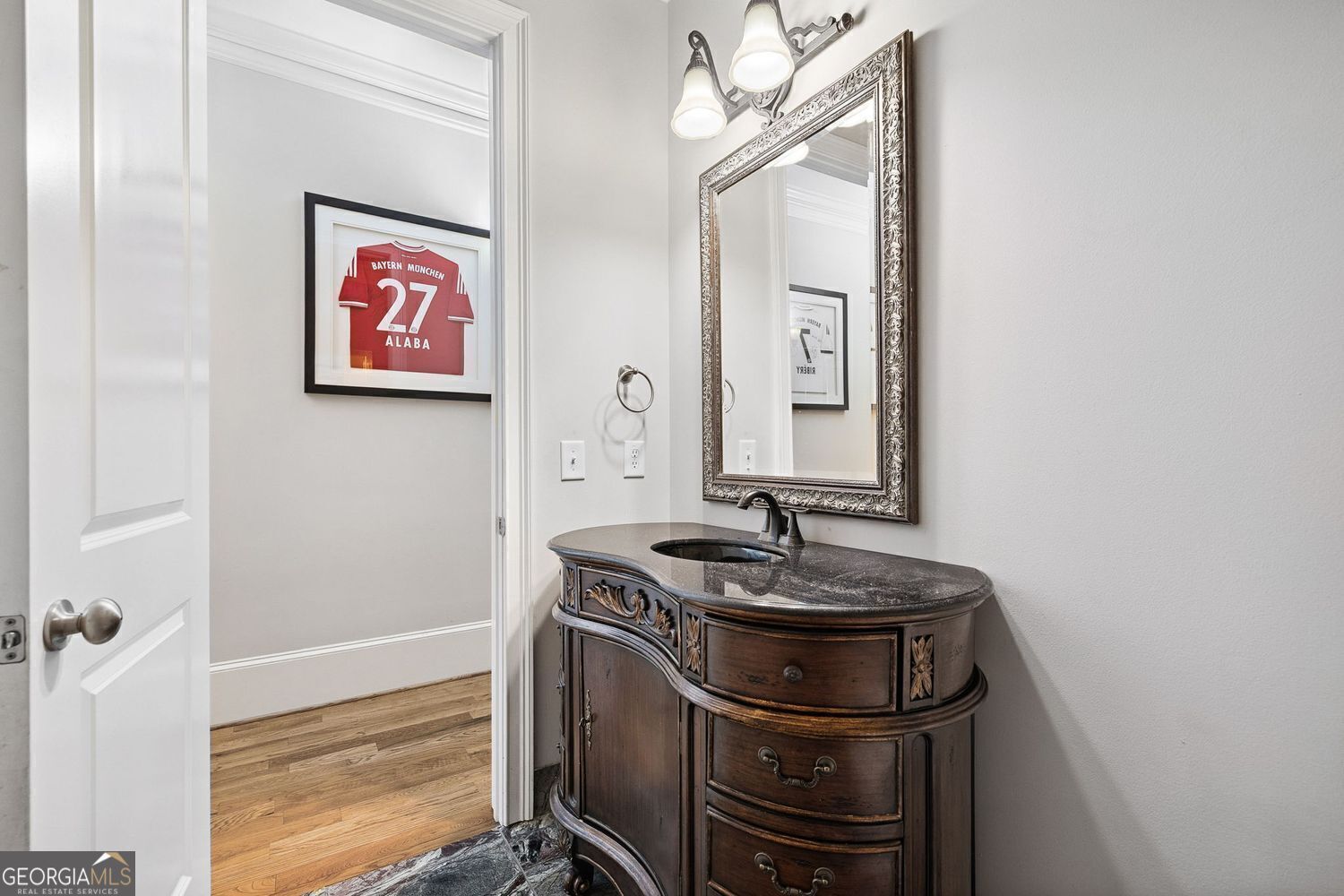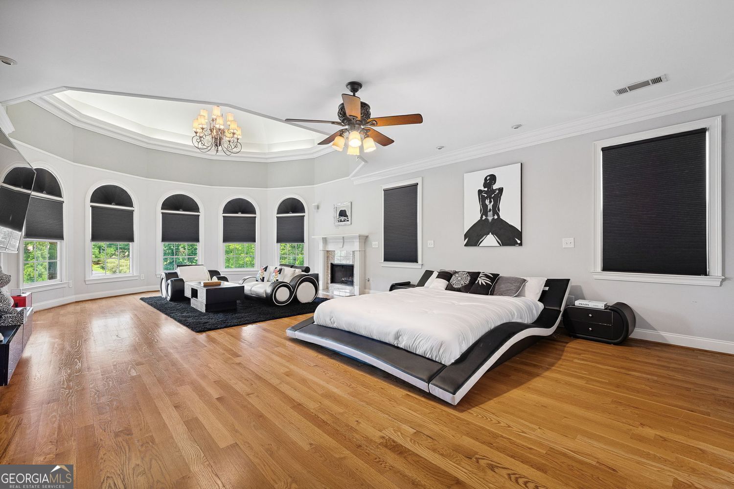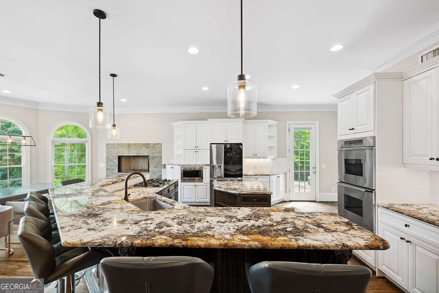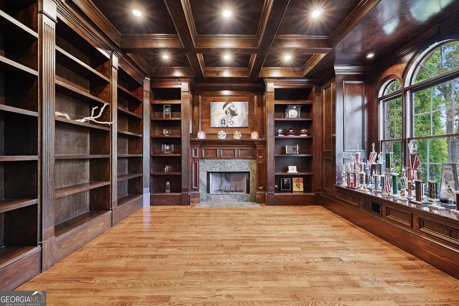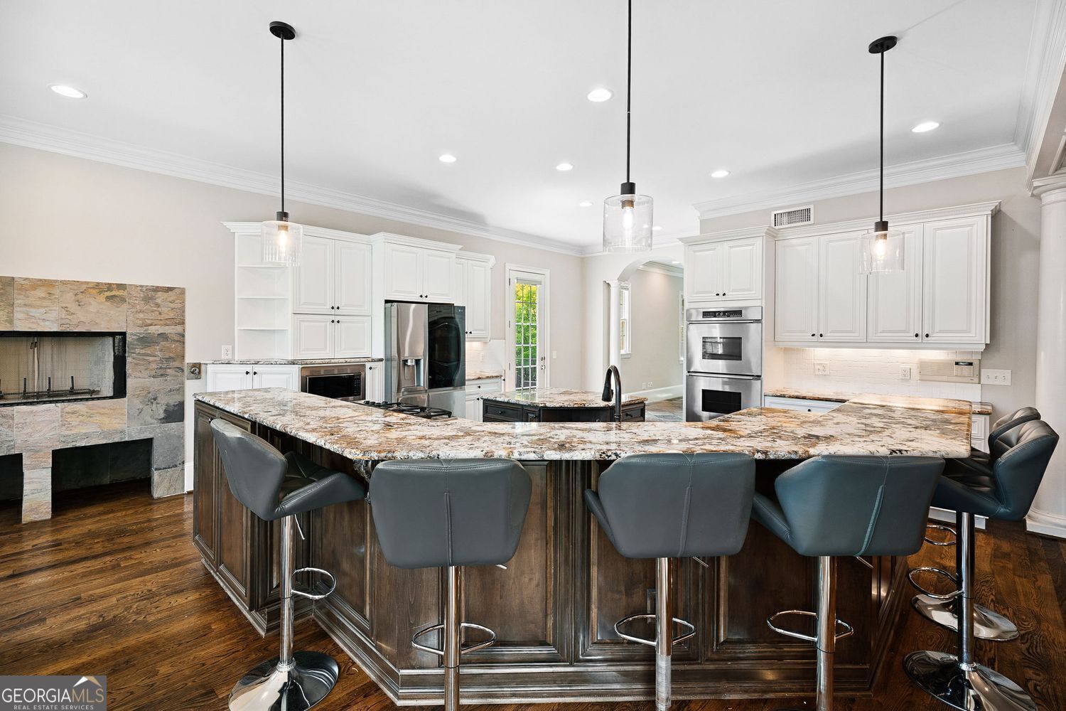 Experience luxury living in this exquisite Roswell estate, thoughtfully designed for both elegant entertaining and everyday comfort. Situated on a private 1.2-acre lot, the backyard oasis features a heated saltwater pool and spa, a lighted basketball court, and expansive stone patios-ideal for alfresco dining and outdoor relaxation. Inside, an open-concept layout is enhanced by soaring ceilings, intricate millwork, and multiple fireplaces that add warmth and character throughout. The gourmet kitchen flows seamlessly into a fireside keeping room and casual dining area, while formal living and dining spaces offer the perfect setting for hosting guests in style. The richly appointed, wood-paneled library features coffered ceilings, built-in shelving, and a fireplace-ideal as a refined home office or reading retreat. The spacious primary suite impresses with a spa-inspired bath, oversized walk-in closet, and a private balcony overlooking the serene grounds. The finished terrace level expands the home's livable space with a home gym, full bar, and state-of-the-art theater. An additional guest suite includes its own kitchen, sitting area, laundry, and private bath-perfect for multi-generational living or long-term guests. Ideally located in a peaceful Roswell enclave with convenient access to top-rated schools, shopping, and dining, this timeless estate offers the ultimate blend of luxury, comfort, and lifestyle.